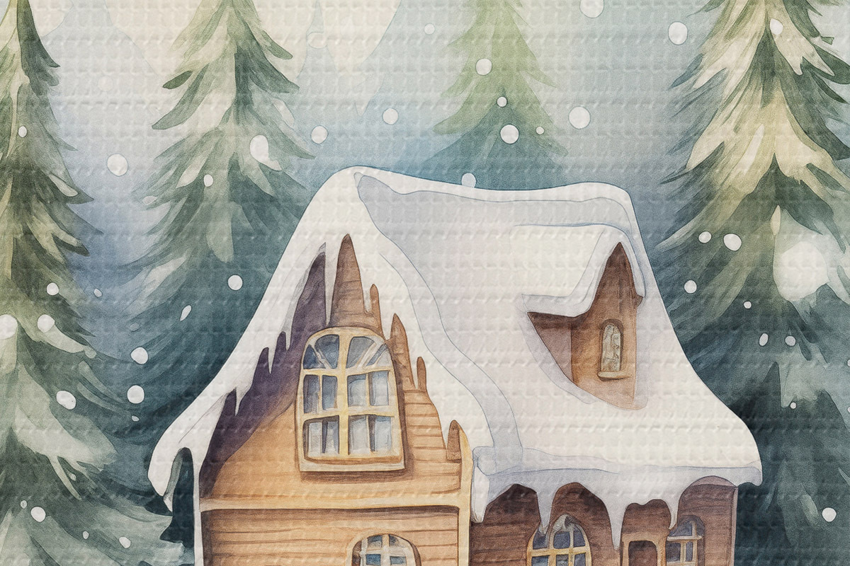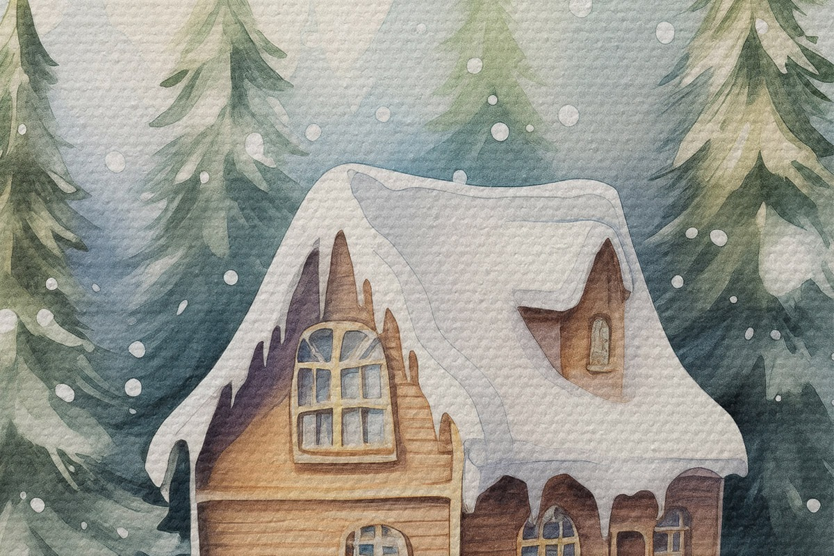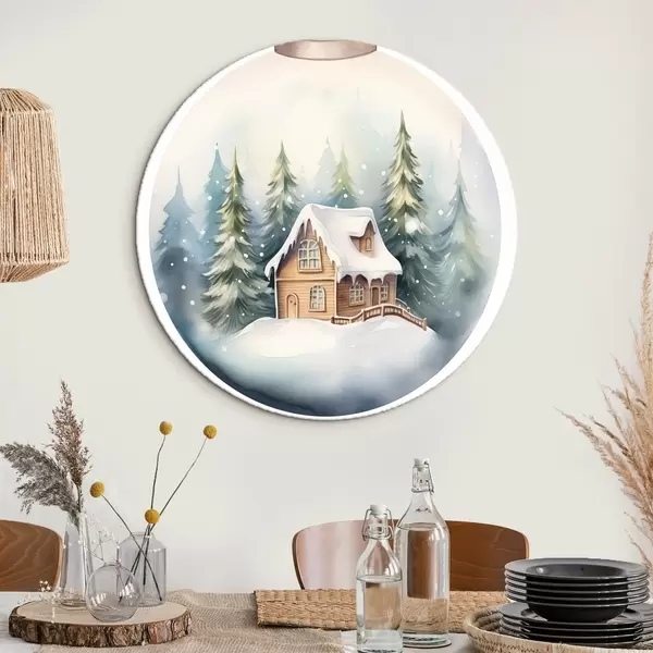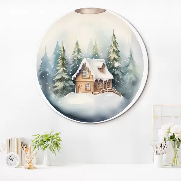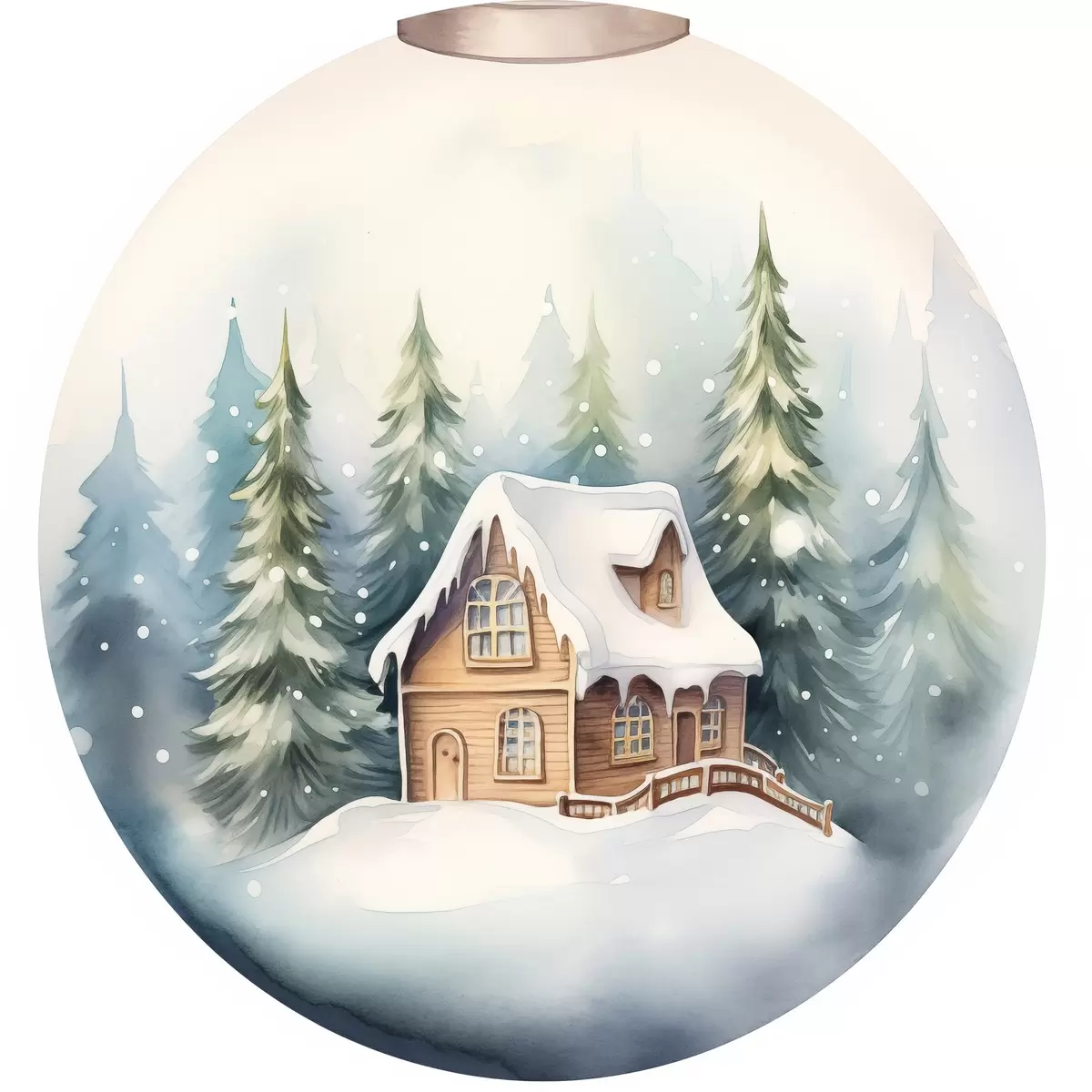 Attēls Akvareļu kristāla bumba ar ziemas ainavu, māja mežā, sniegs Nr r41366