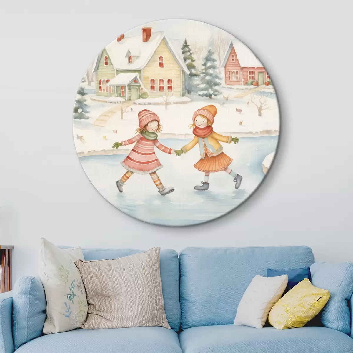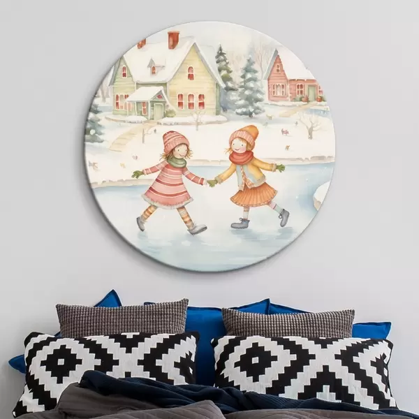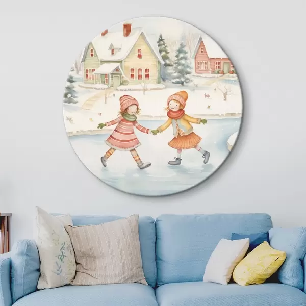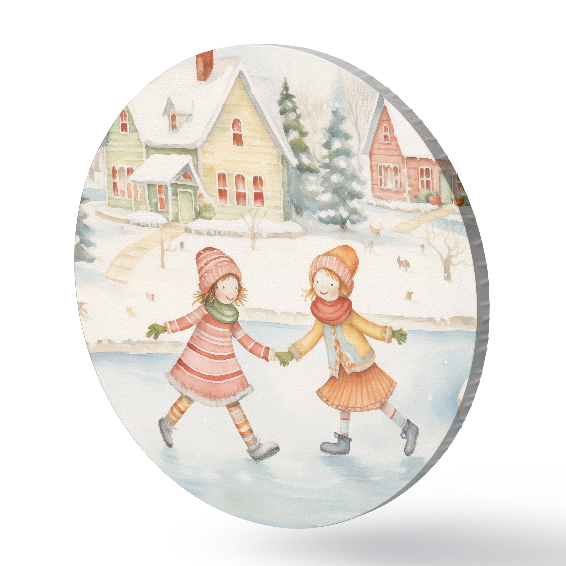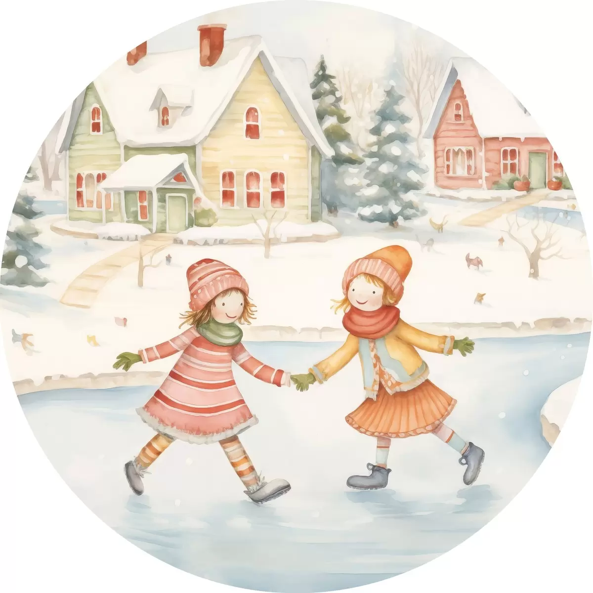 Attēls Ziemas aina ar divām meitenēm, kas slido, ziemas pilsēta, mājas, mežs Nr r41377