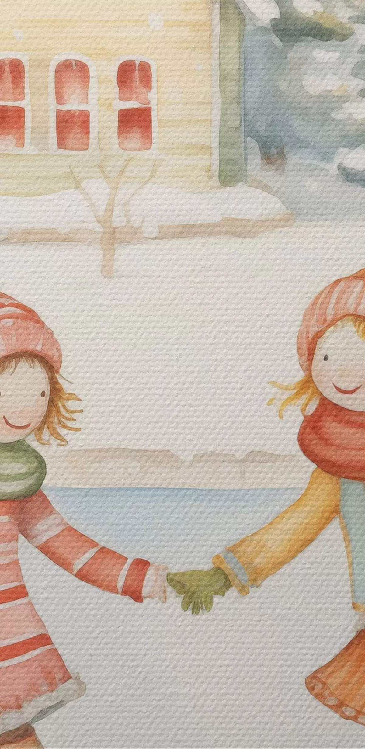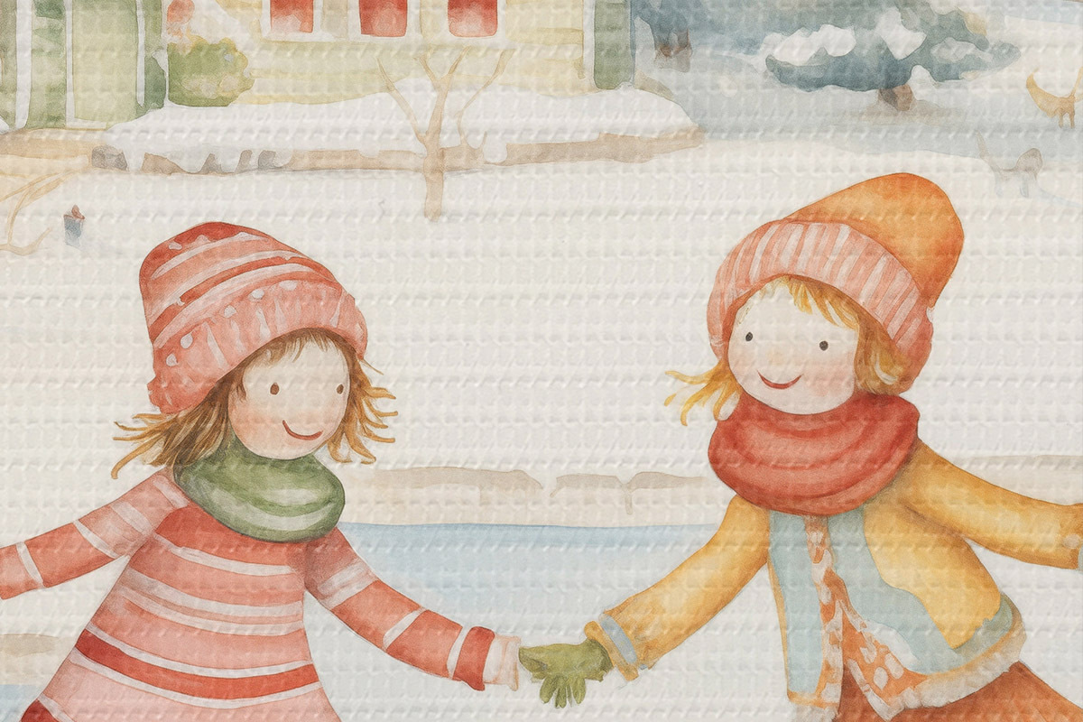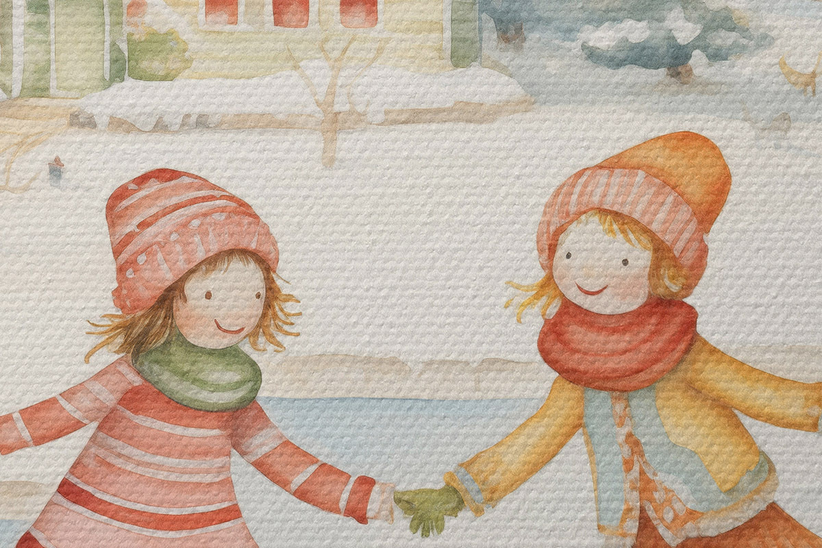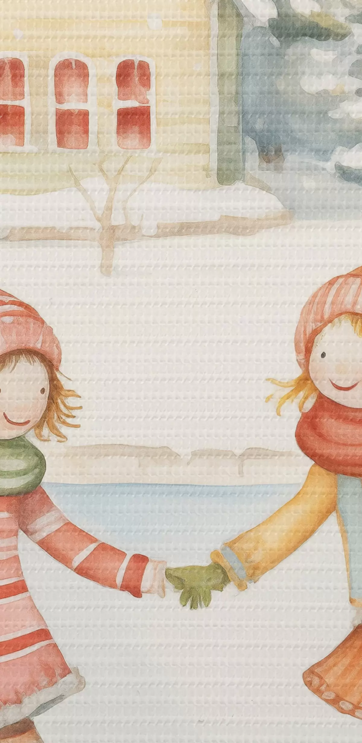 Attēls Ziemas aina ar divām meitenēm, kas slido, ziemas pilsēta, mājas, mežs Nr r41377