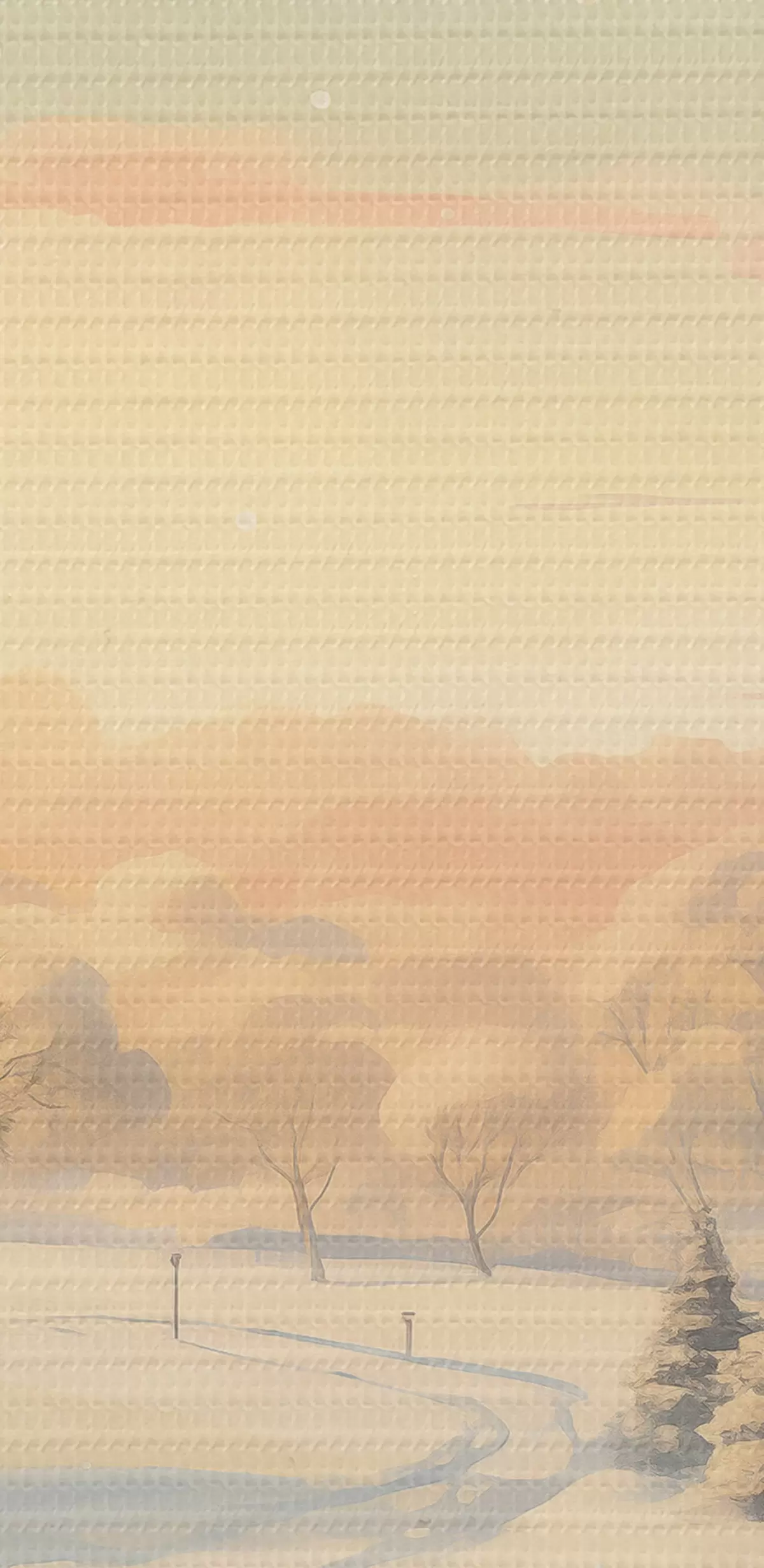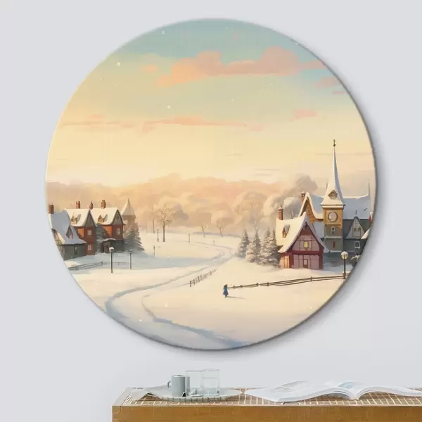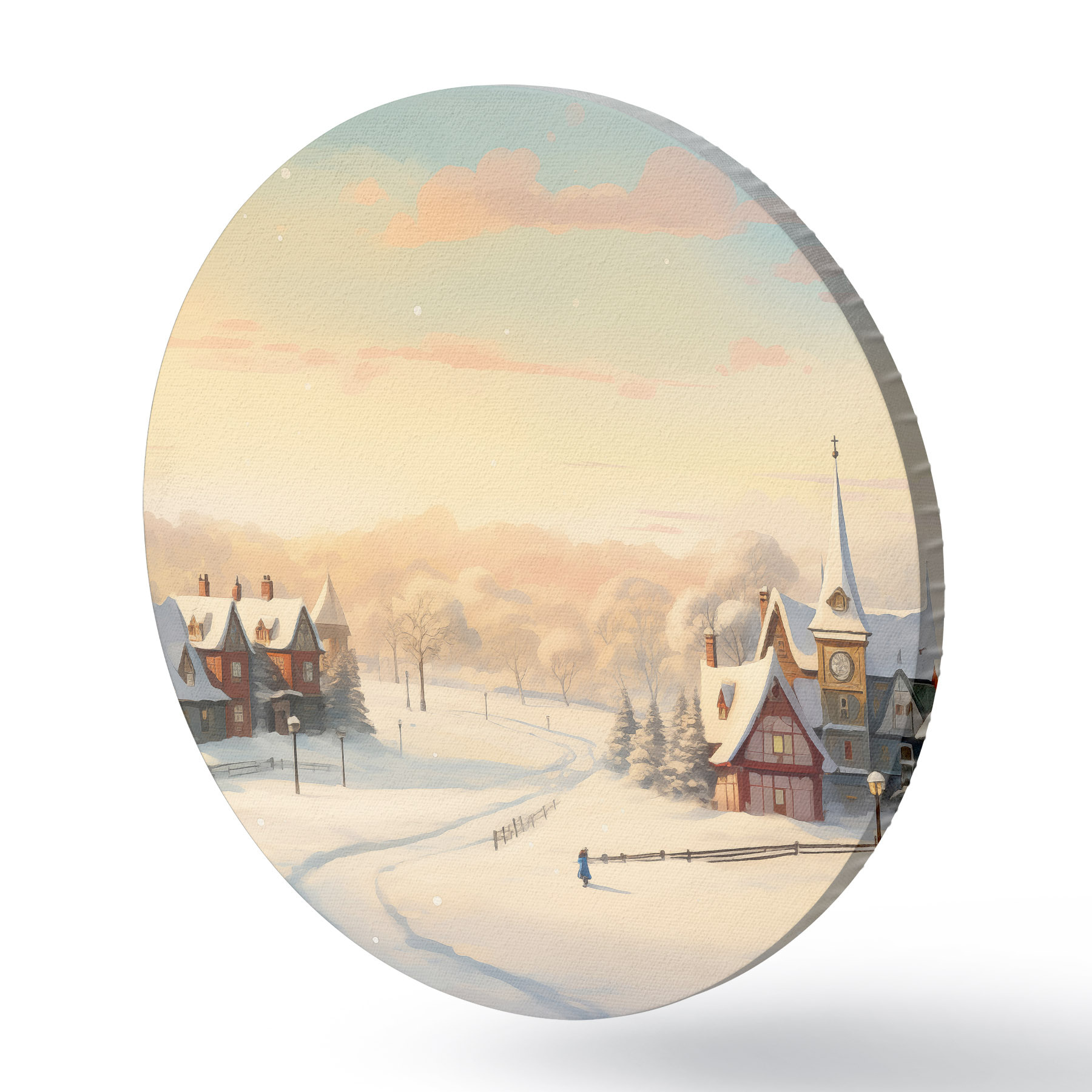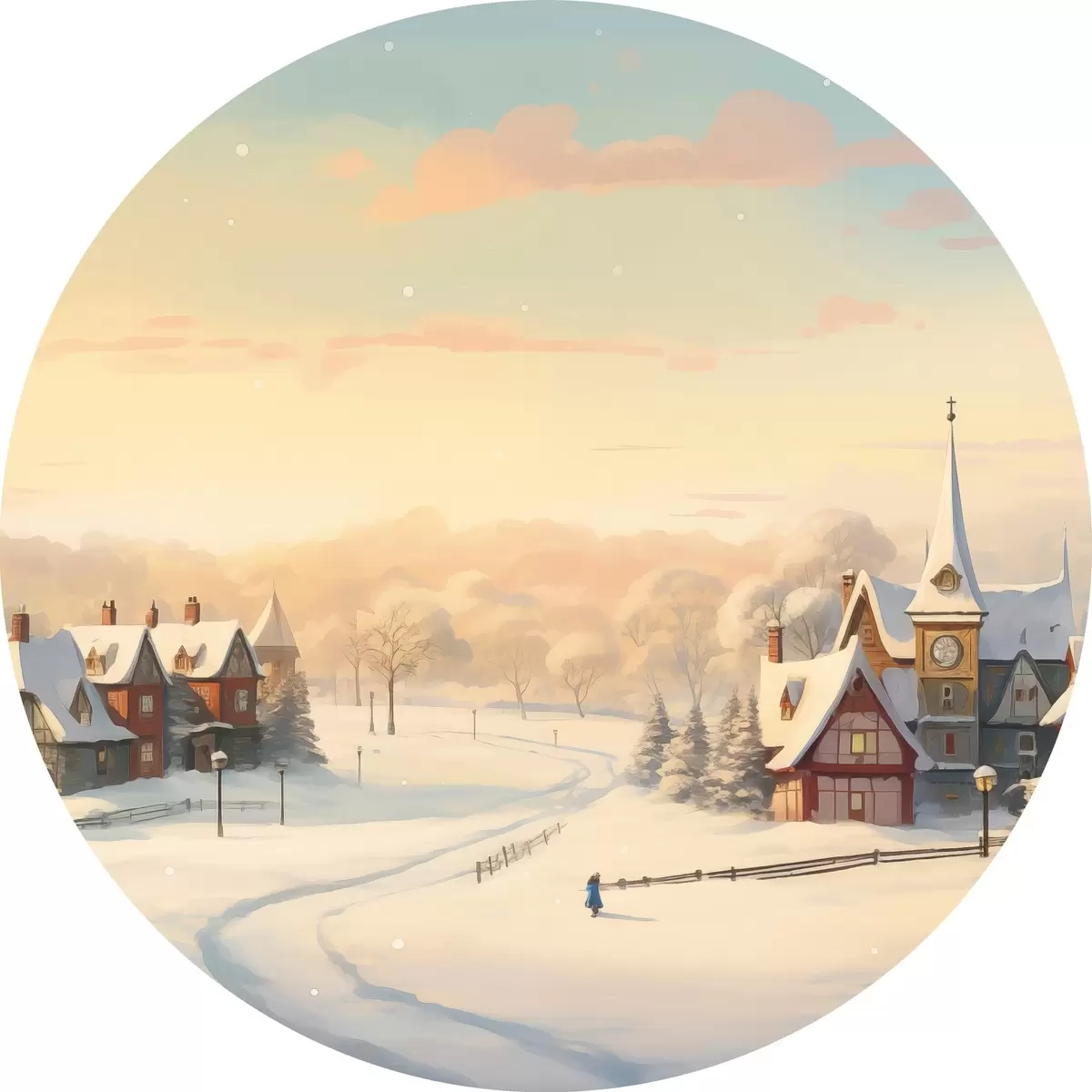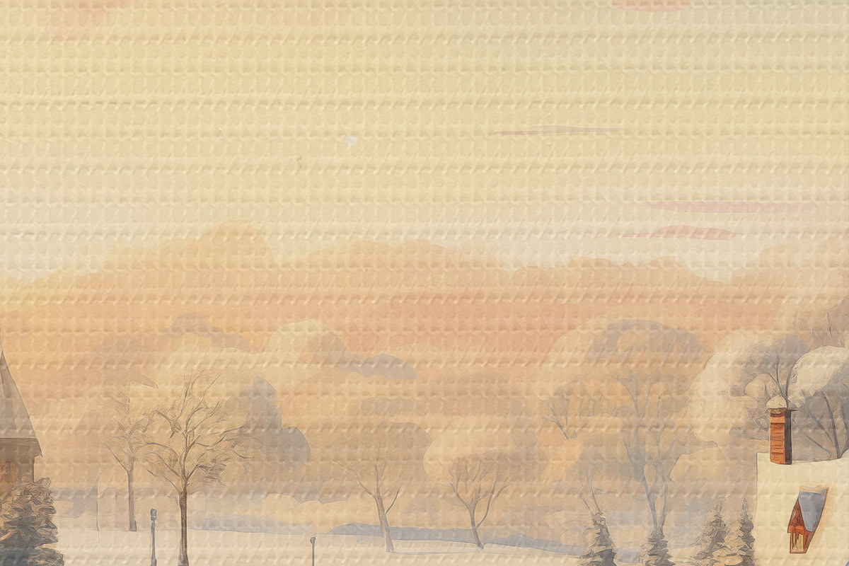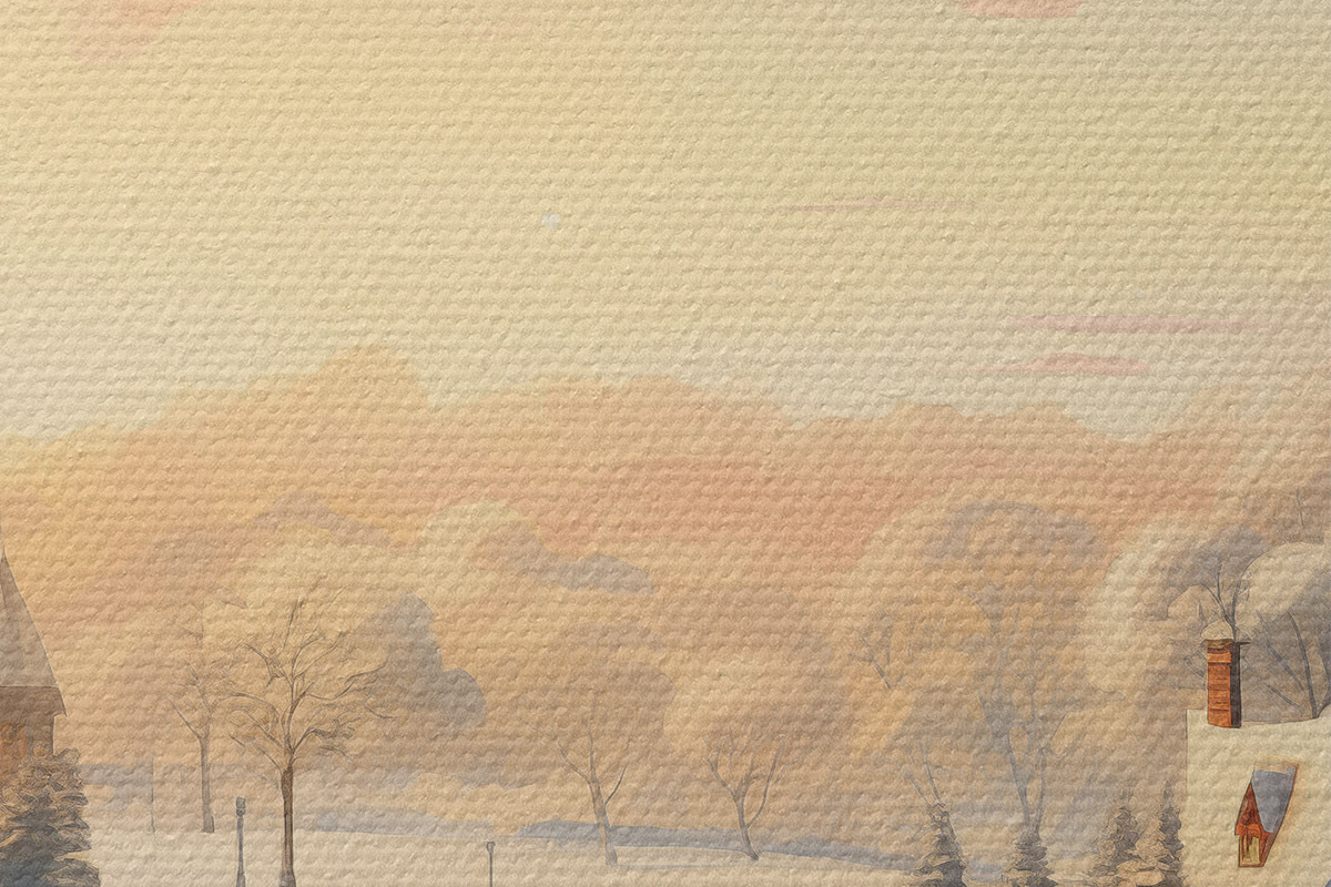 Attēls Ziemas brīnumu zeme, mājas, saulrieta debesis, koki, akvarelis Nr r41383