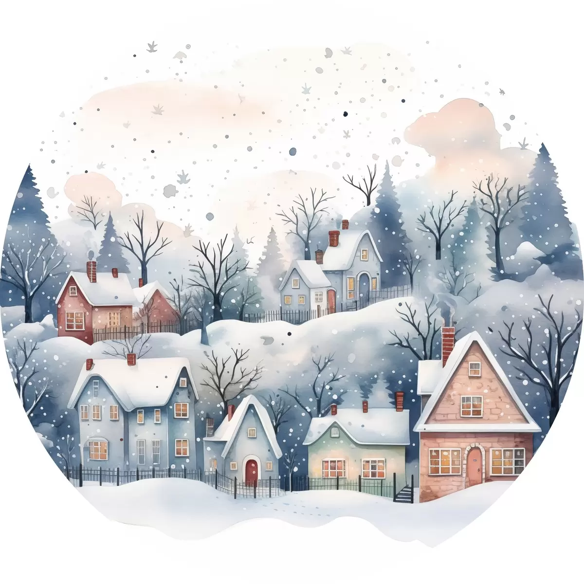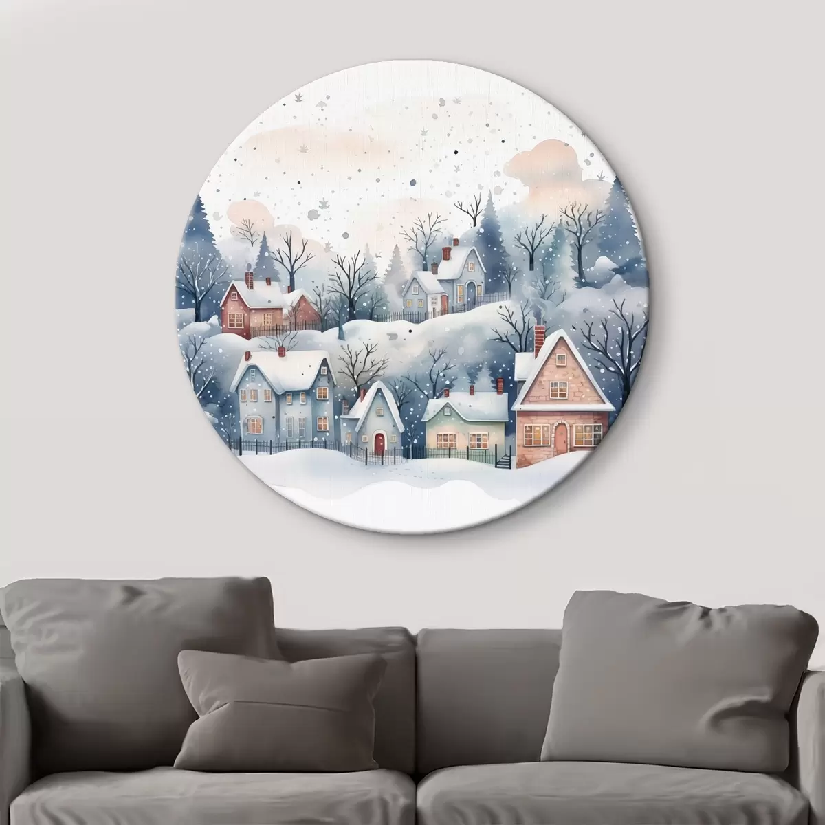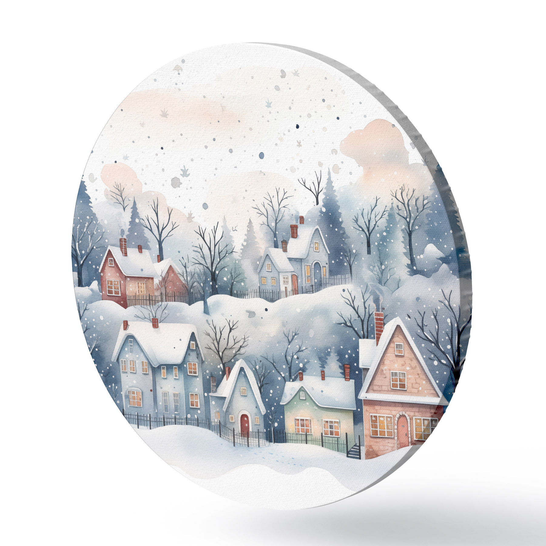Apaļas gleznas Akvareļu ziemas ainava ar mājām un priežu mežu r41389