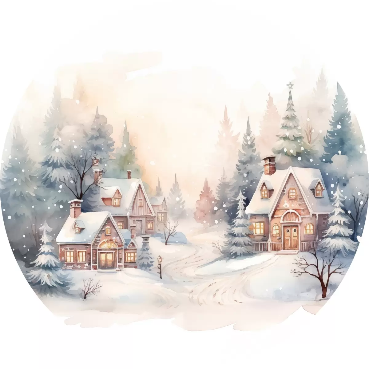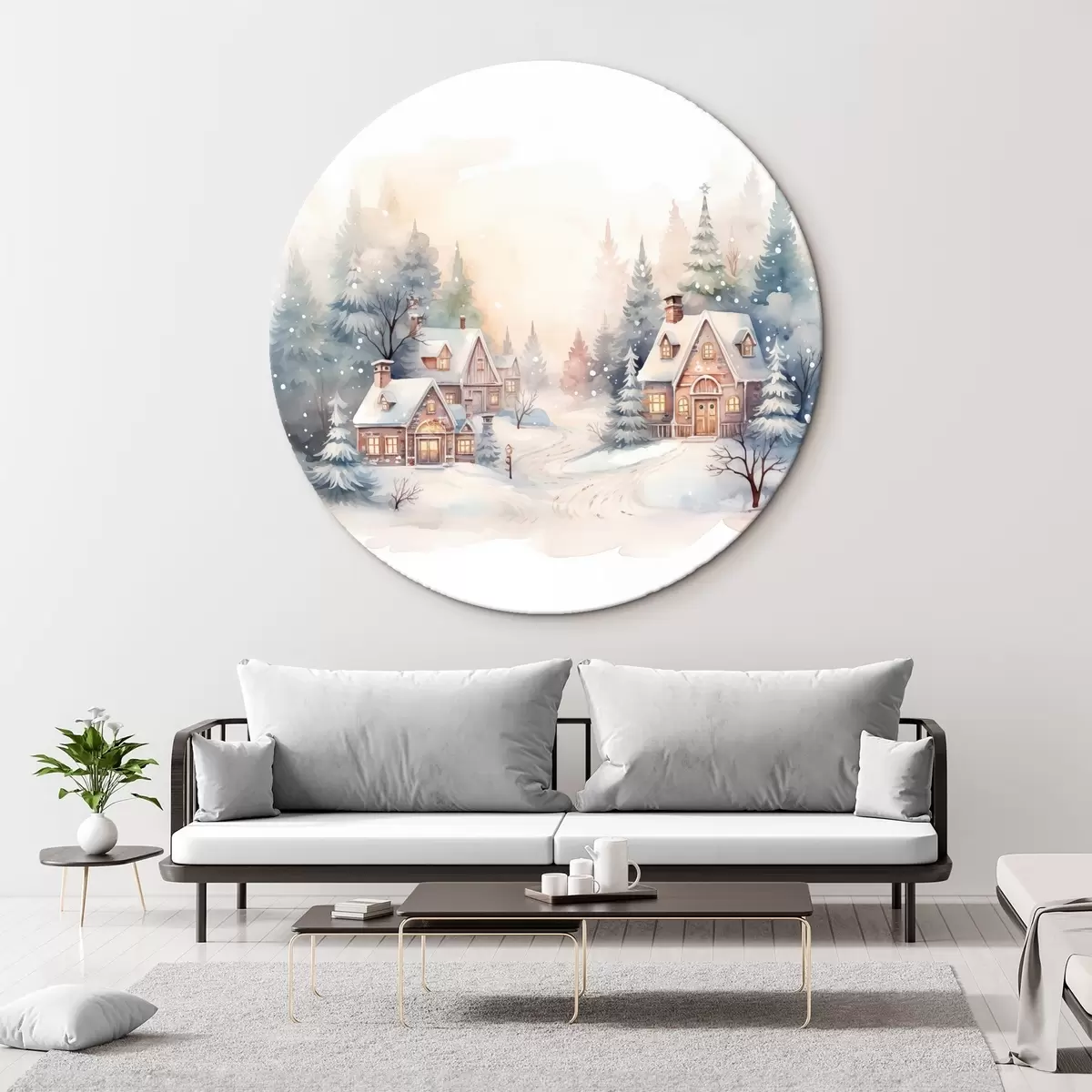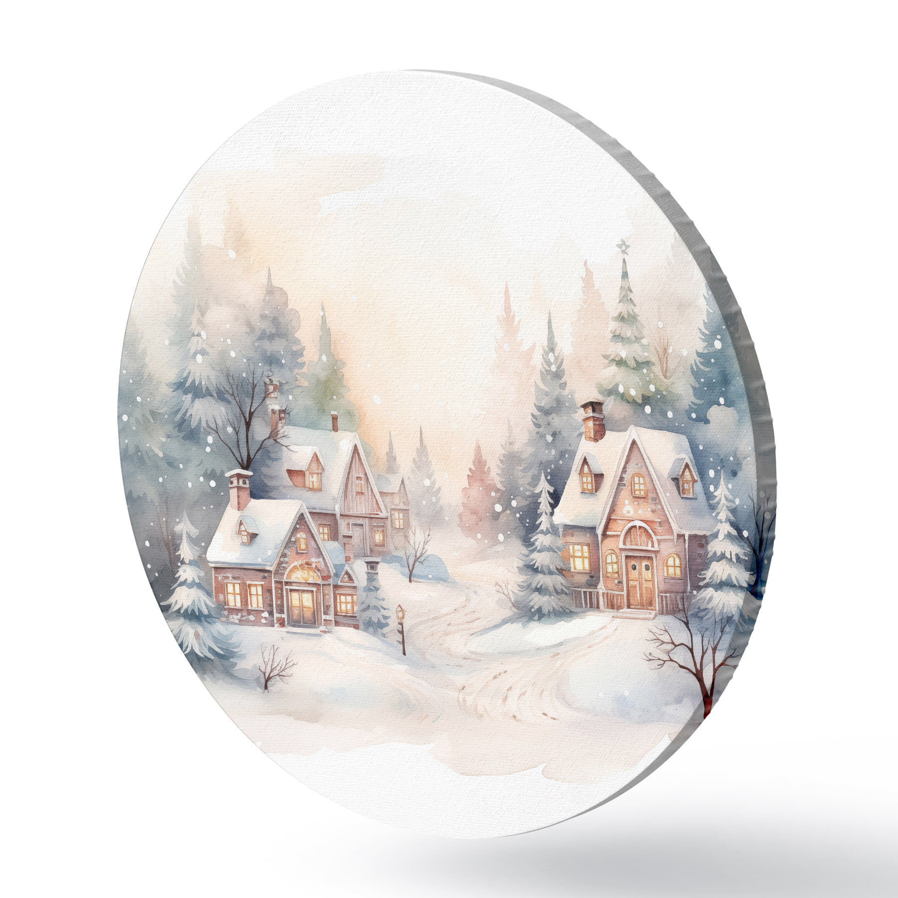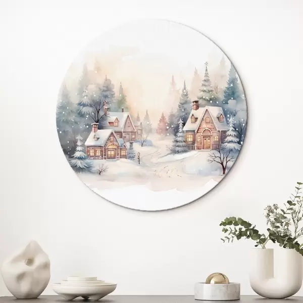 Apaļas gleznas Ziemas ainava, priežu mežs, skaistas mājas, akvarelis, susnets r41390