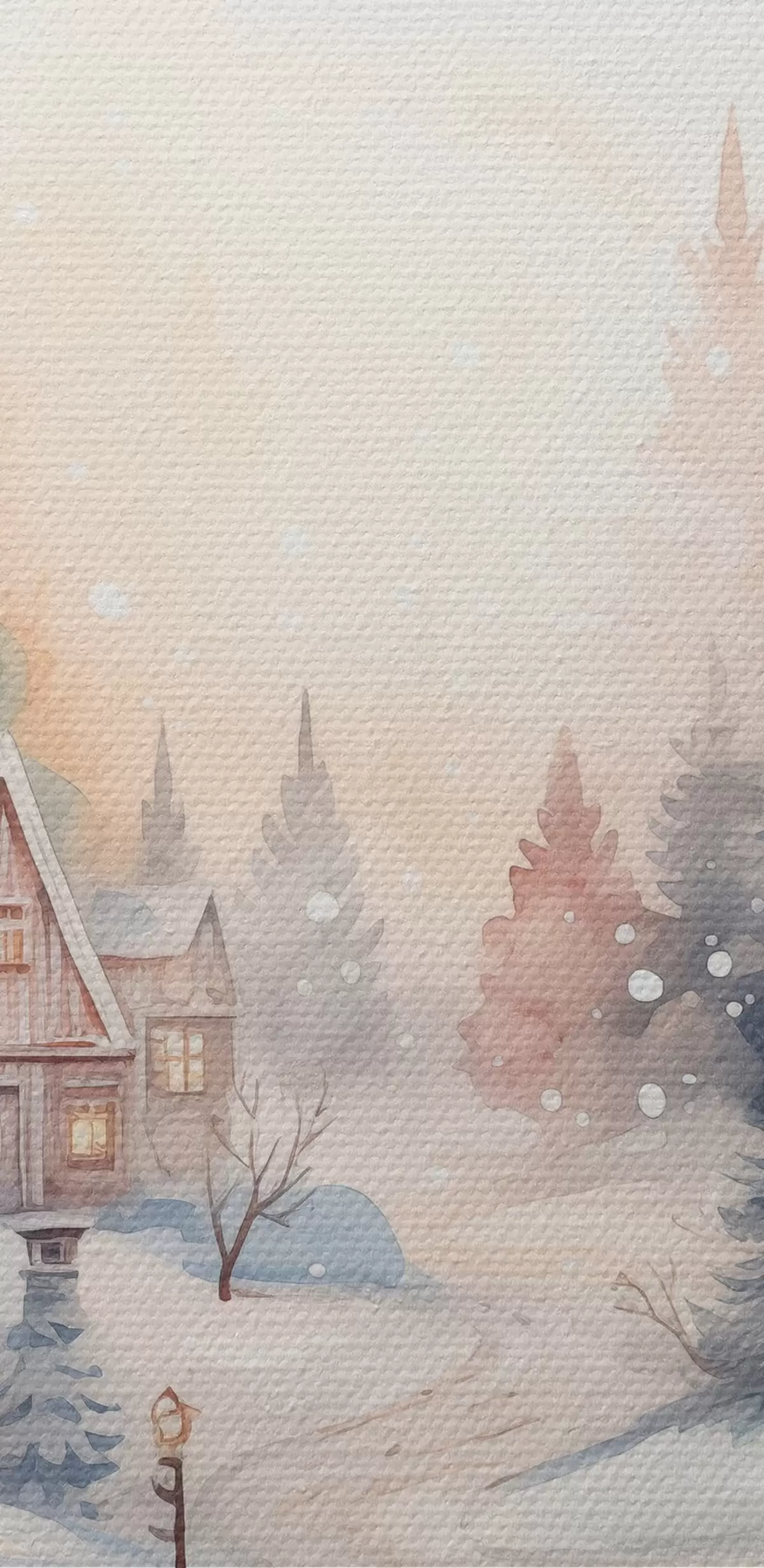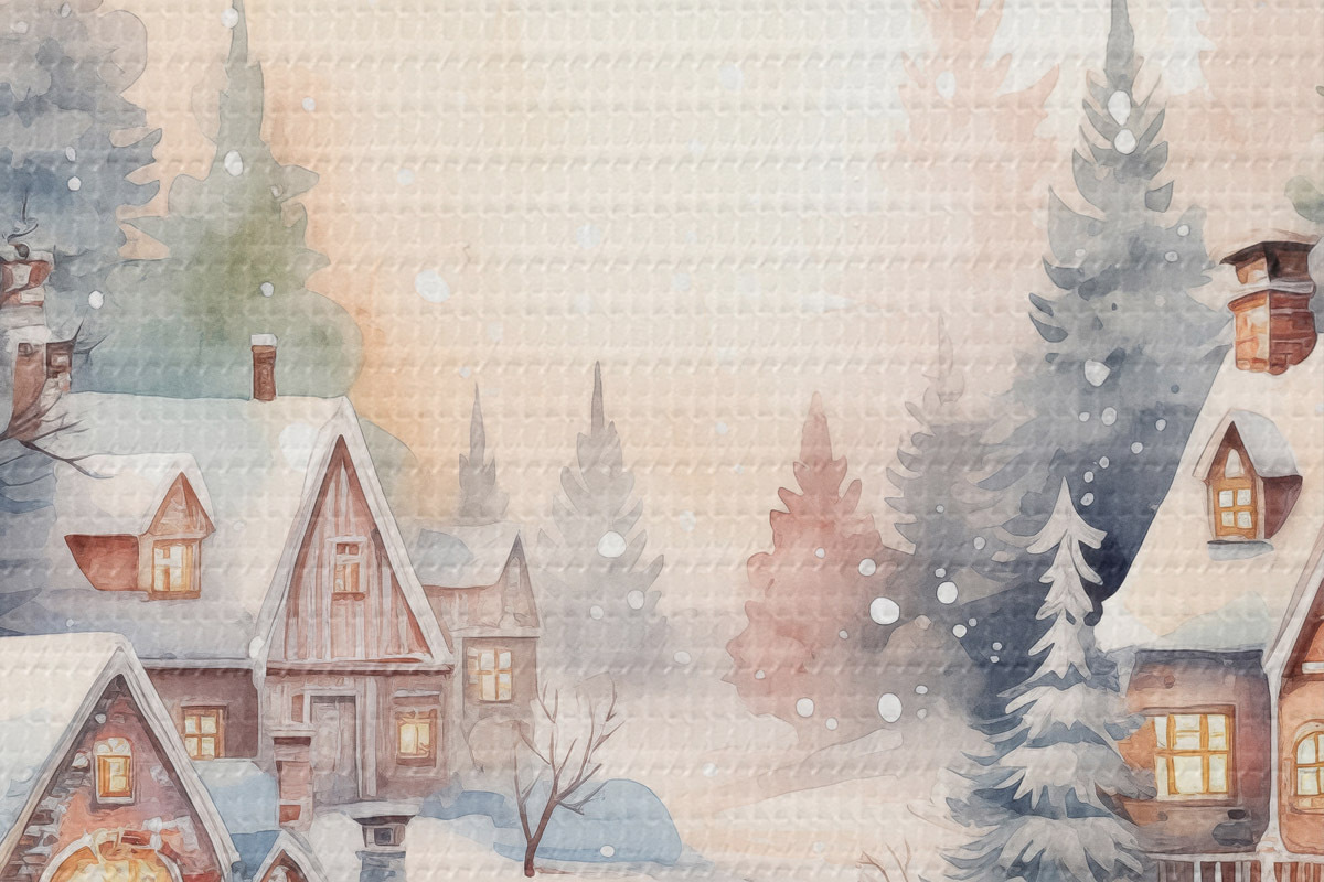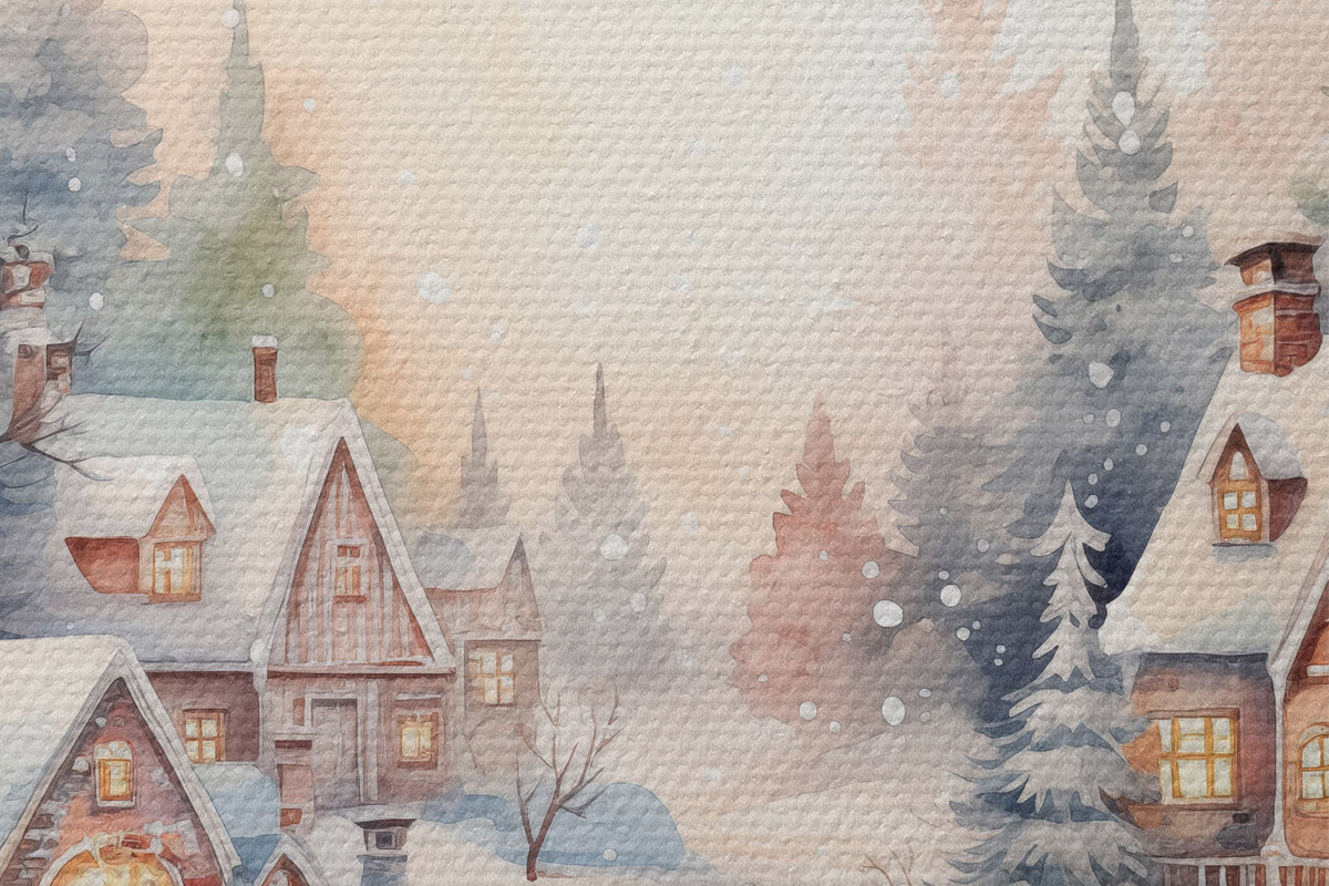 Attēls Ziemas ainava, priežu mežs, skaistas mājas, akvarelis, susnets Nr r41390