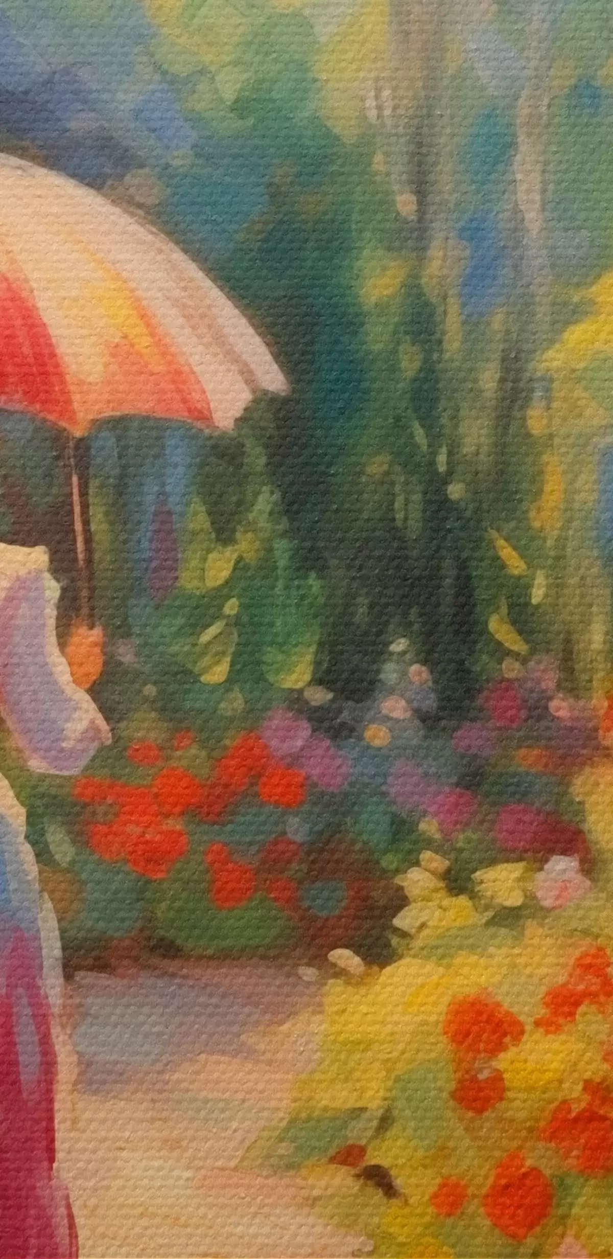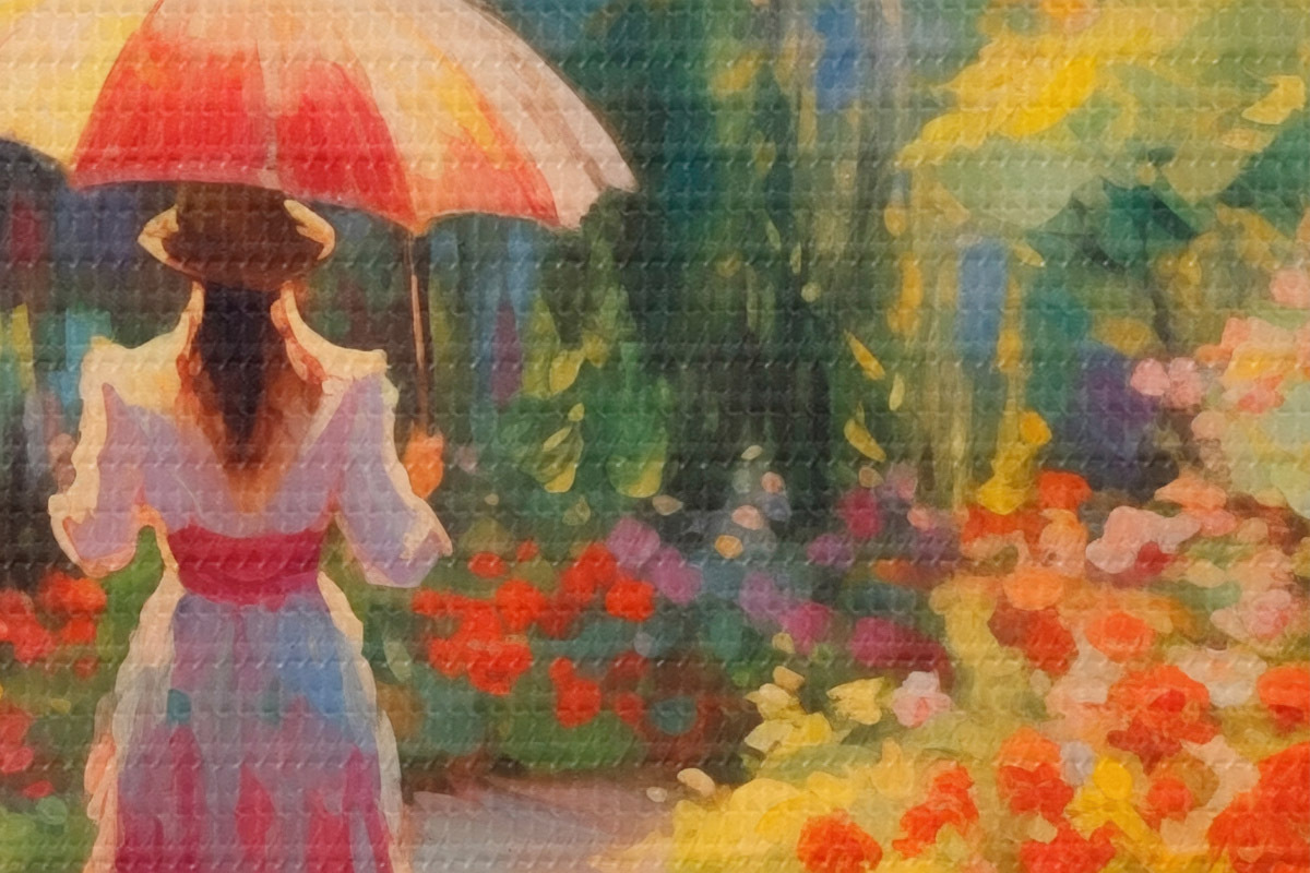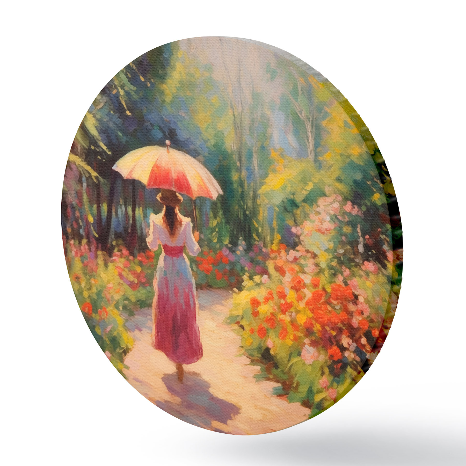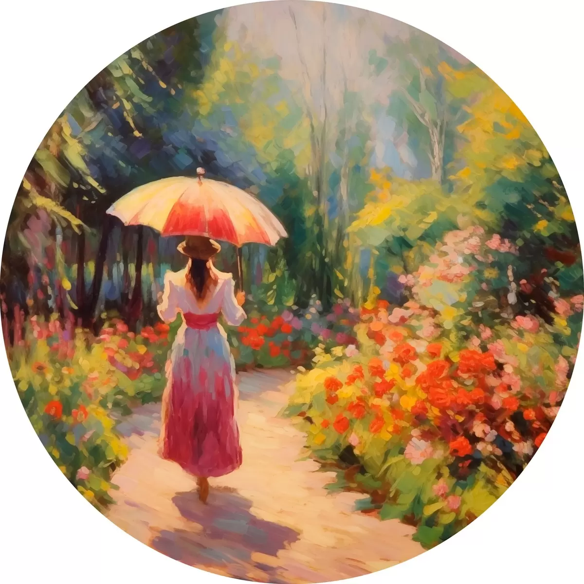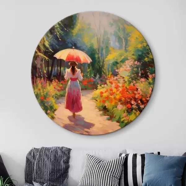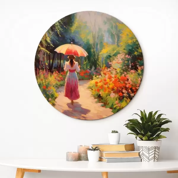 Apaļas gleznas Dāma ar lietussargu ziedošā dārzā r41495