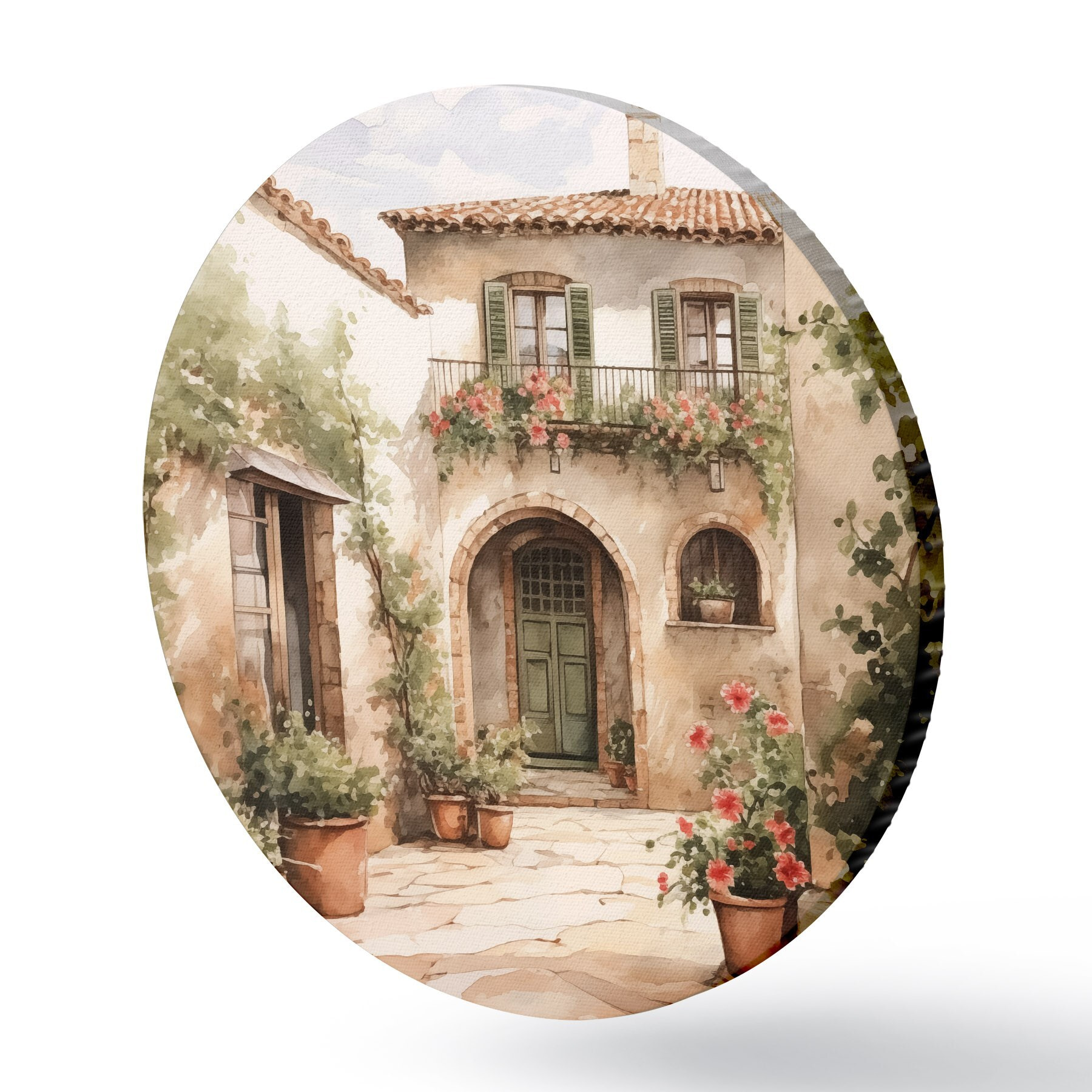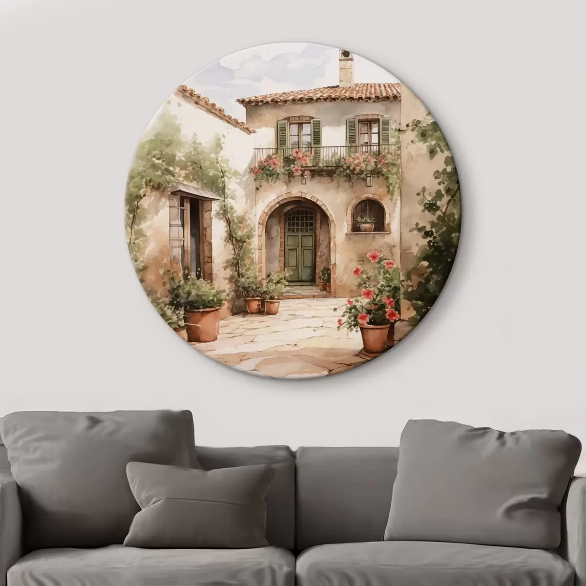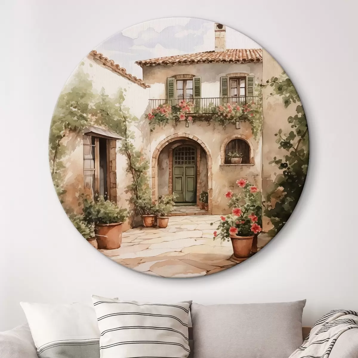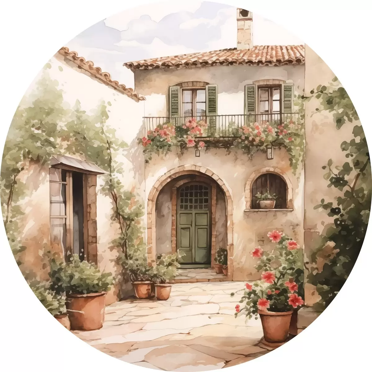 Apaļas gleznas Itāļu pagalms ar puķu podiem, kas imitē akvareli r42126