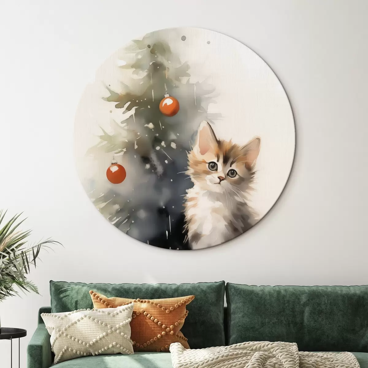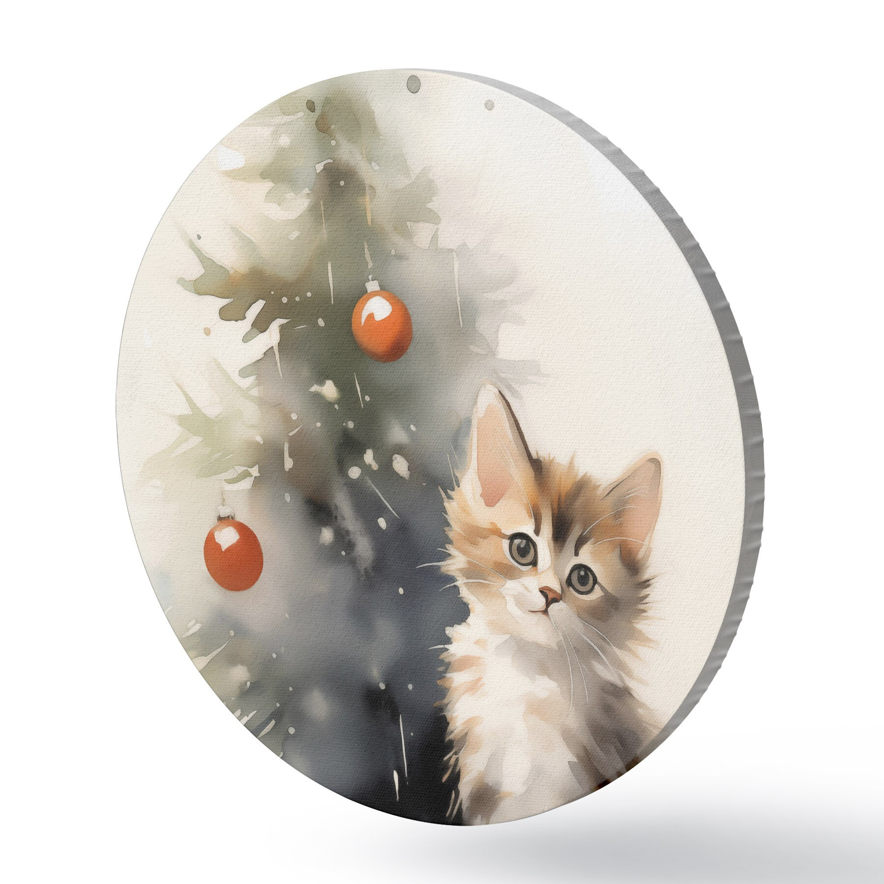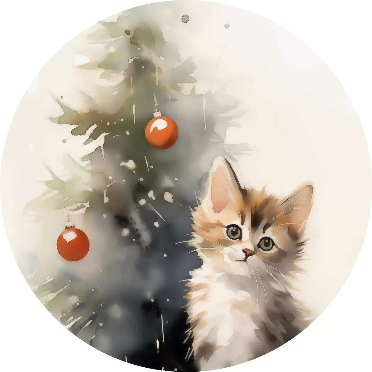 Apaļas gleznas Kaķēns pie Ziemassvētku eglītes mitras akvareļkrāsas imitācija r42140