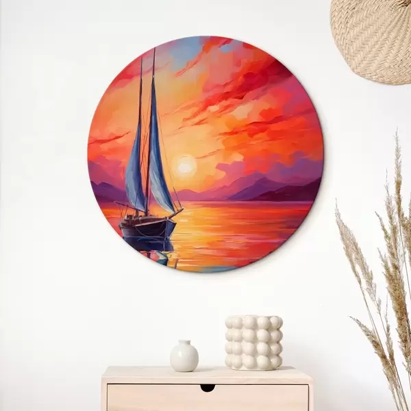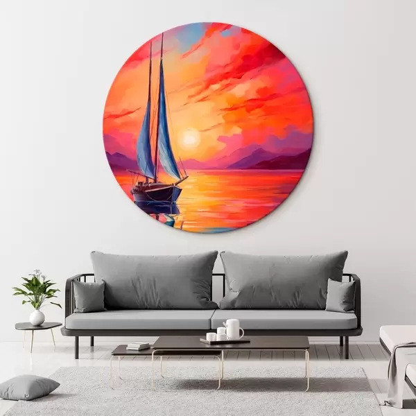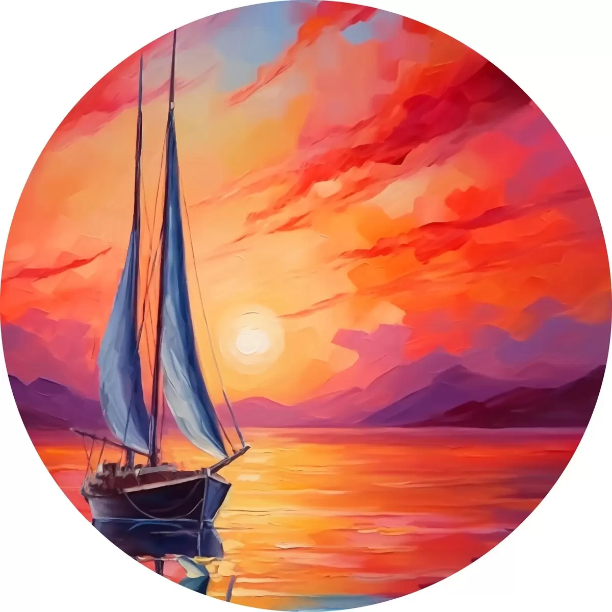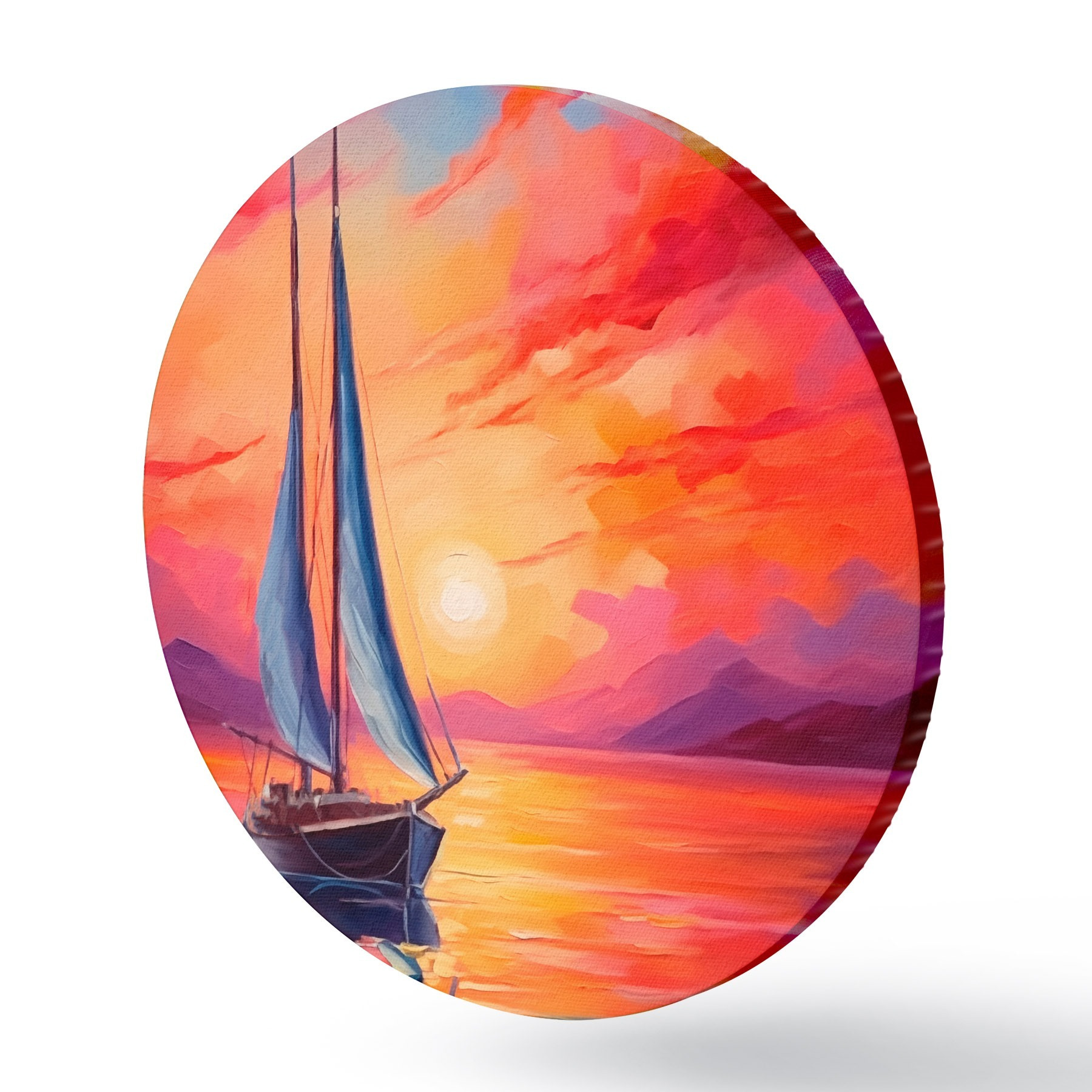 Apaļas gleznas Buru laiva uz spilgta saulrieta fona r42151