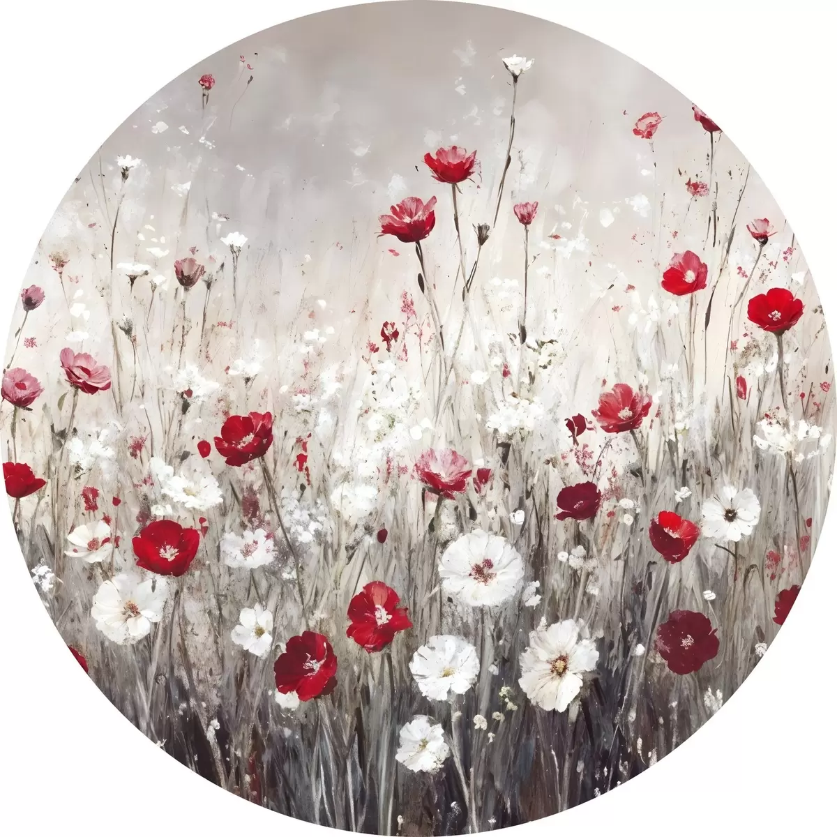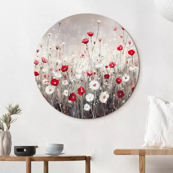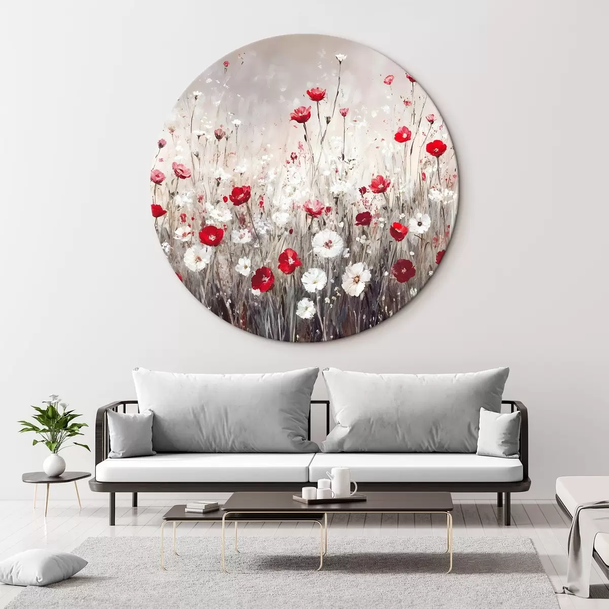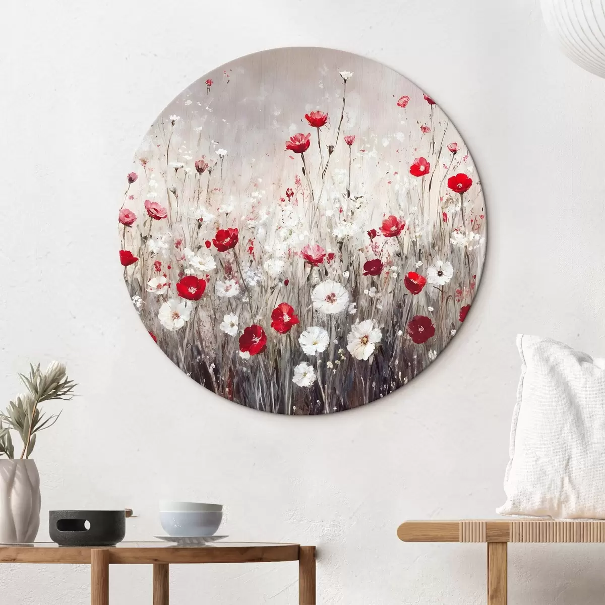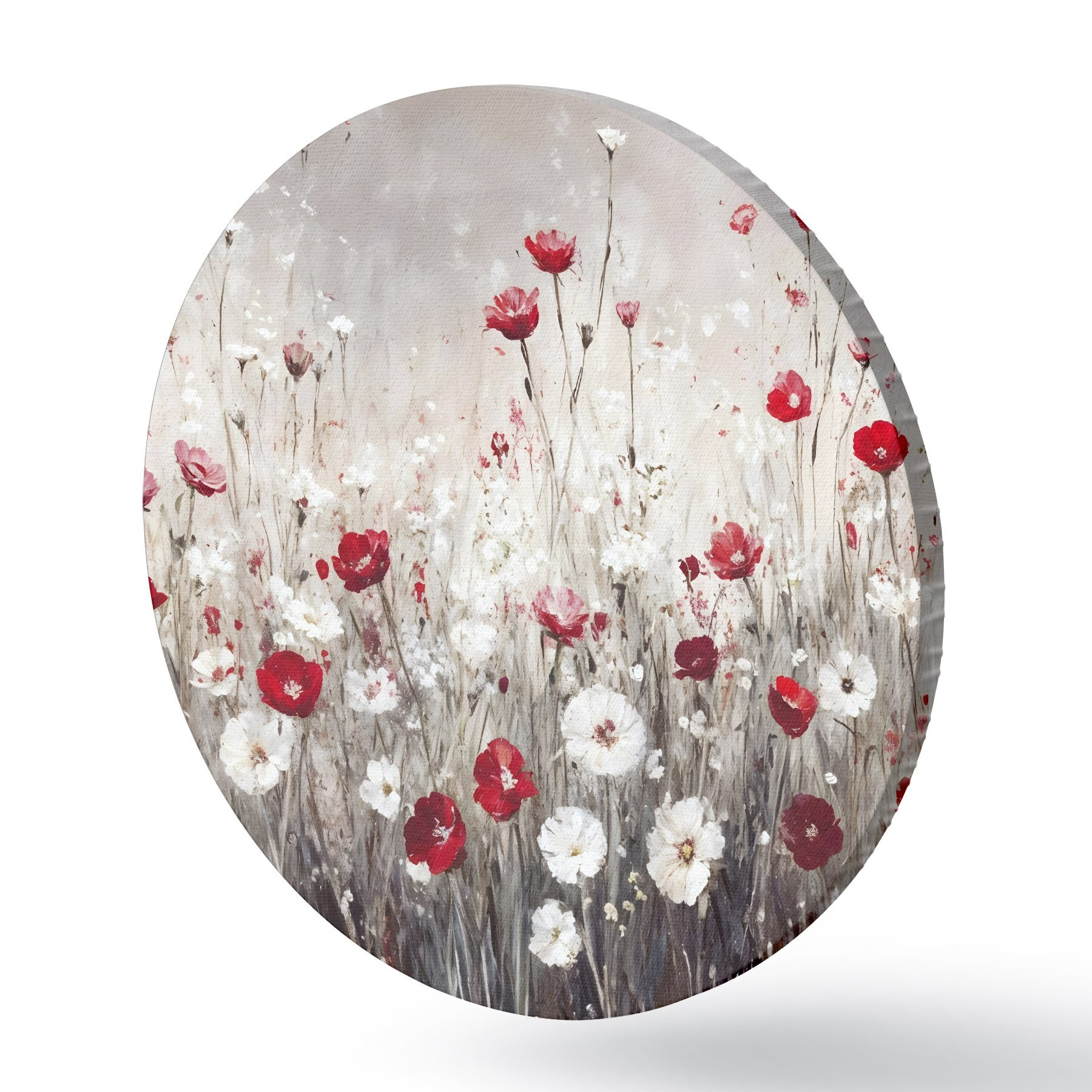 Apaļas gleznas Abstrakta eļļas glezniecības imitācija - sarkanu un baltu magoņu un margrietiņu ziedu lauks uz pelēka faktūru fona r42213