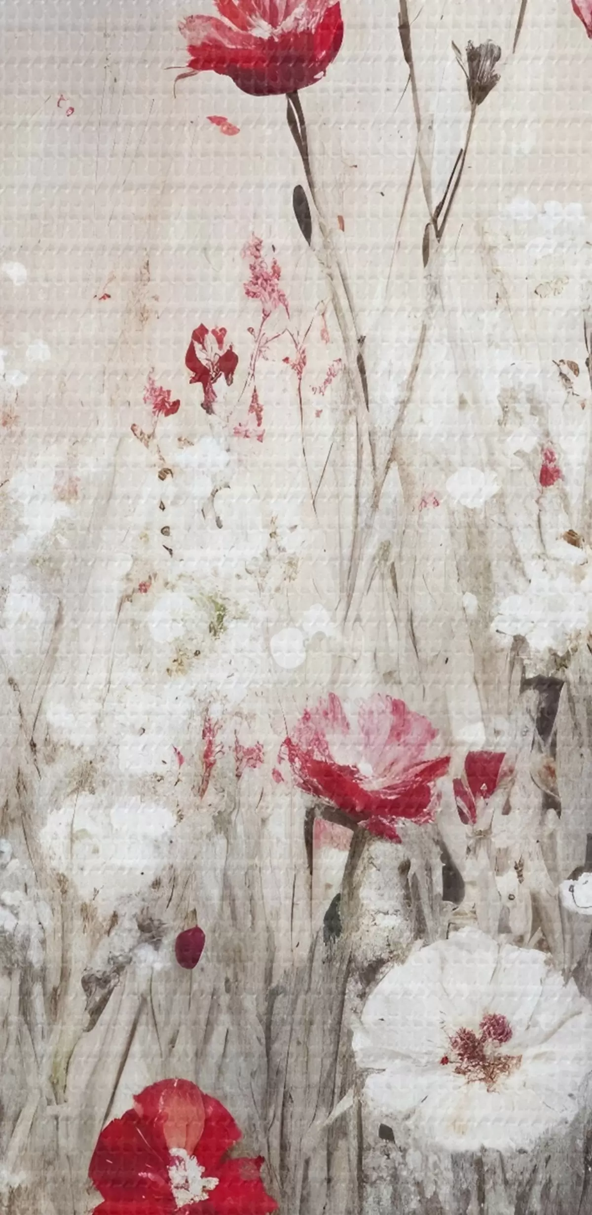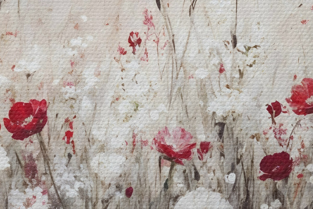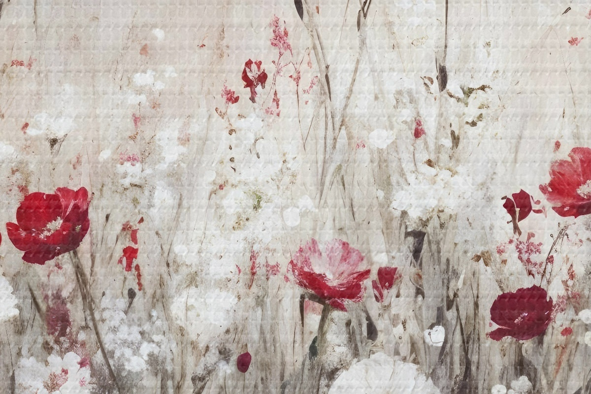 Attēls Abstrakta eļļas glezniecības imitācija - sarkanu un baltu magoņu un margrietiņu ziedu lauks uz pelēka faktūru fona Nr r42213