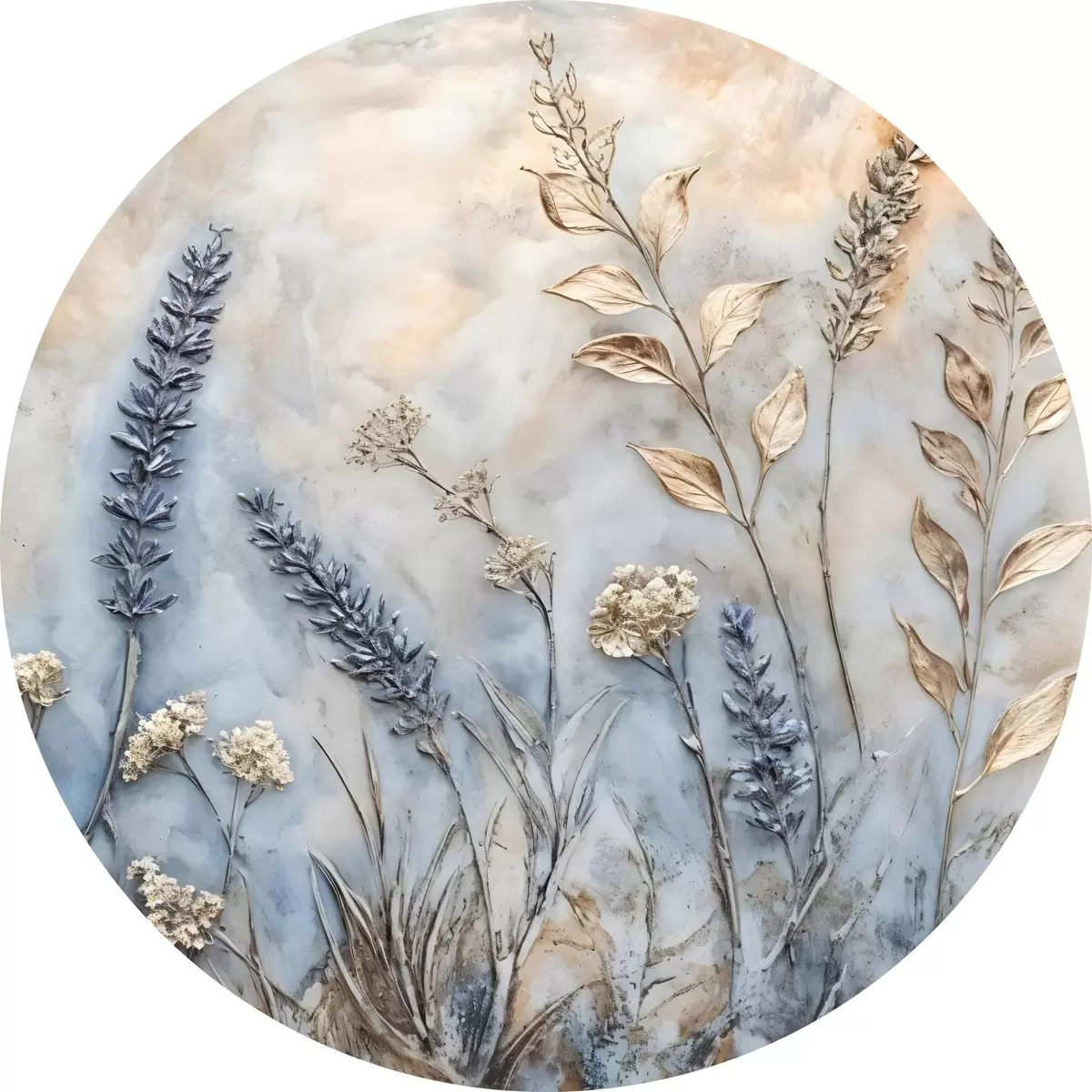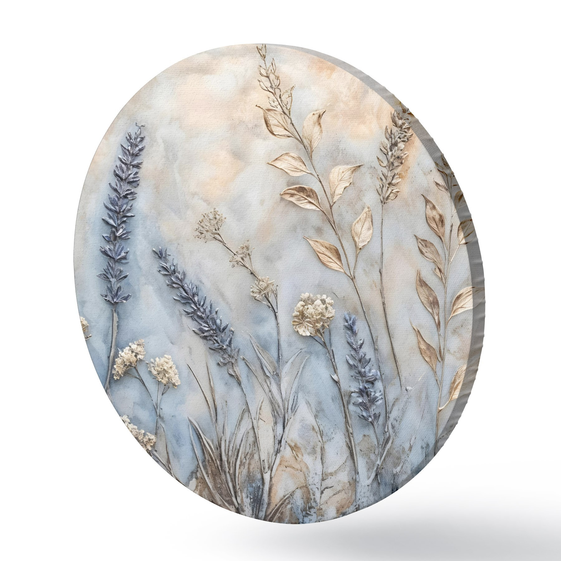 Apaļas gleznas Dažādu savvaļas ziedu un augu lauks zilos, baltos un smilškrāsas toņos uz maiga, miglaina fona r42214