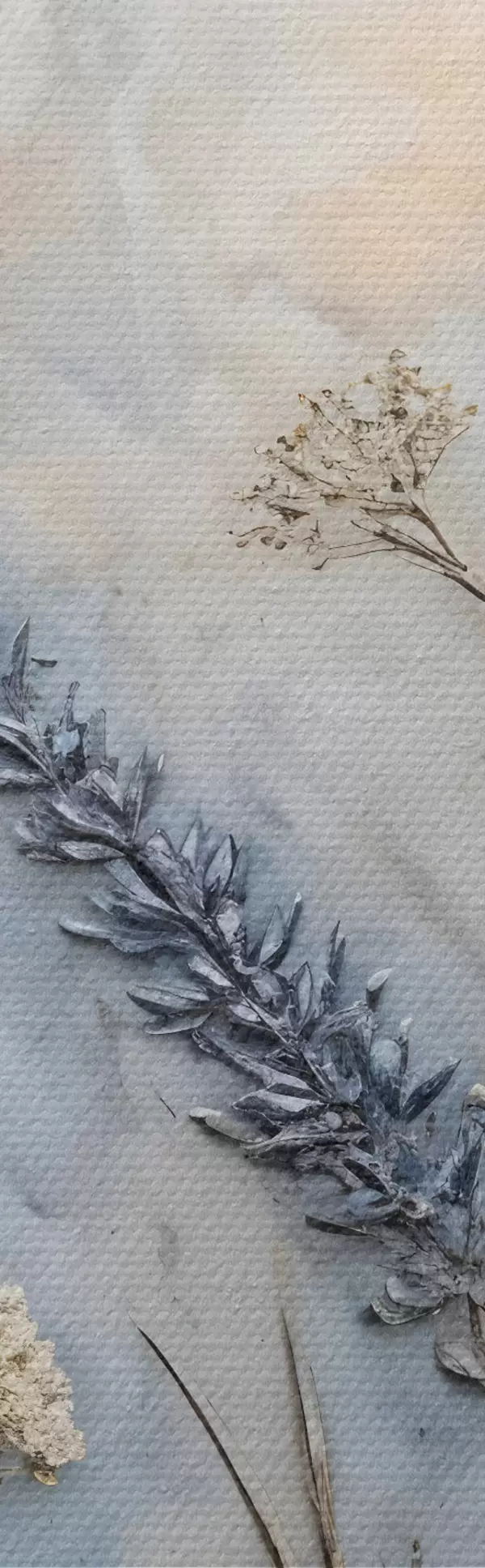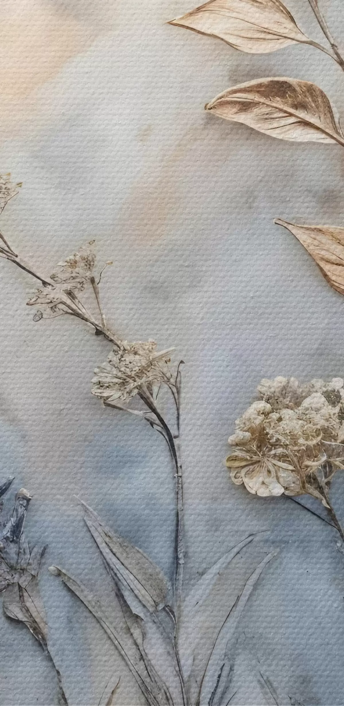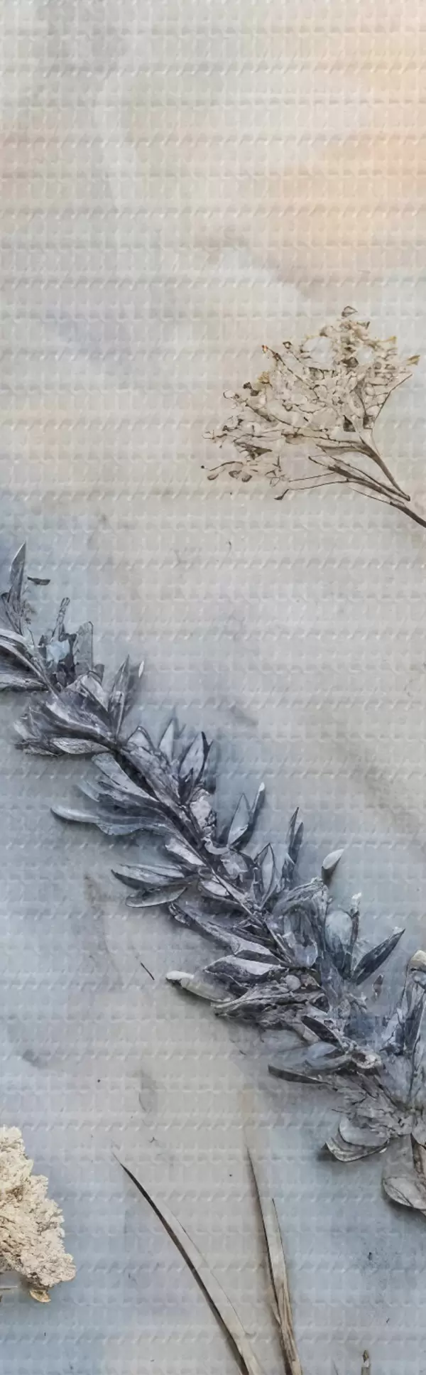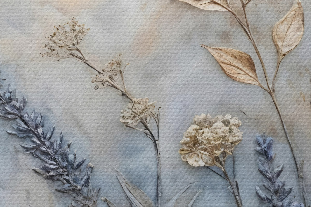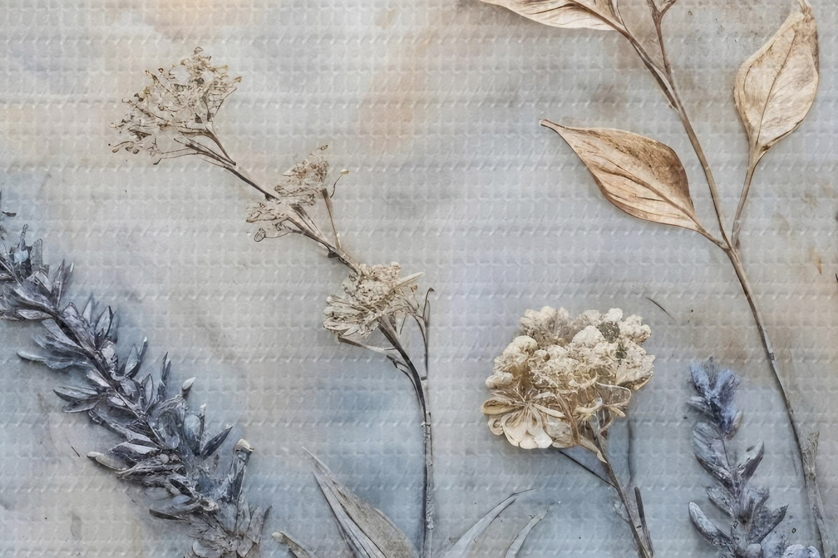 Attēls Dažādu savvaļas ziedu un augu lauks zilos, baltos un smilškrāsas toņos uz maiga, miglaina fona Nr r42214