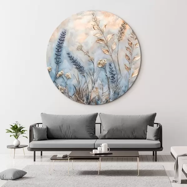 Apaļas gleznas Dažādu savvaļas ziedu un augu lauks zilos, baltos un smilškrāsas toņos uz maiga, miglaina fona r42214