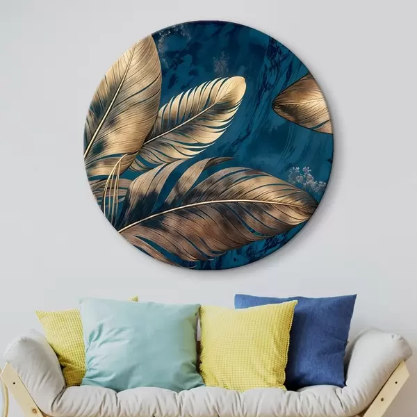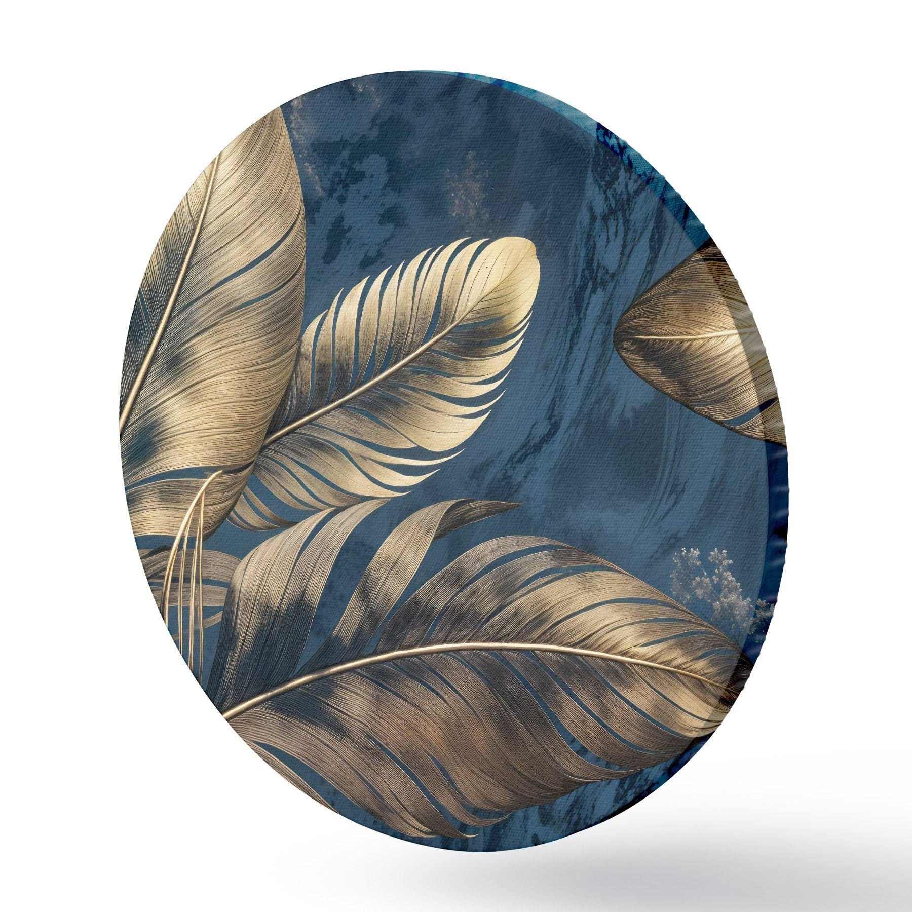 Apaļas gleznas Dzeltenas un smilškrāsas abstraktas dekoratīvas spalvas, kas peld uz tumši zila faktūras fona r42218