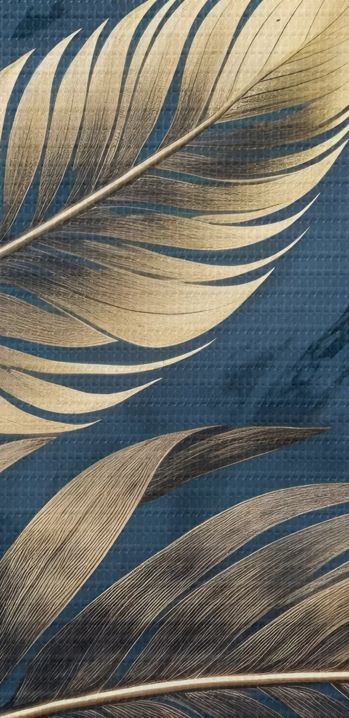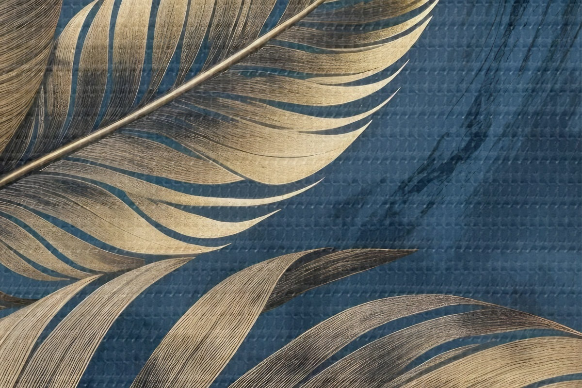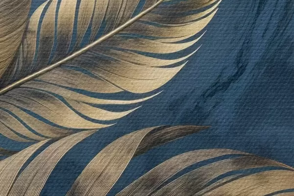 Attēls Dzeltenas un smilškrāsas abstraktas dekoratīvas spalvas, kas peld uz tumši zila faktūras fona Nr r42218
