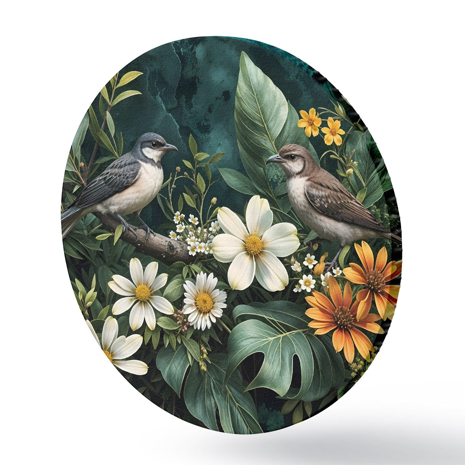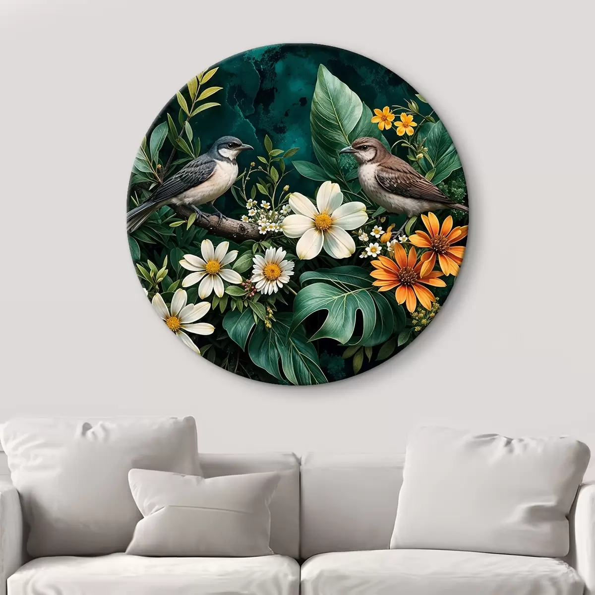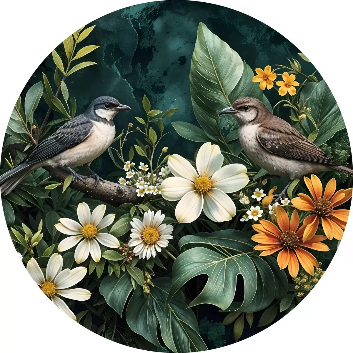 Apaļas gleznas Nelieli putni, kas sēž uz zariem, ko ieskauj sulīga tropu lapotne, tostarp lielas zaļas lapas un krāsaini ziedi r42220