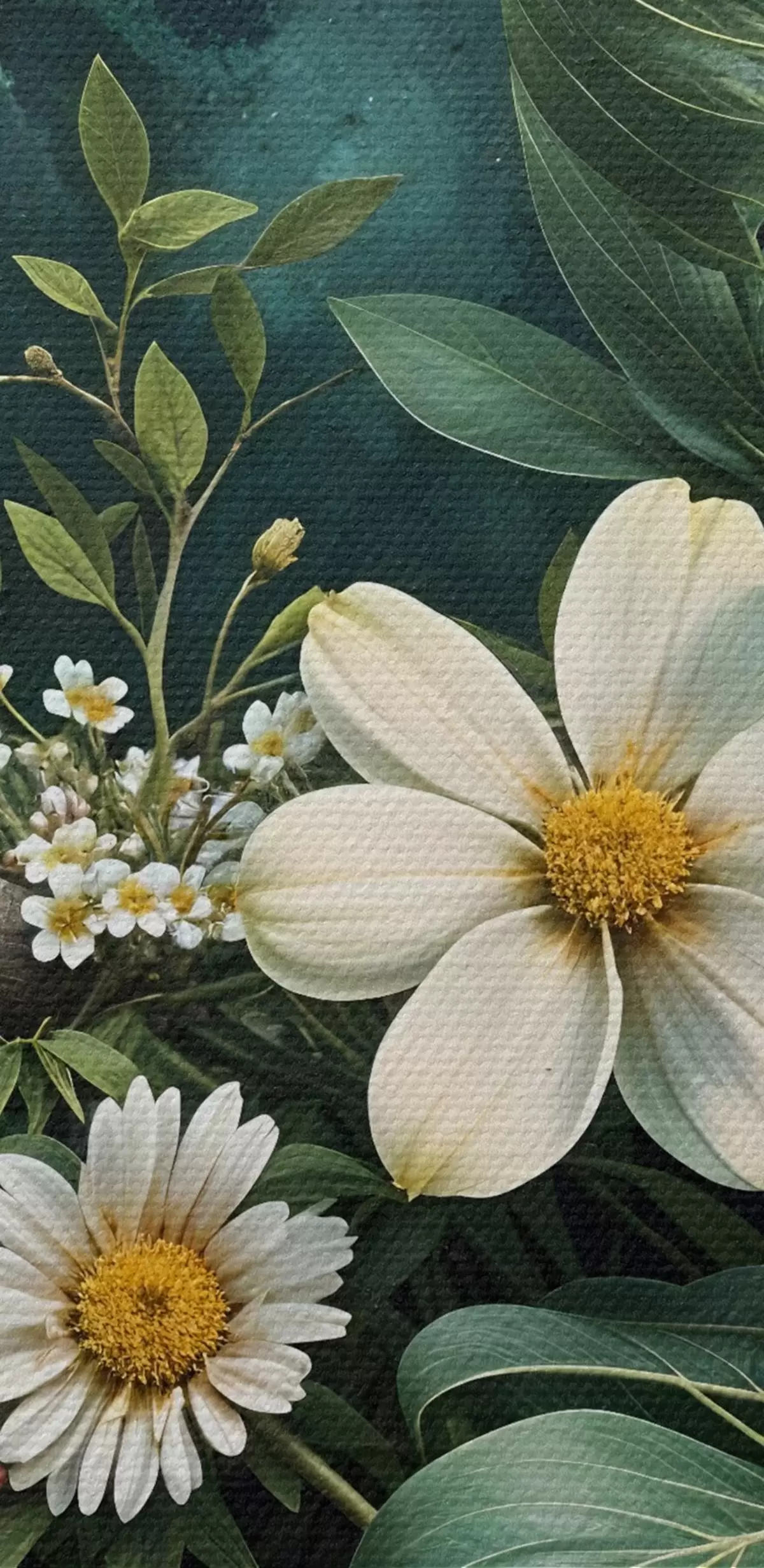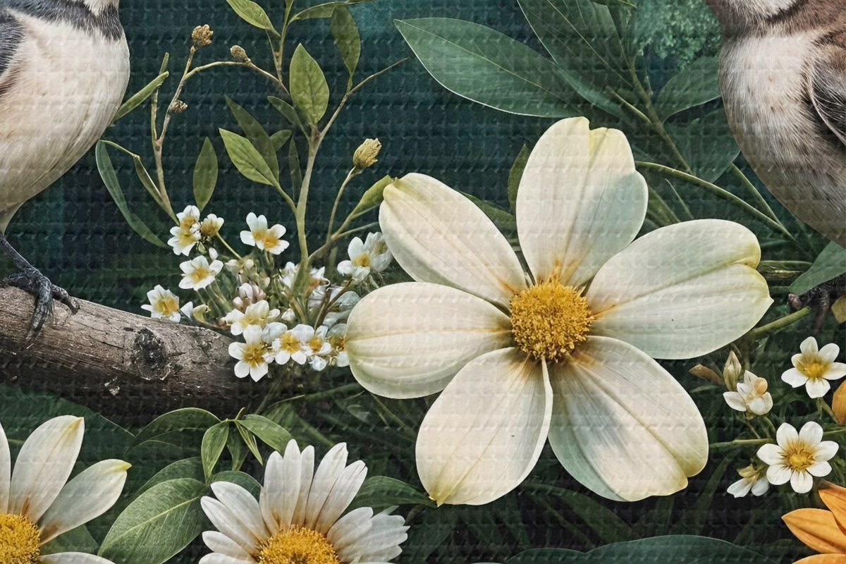 Attēls Nelieli putni, kas sēž uz zariem, ko ieskauj sulīga tropu lapotne, tostarp lielas zaļas lapas un krāsaini ziedi Nr r42220