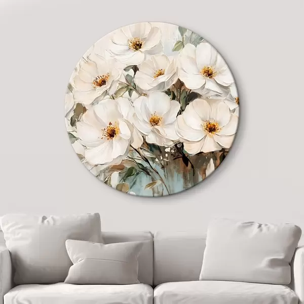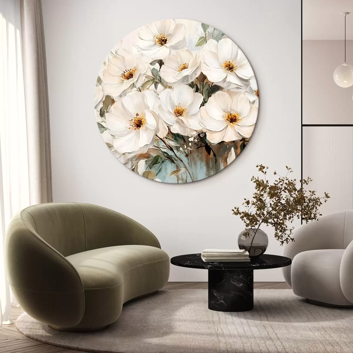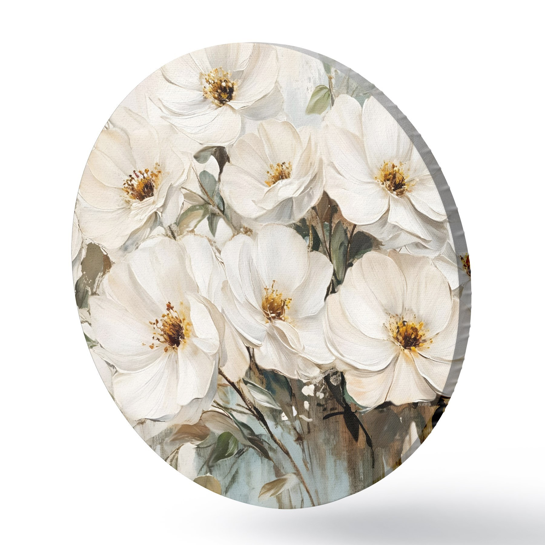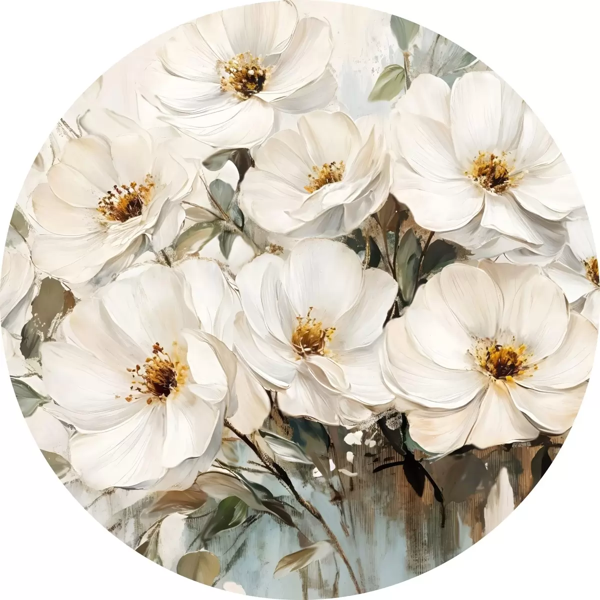 Apaļas gleznas Lielu baltu ziedu pušķis eļļas gleznošanas stilā ar dzelteniem centriem uz gaiša fona r42222