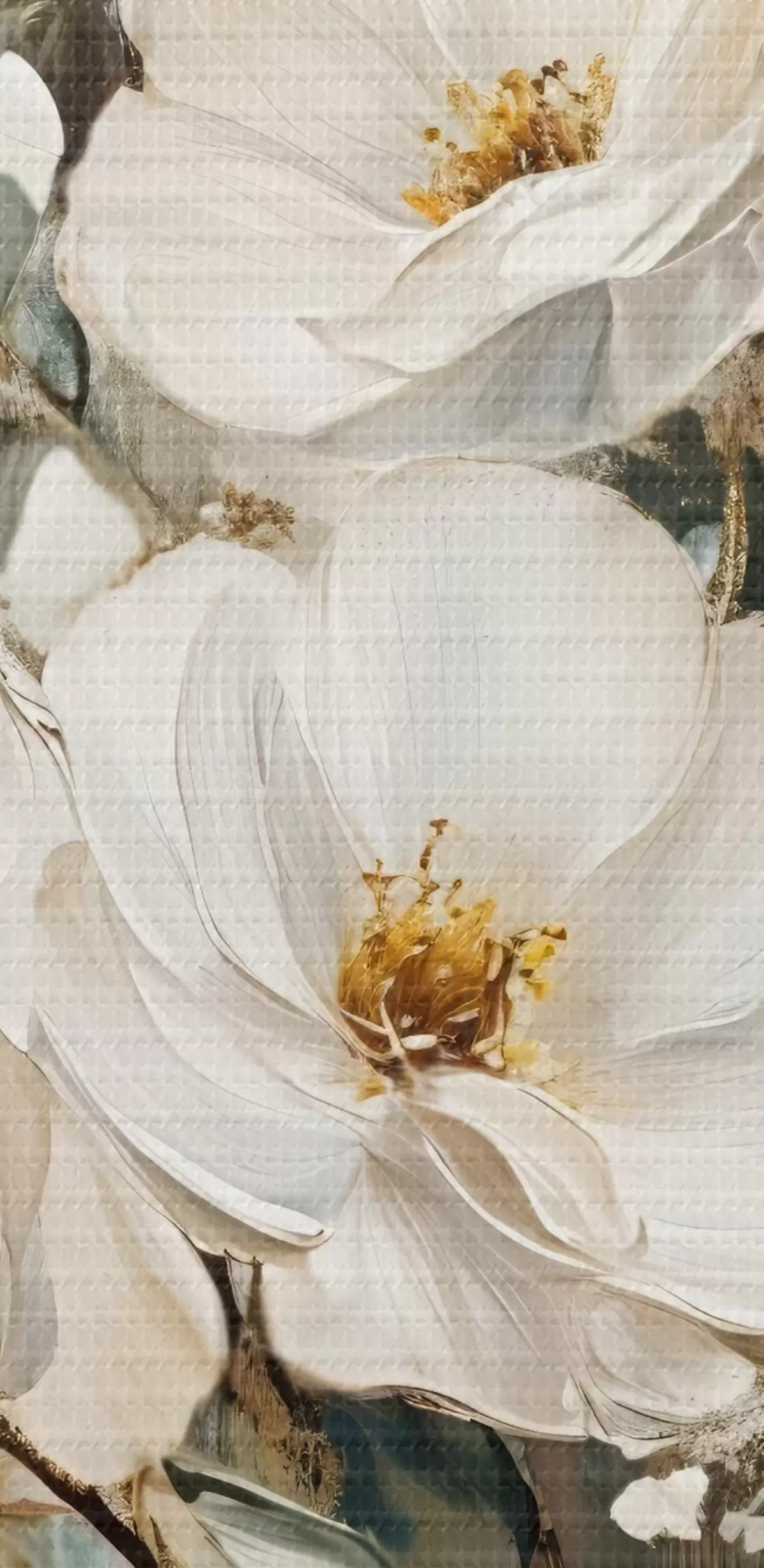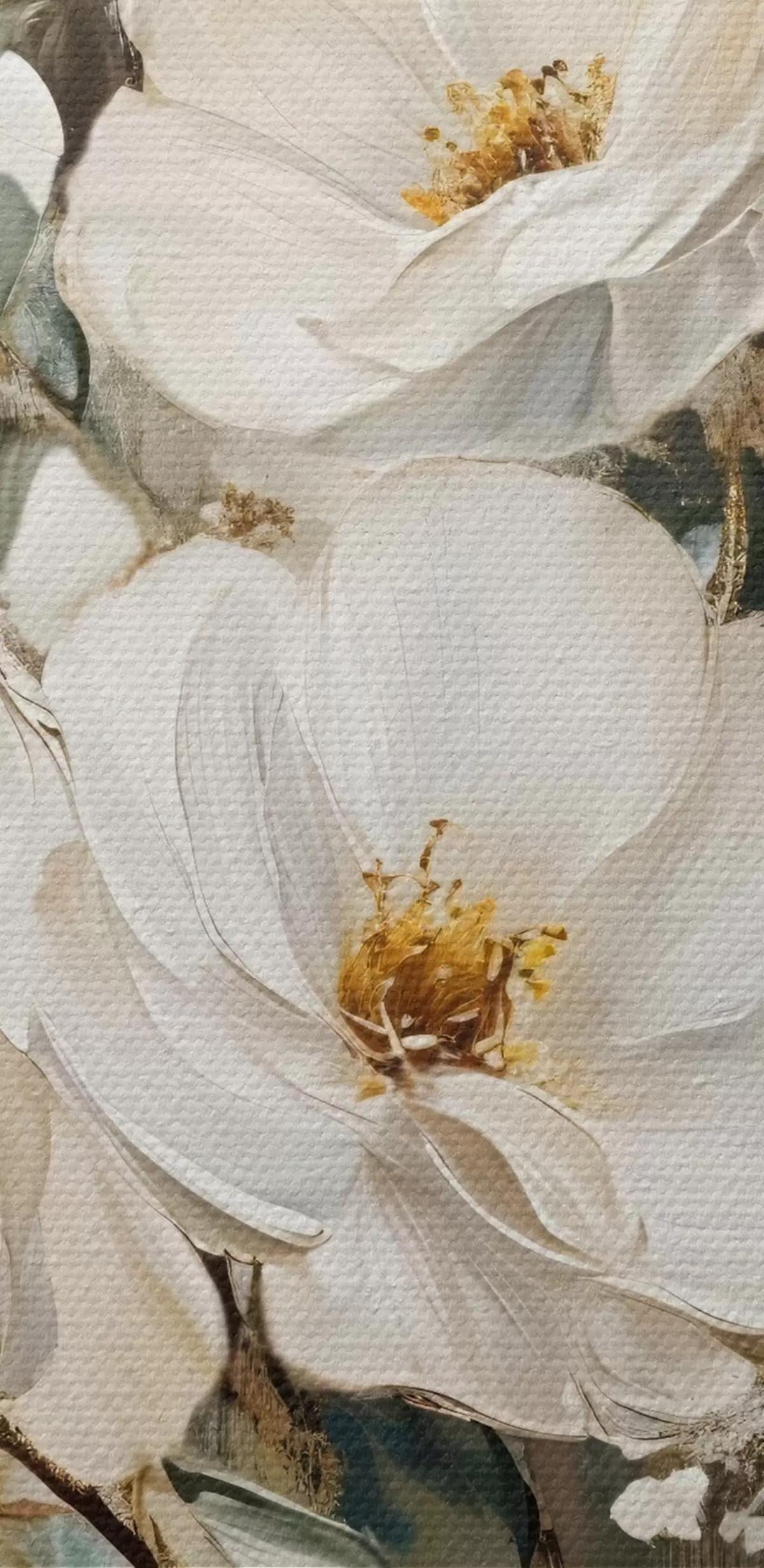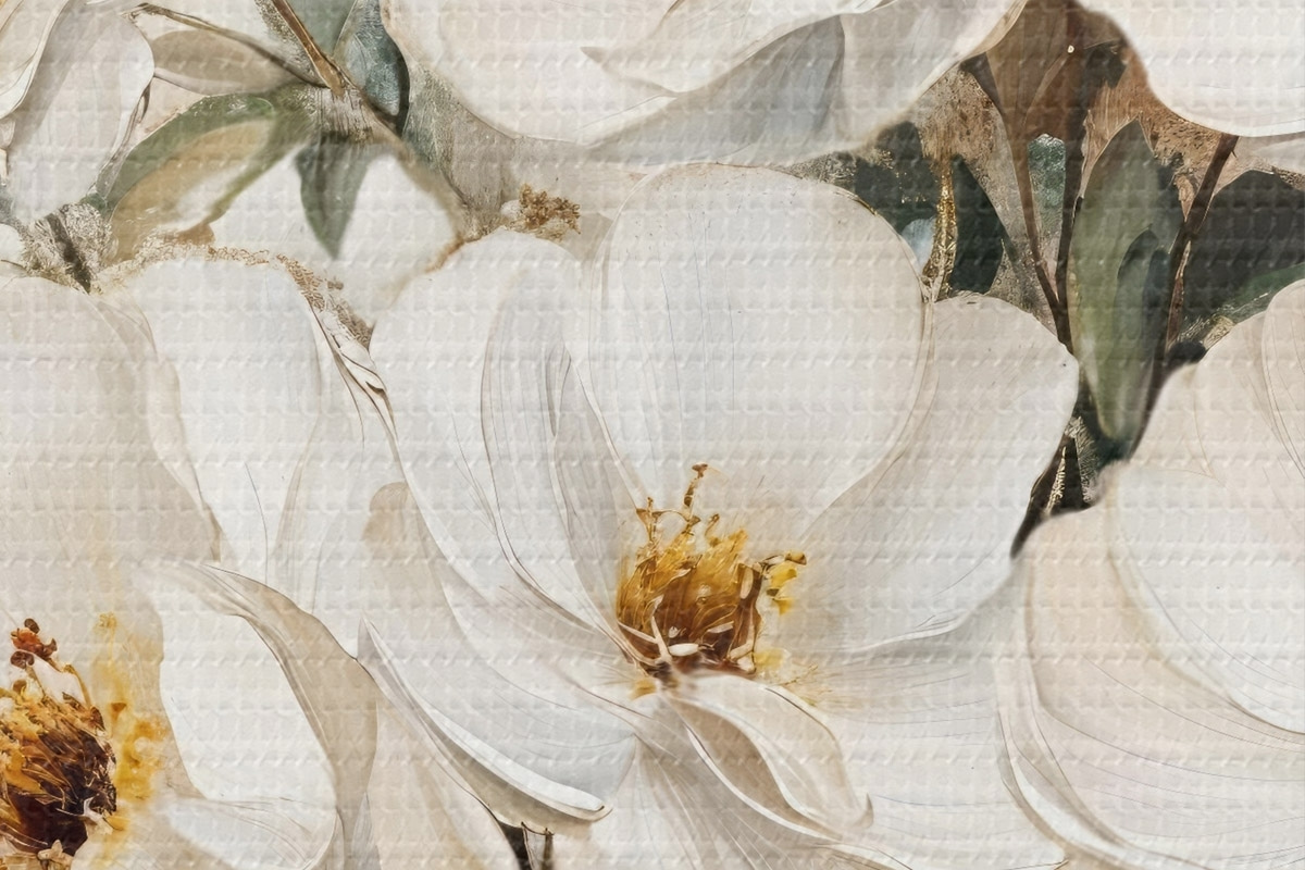 Attēls Lielu baltu ziedu pušķis eļļas gleznošanas stilā ar dzelteniem centriem uz gaiša fona Nr r42222