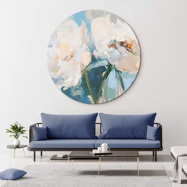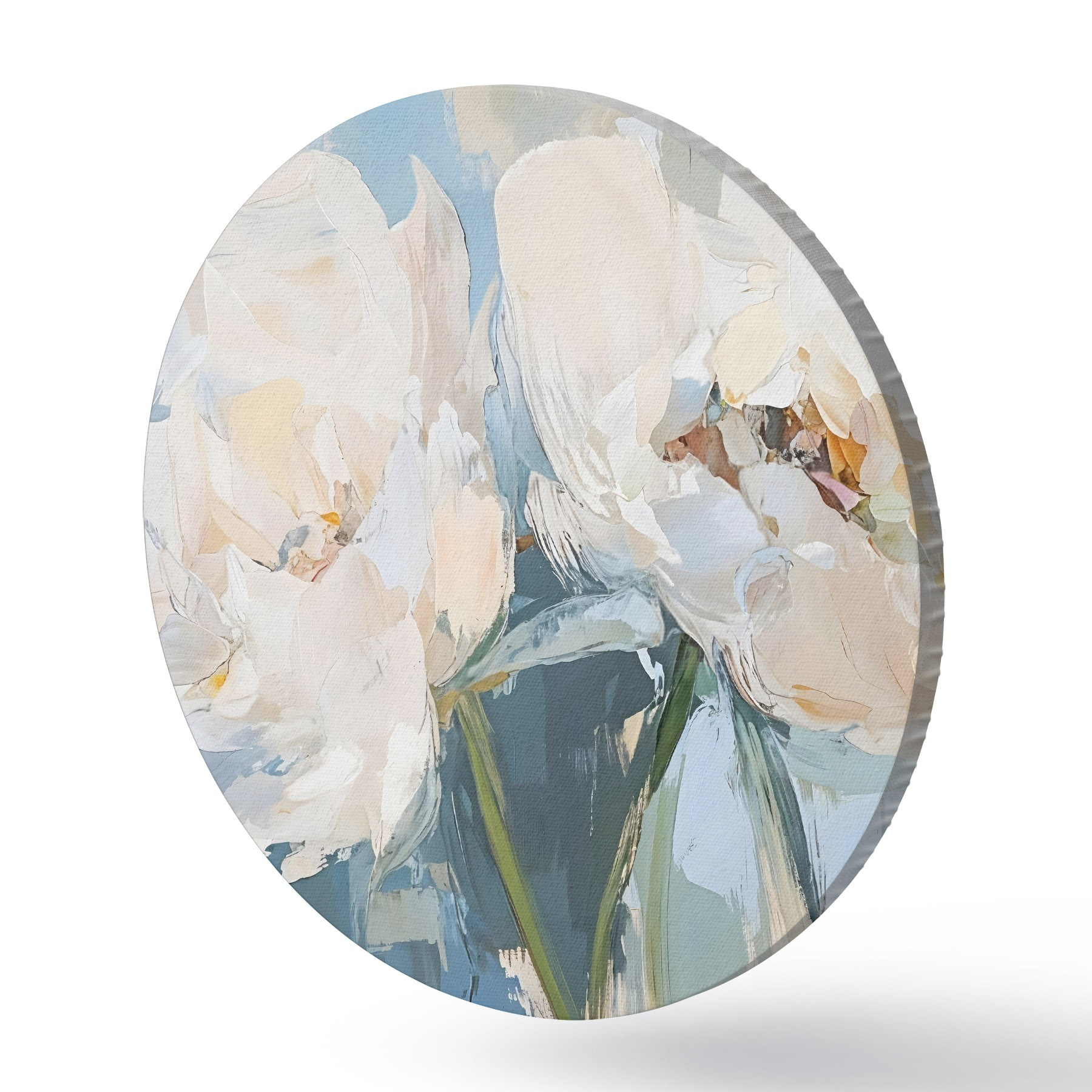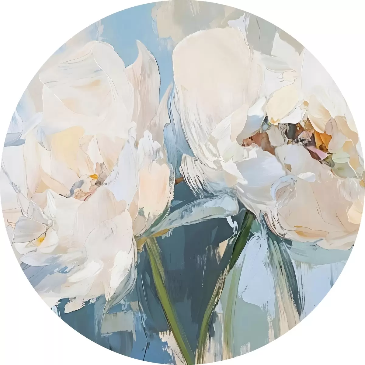 Apaļas gleznas Balta minimālistiska abstrakta peoniju eļļas glezniecības imitācija uz mīksta zila fona r42226