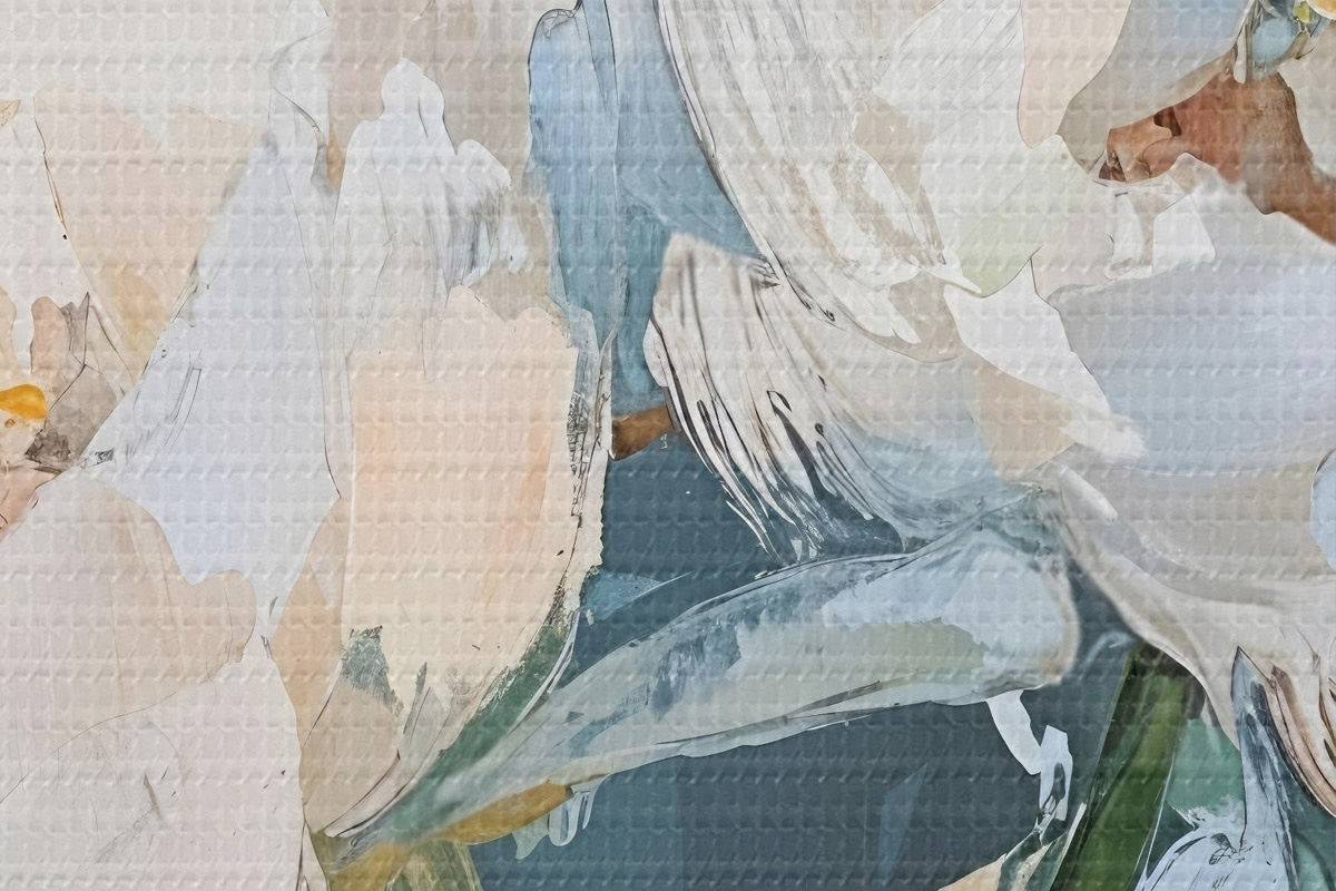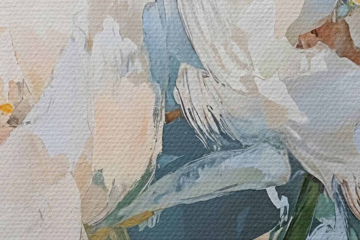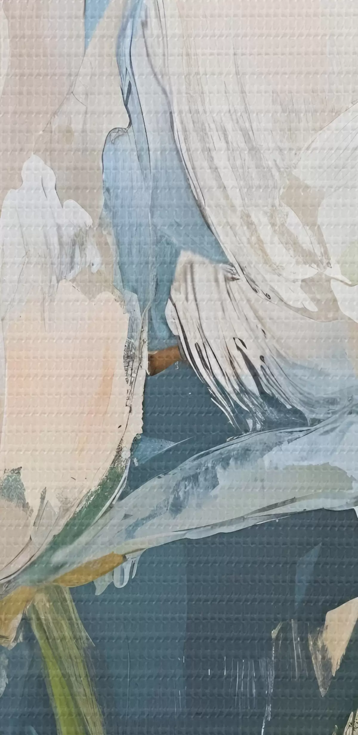 Attēls Balta minimālistiska abstrakta peoniju eļļas glezniecības imitācija uz mīksta zila fona Nr r42226