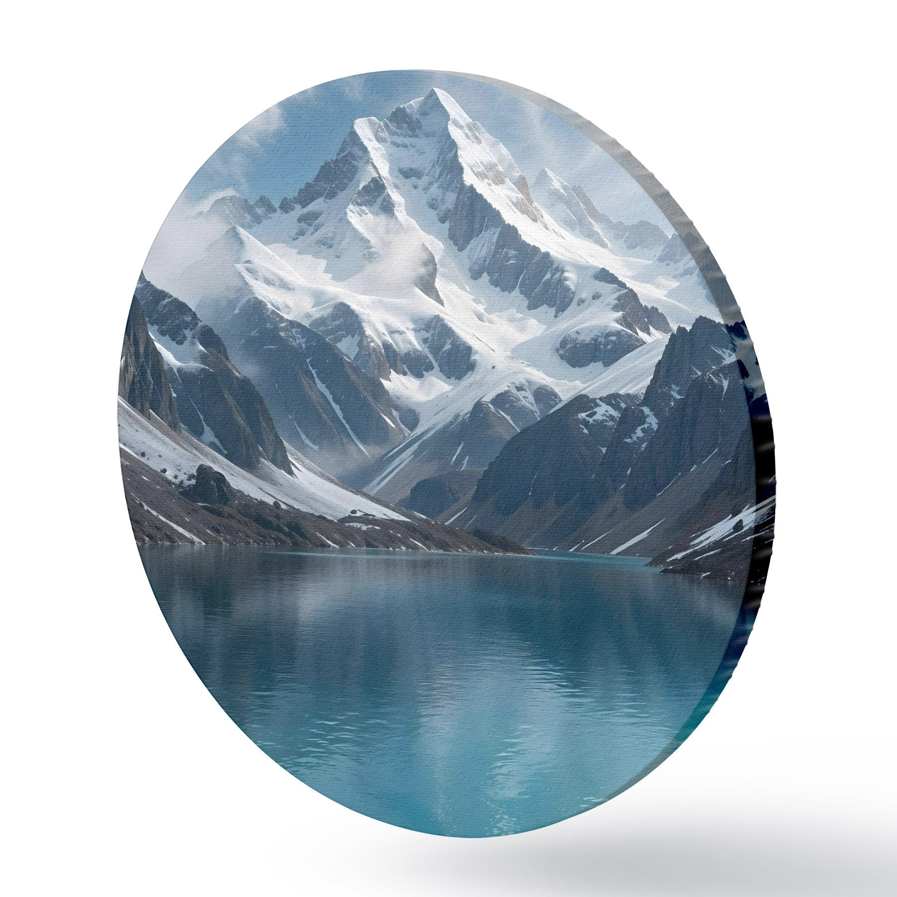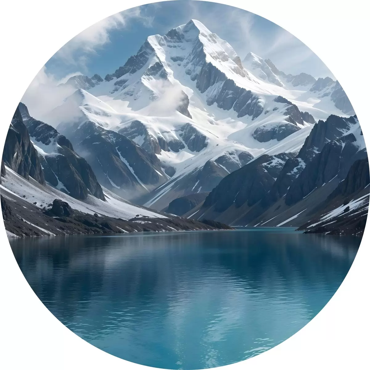 Apaļas gleznas Sniegota kalna virsotne, kas atspoguļojas mierīgā tirkīza ezerā, ko ieskauj klinšains apvidus un dramatiski mākoņi r42232