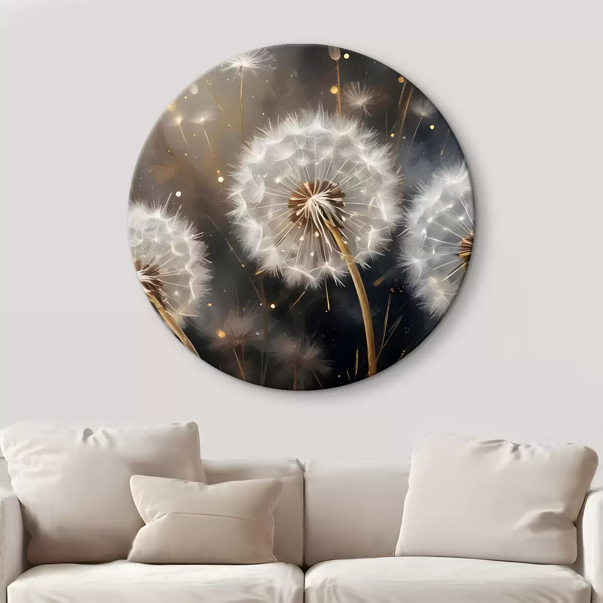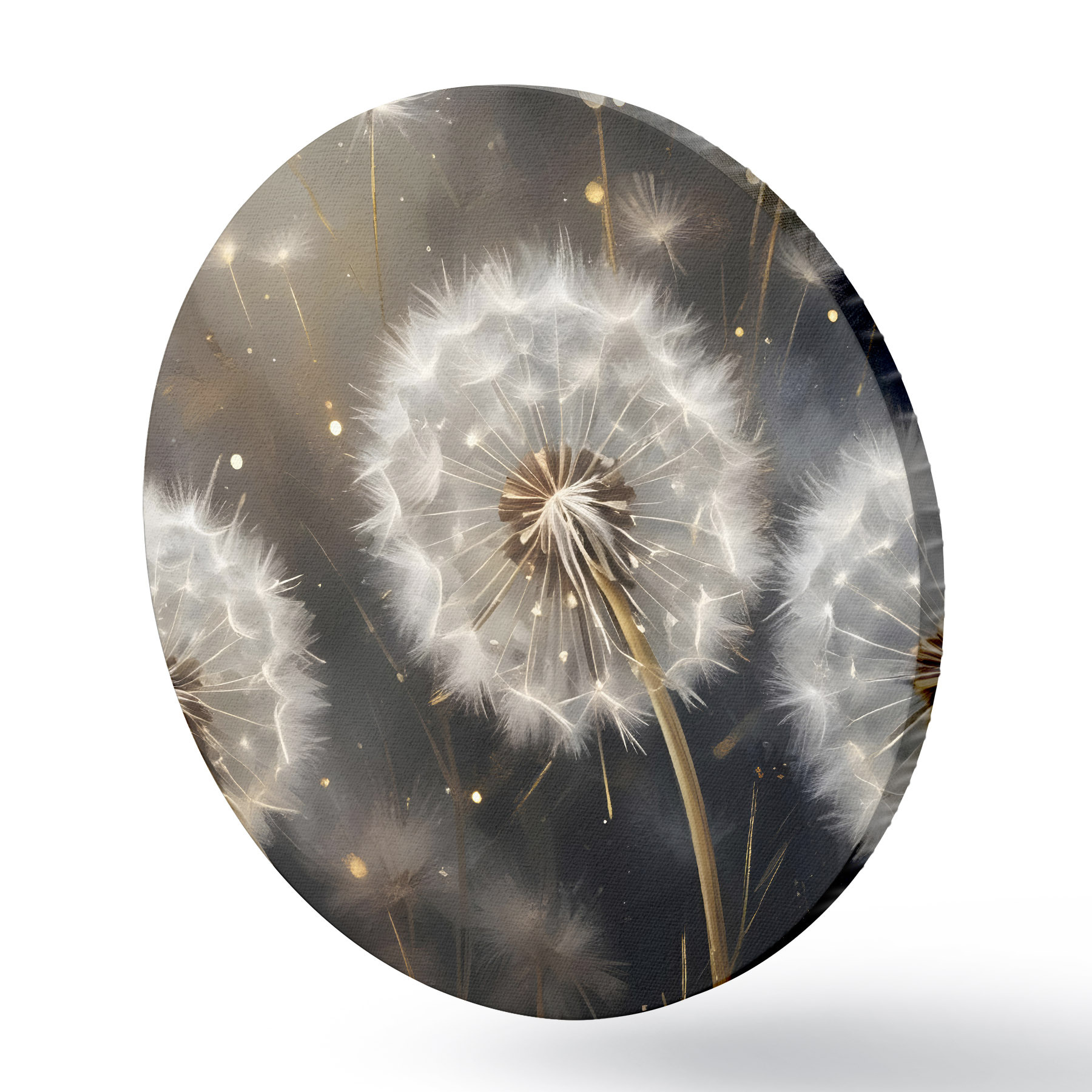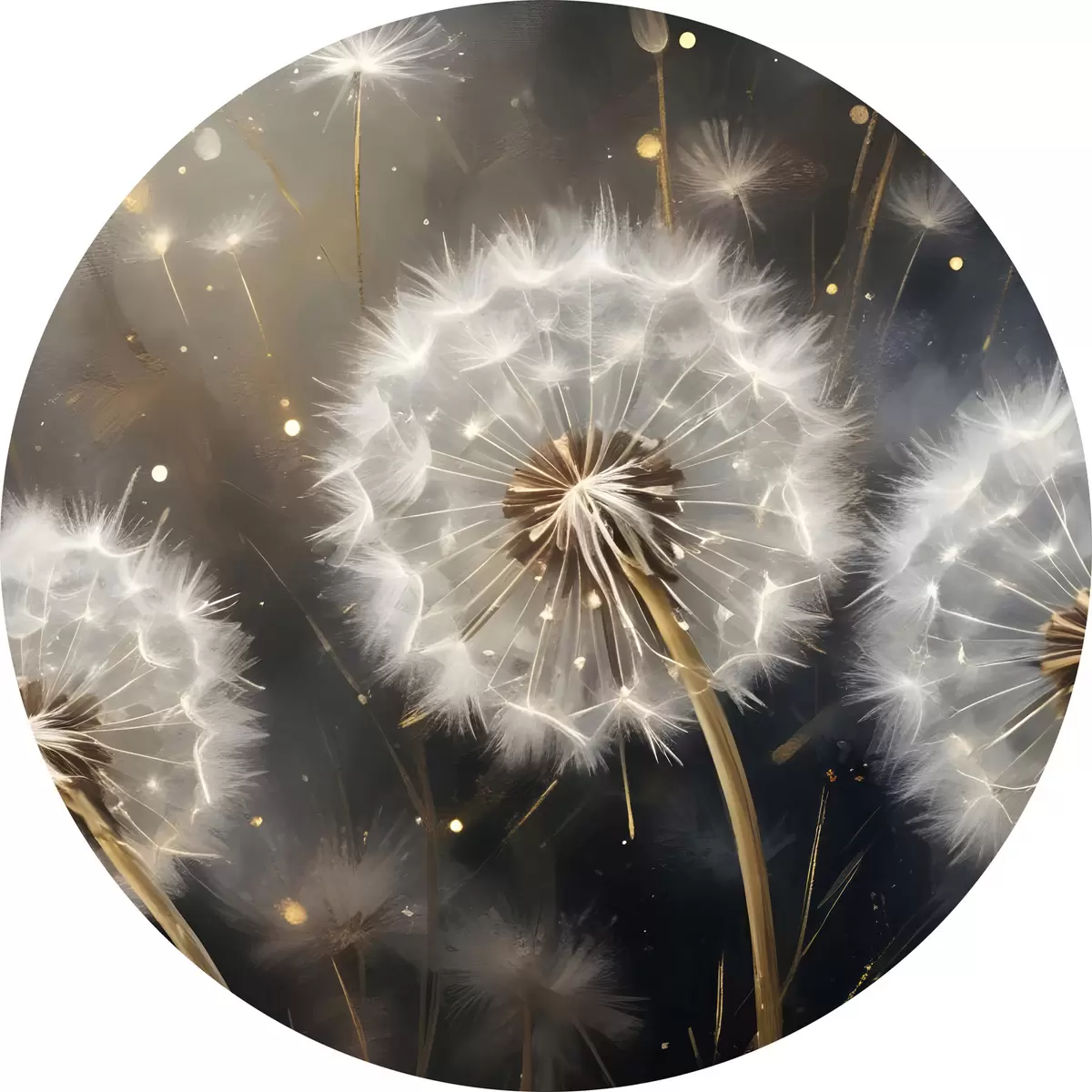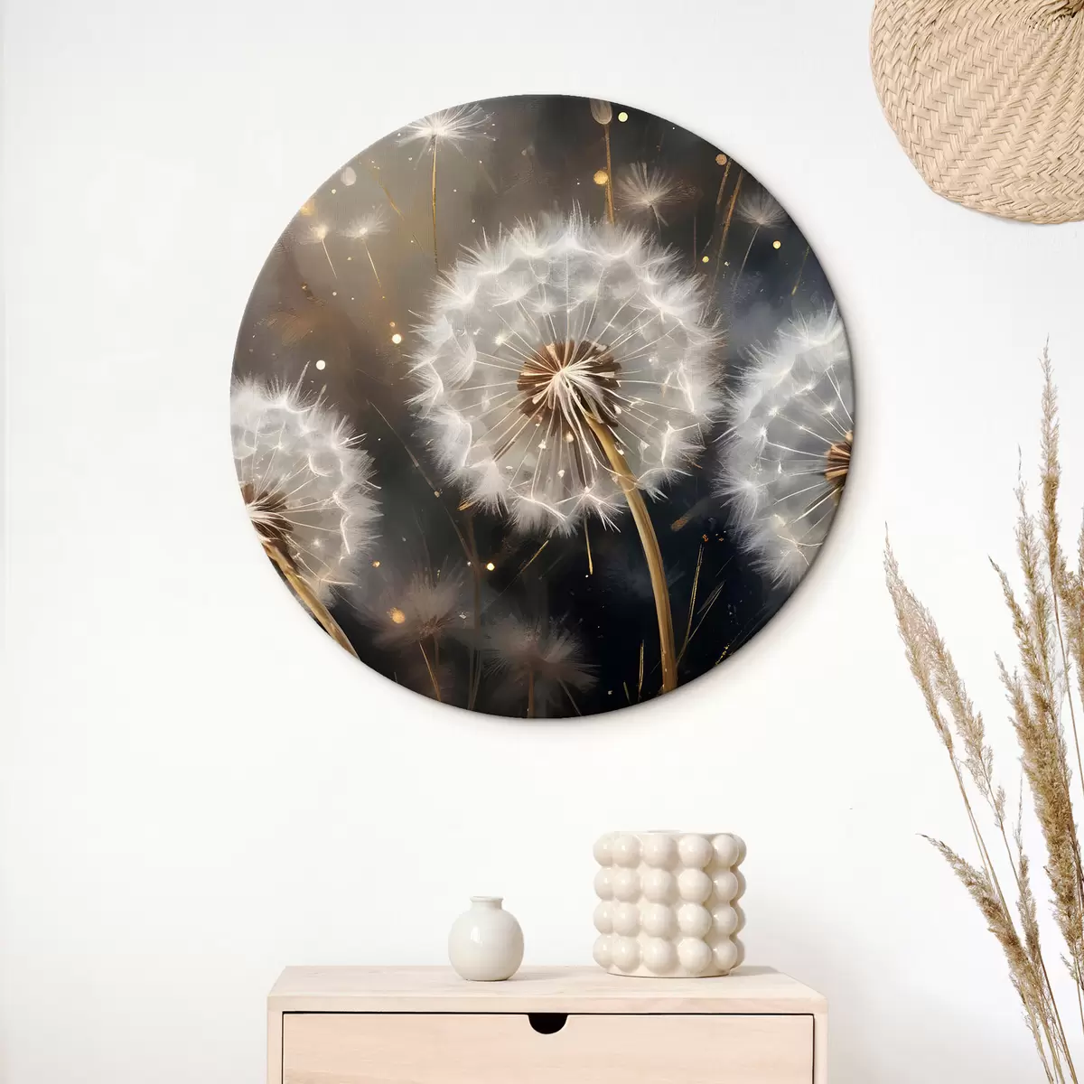 Apaļas gleznas Pūkainie pieneņu ziedi ar pūkainām baltām sēklu galviņām uz tumša fona, radot burvīgu atmosfēru r42235