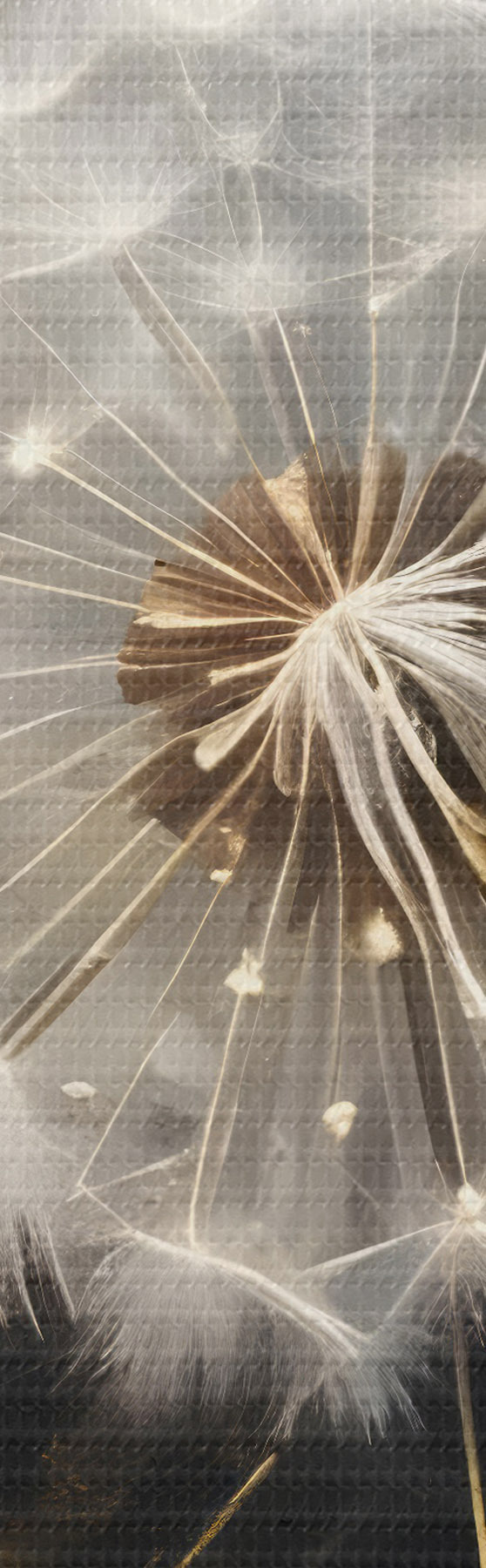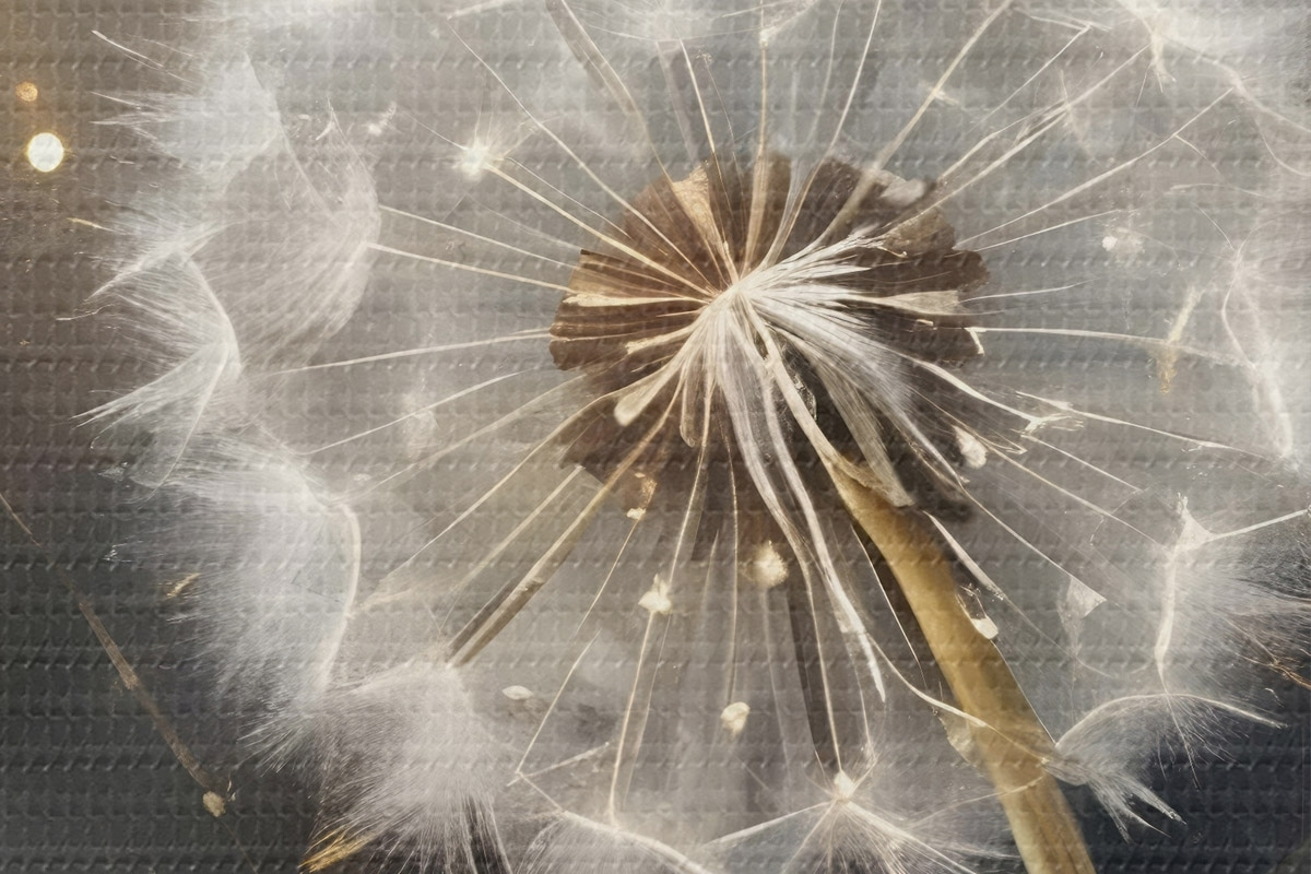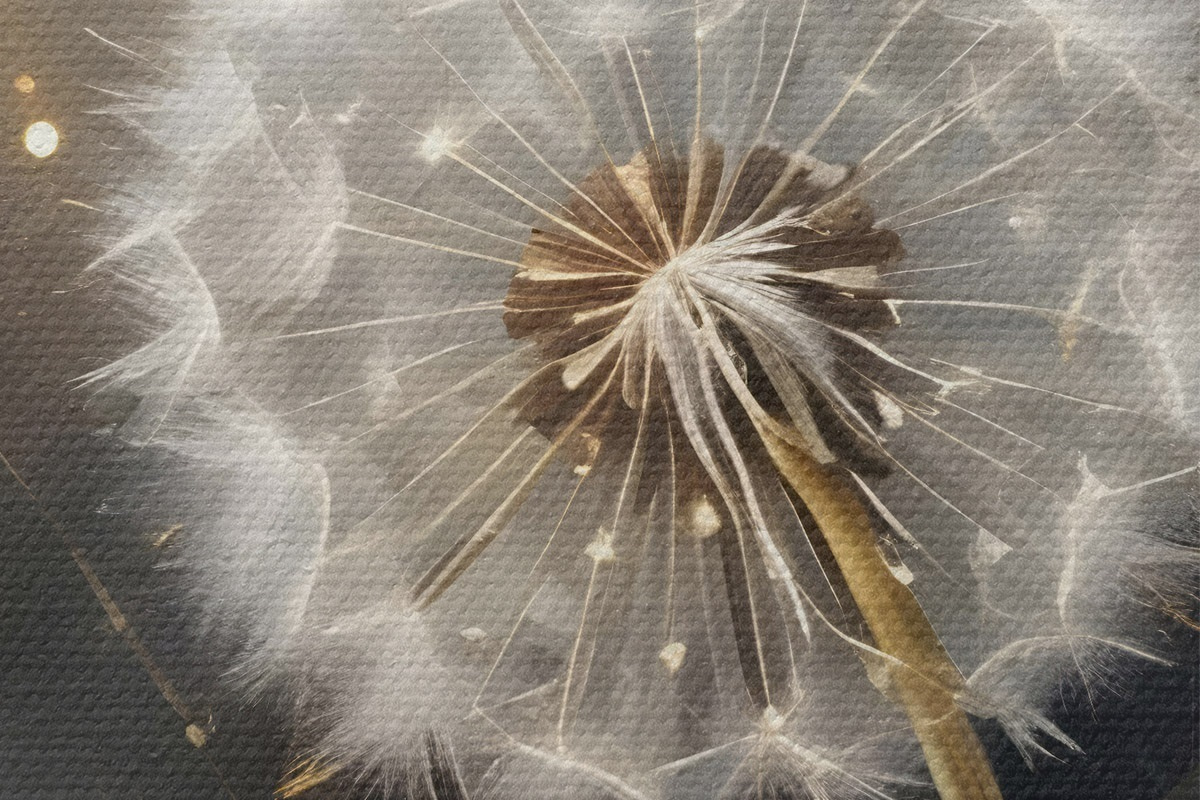 Attēls Pūkainie pieneņu ziedi ar pūkainām baltām sēklu galviņām uz tumša fona, radot burvīgu atmosfēru Nr r42235