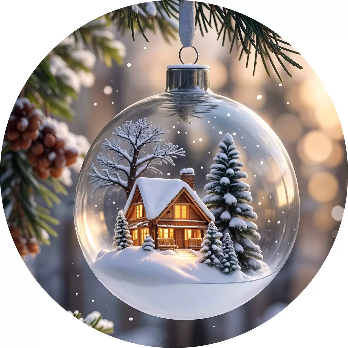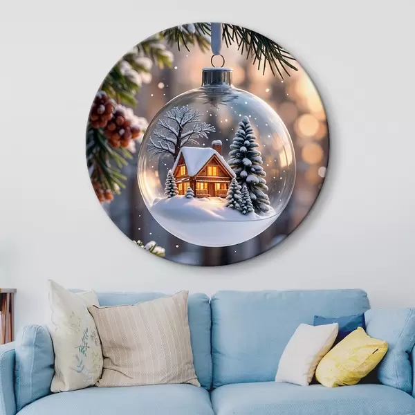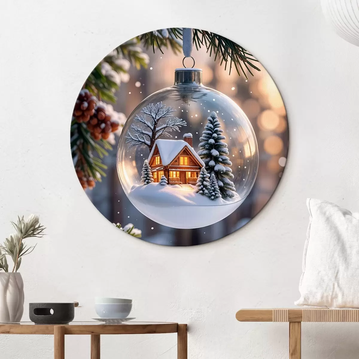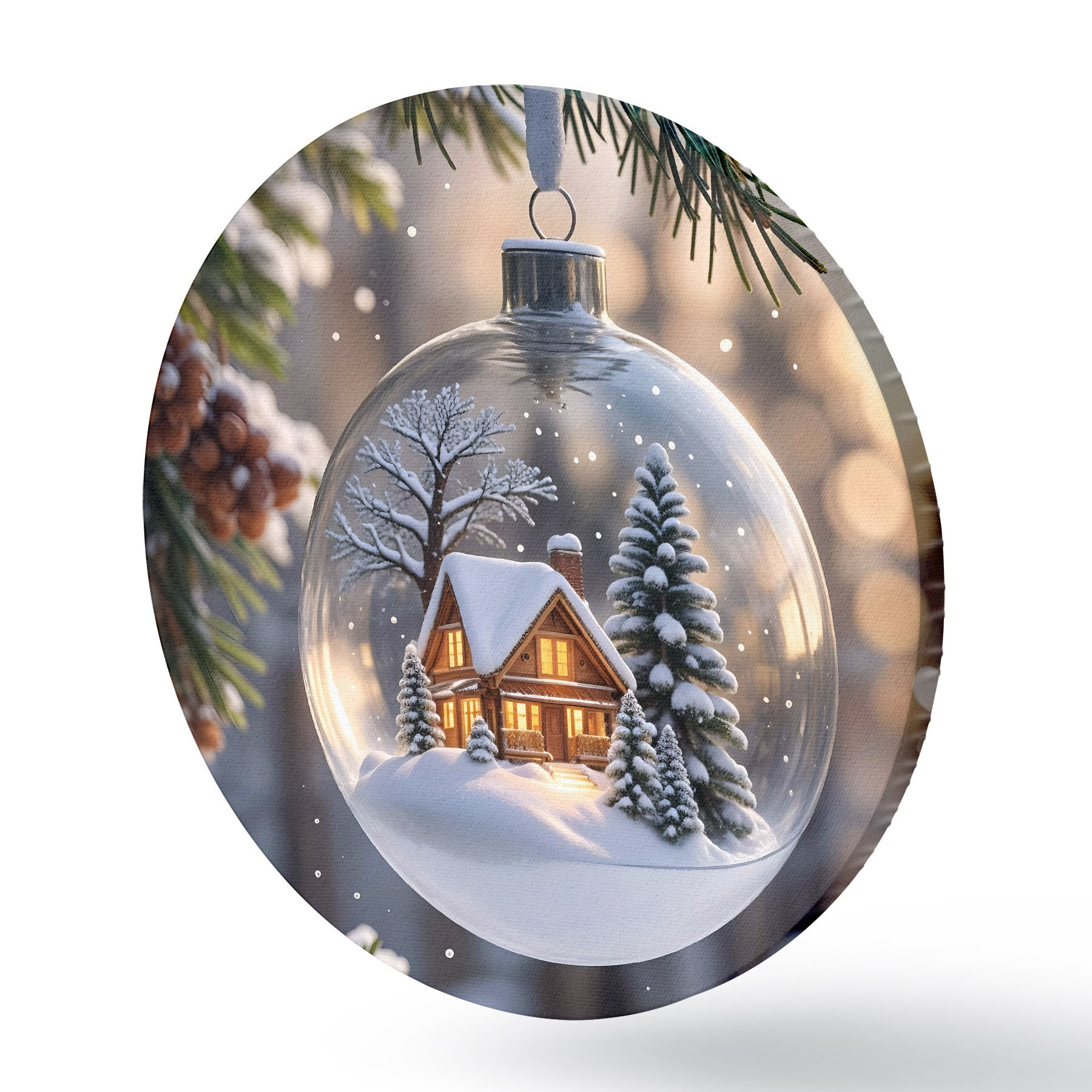 Apaļas gleznas Stikla Ziemassvētku globuss ar sniegotu ziemas ainavu iekšpusē, kurā attēlota mājīga mājiņa mežā ar priedēm r42236