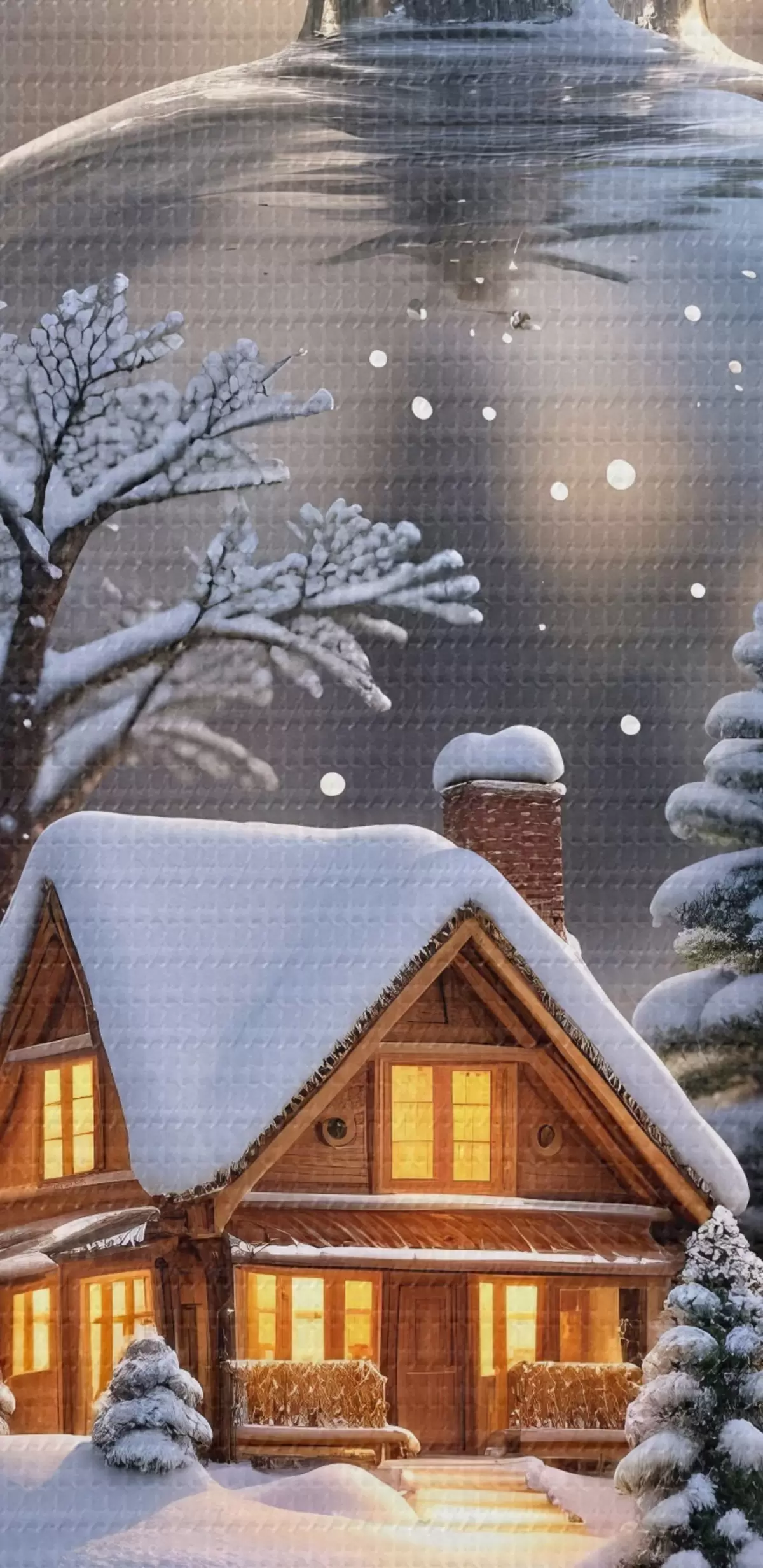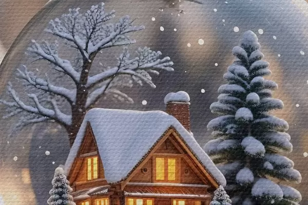 Attēls Stikla Ziemassvētku globuss ar sniegotu ziemas ainavu iekšpusē, kurā attēlota mājīga mājiņa mežā ar priedēm Nr r42236