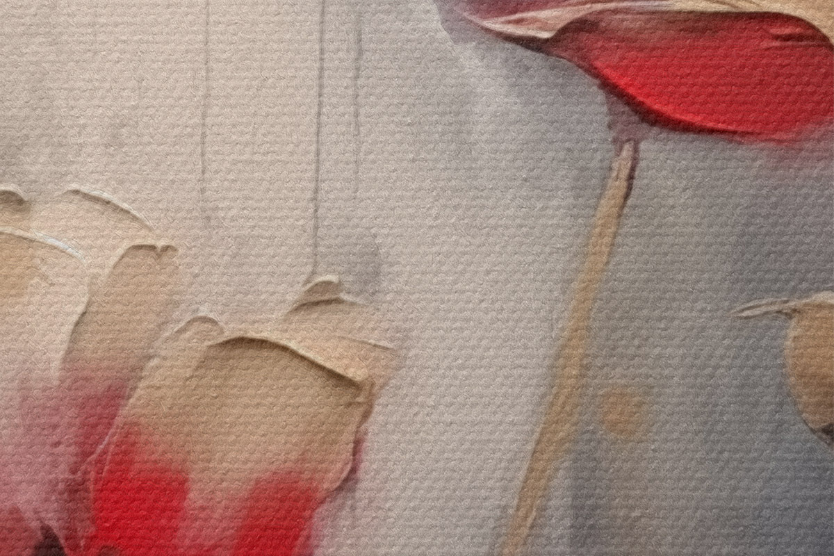 Smalkais diegu pinums uz šī audekla atgādina profesionālu mākslinieku audeklu virsmu.
