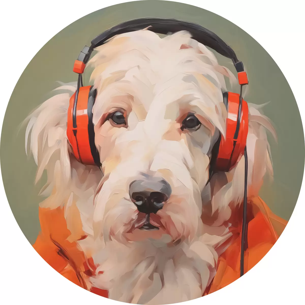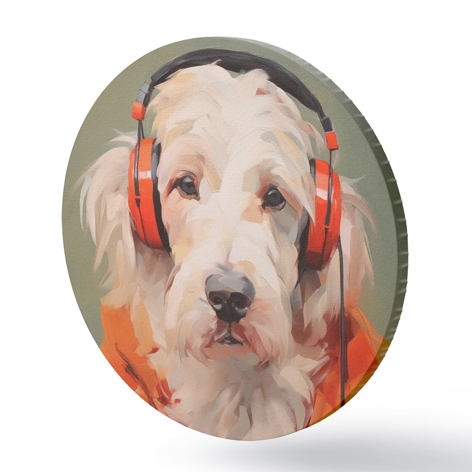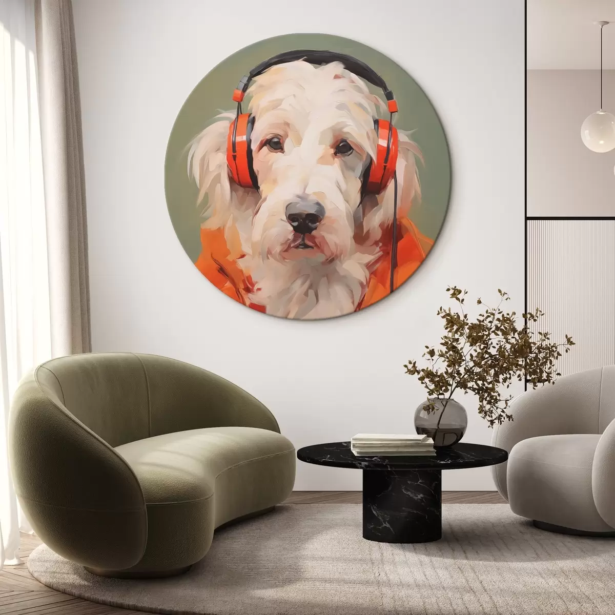 Apaļas gleznas Balts suns ar oranžu jaku un austiņu imitācijas glezniecību r42364