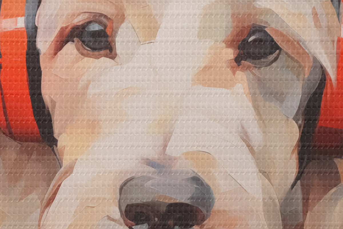 Attēls Balts suns ar oranžu jaku un austiņu imitācijas glezniecību Nr r42364