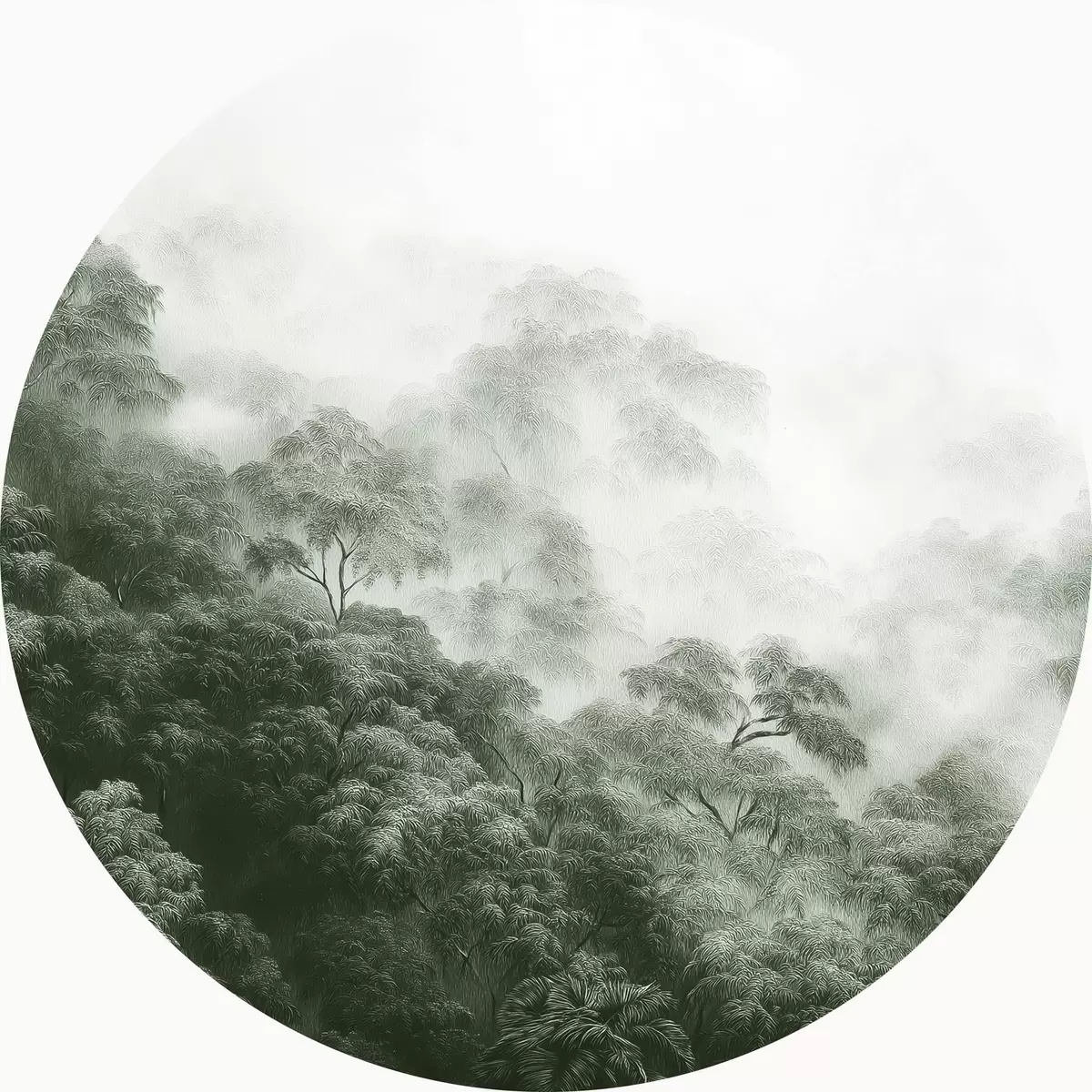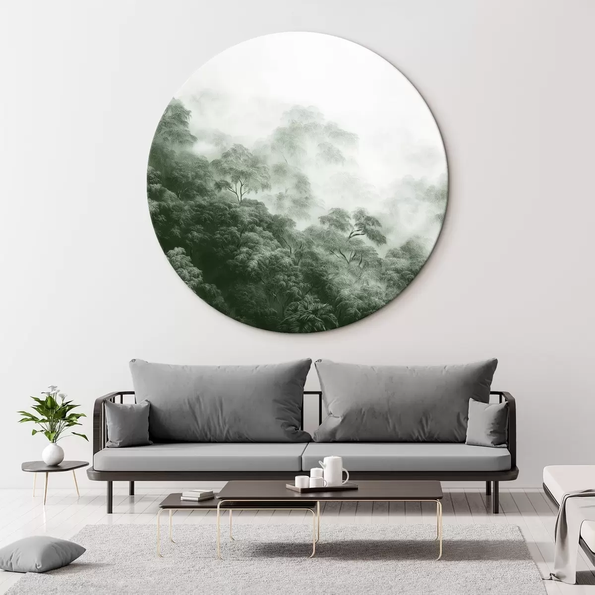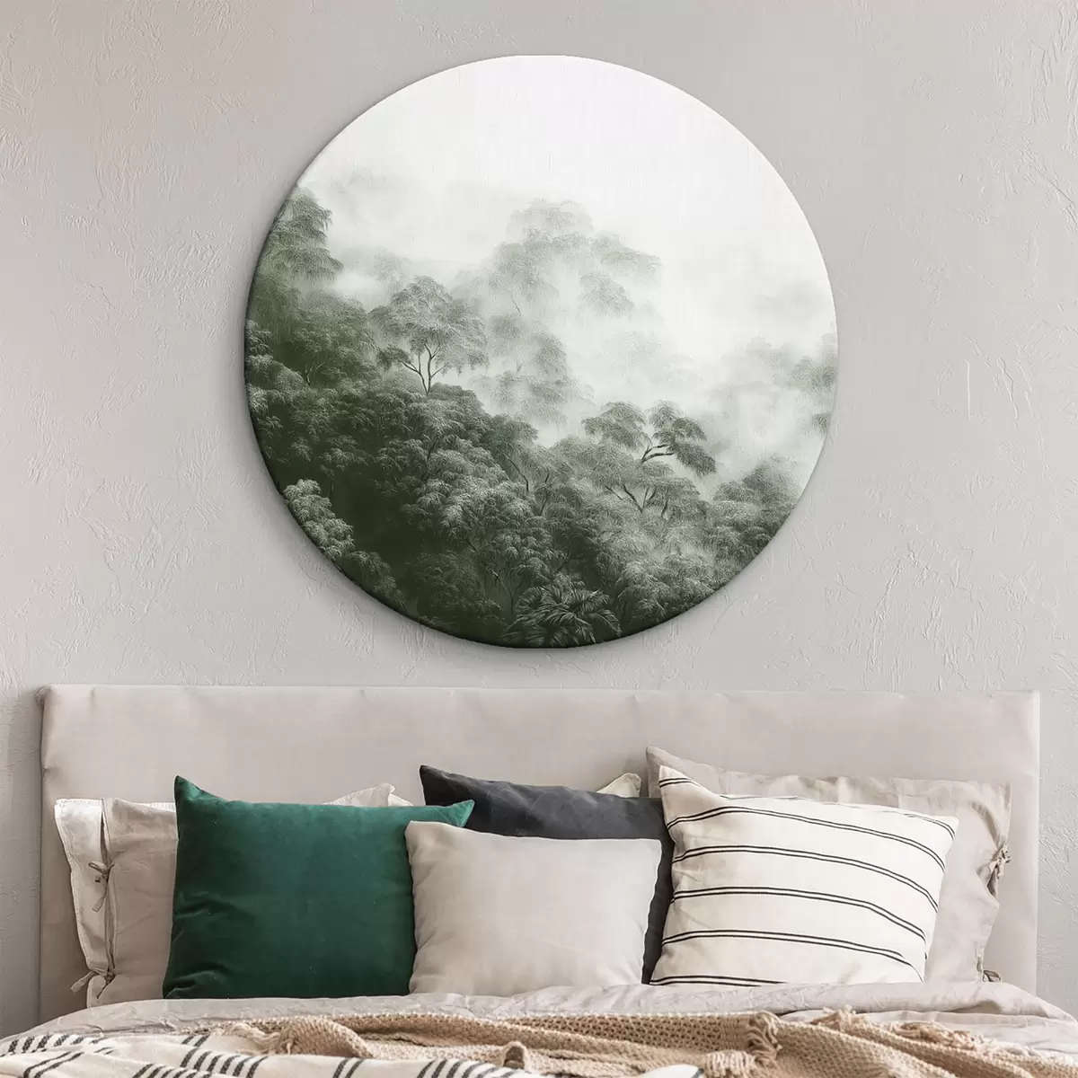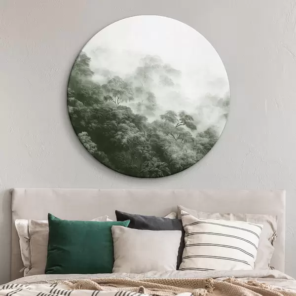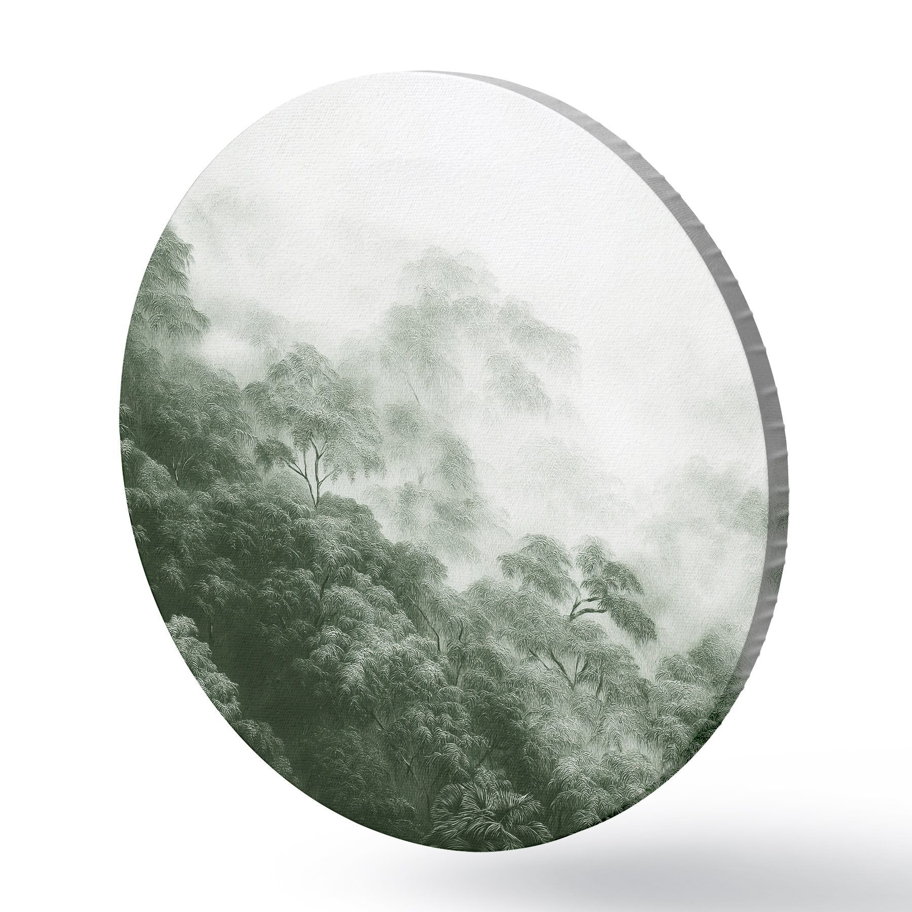 Apaļas gleznas Tropu mežs miglā, palmas, zaļas krāsas r42371