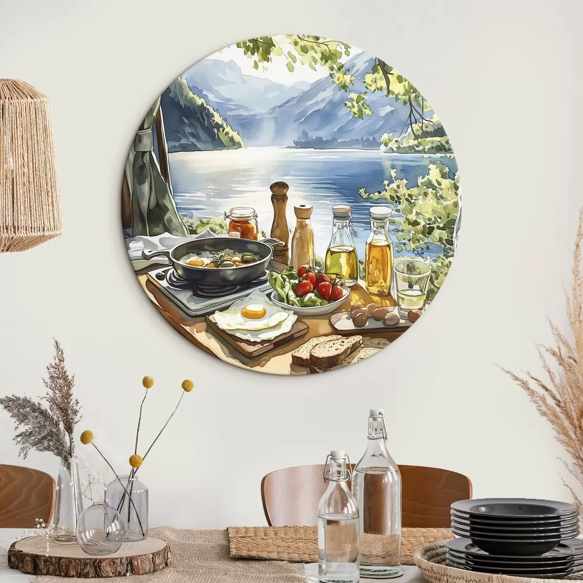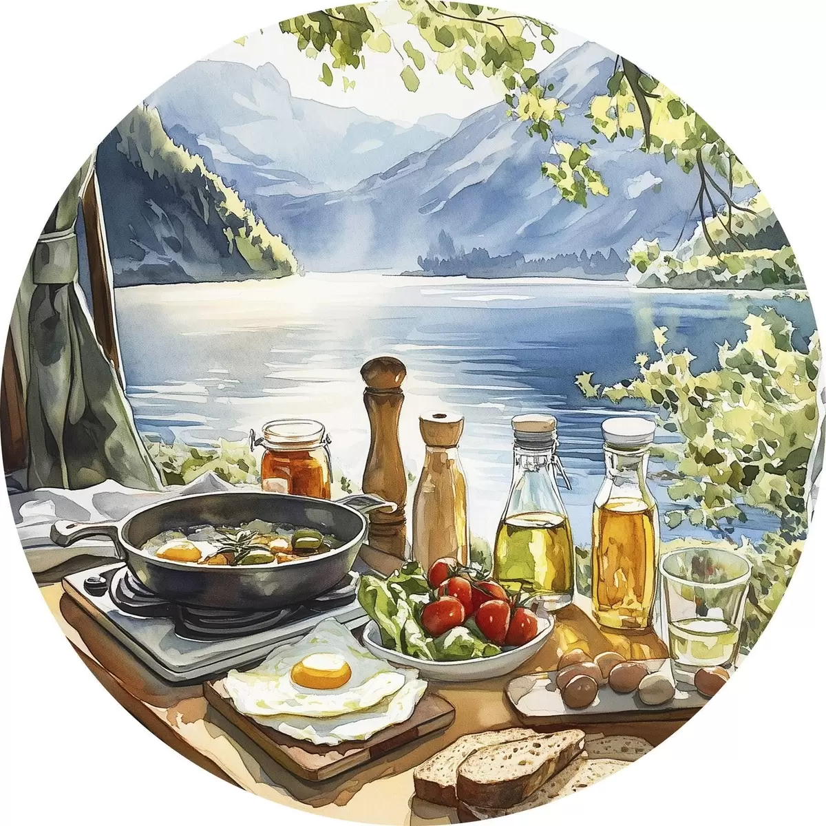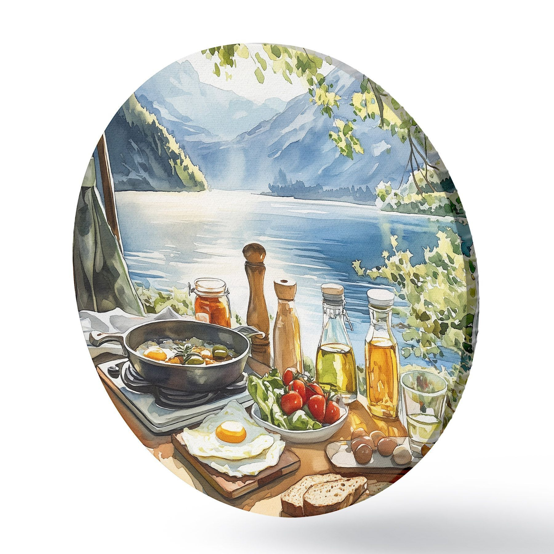 Apaļas gleznas Skaists vasaras rīts, ezers, akvareļu stilā, brokastis, ceļošana r42433