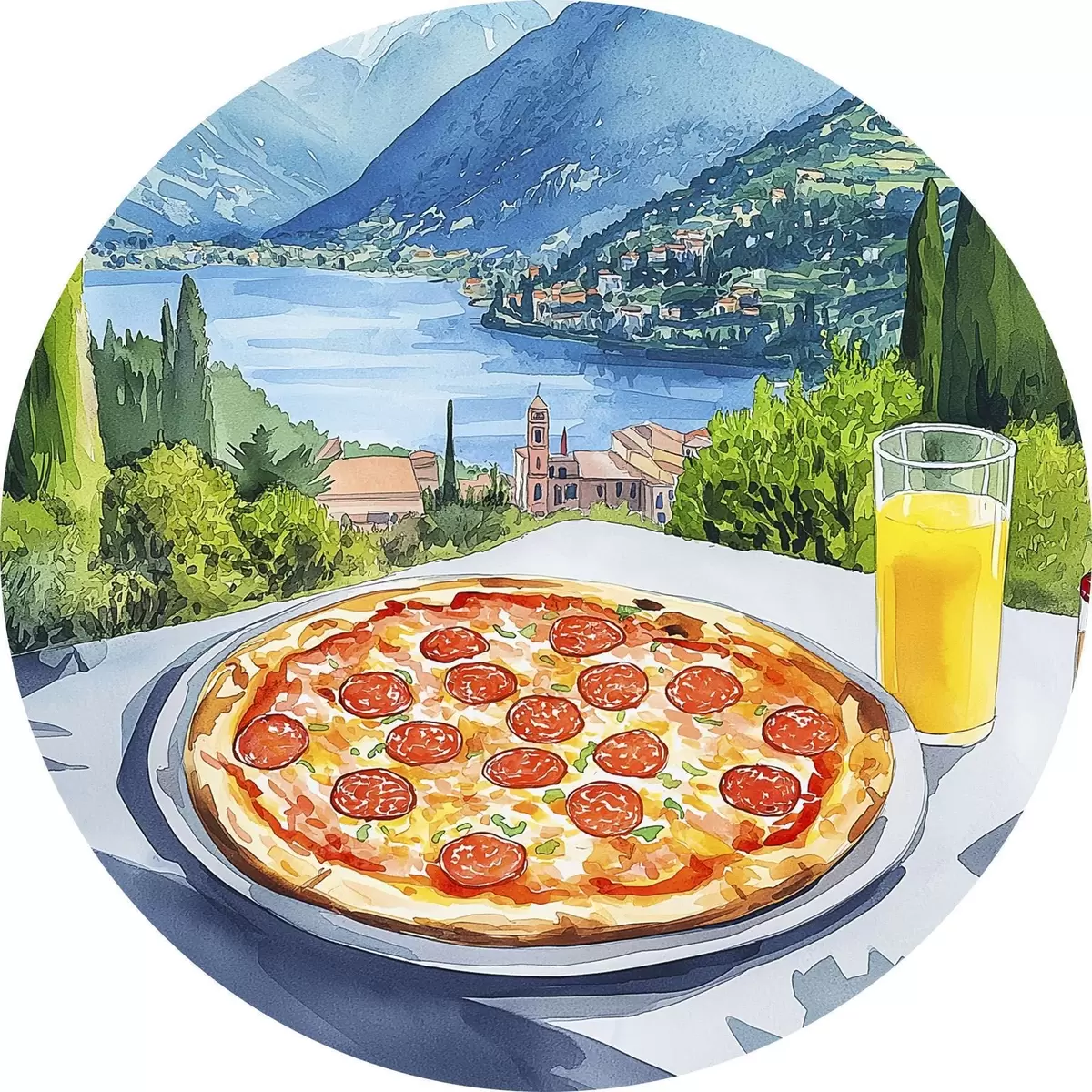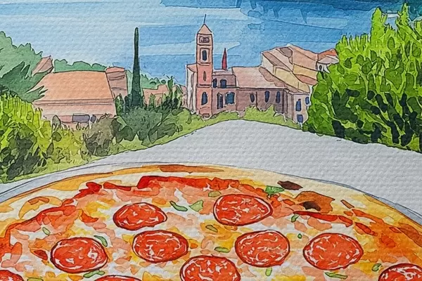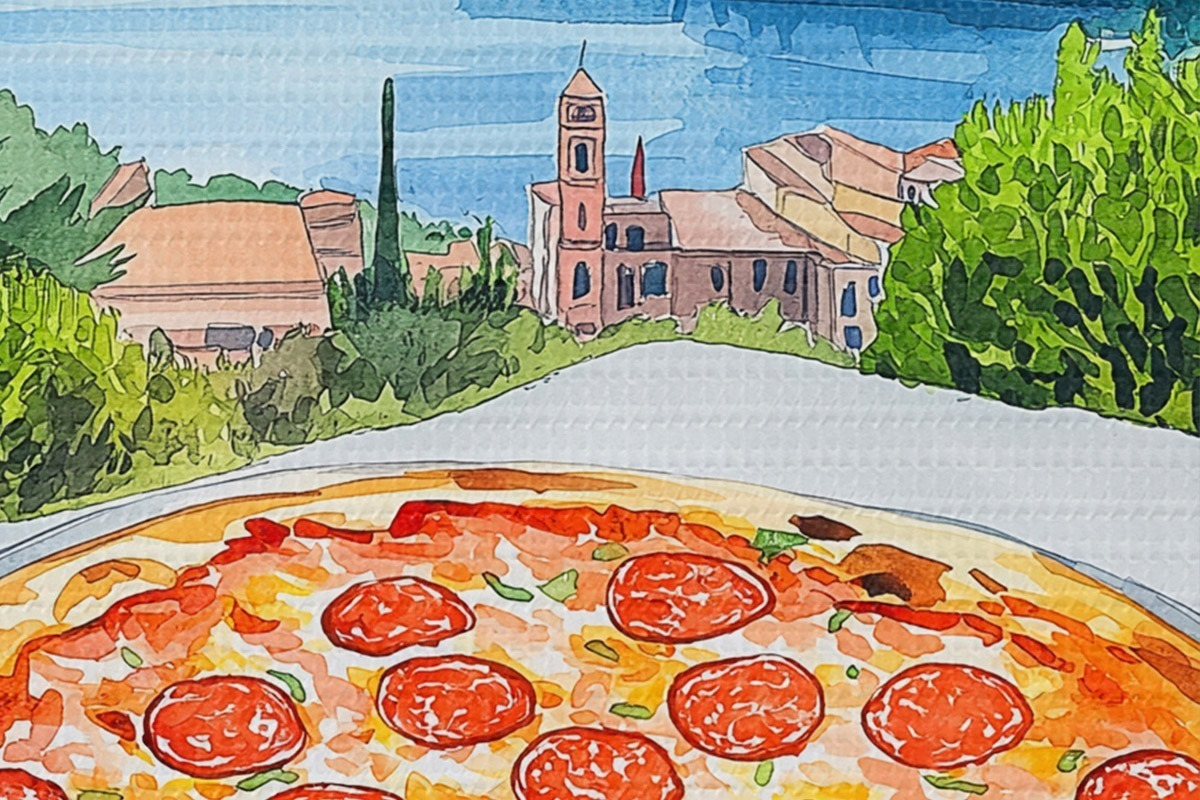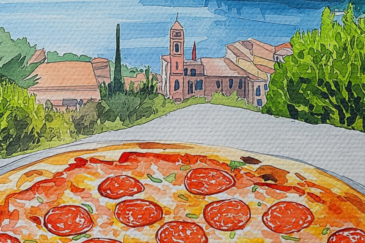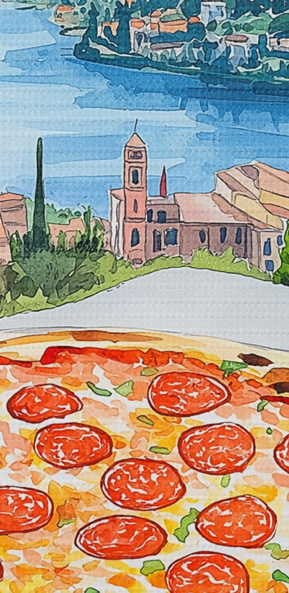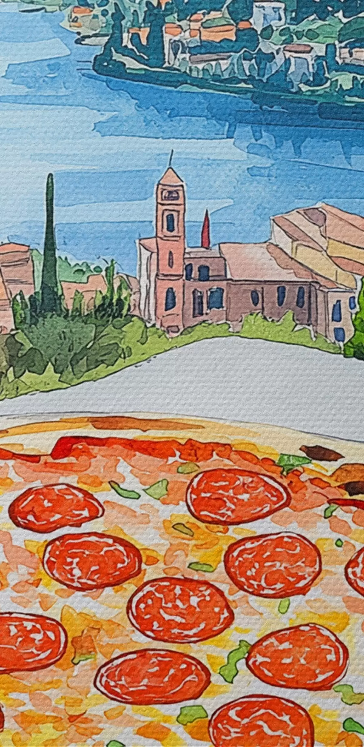 Attēls Akvareļu stils, Itālija, pica, vecpilsēta, kalnu ainava Nr r42435
