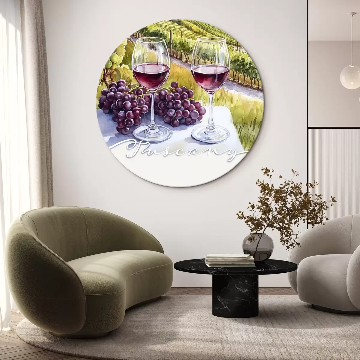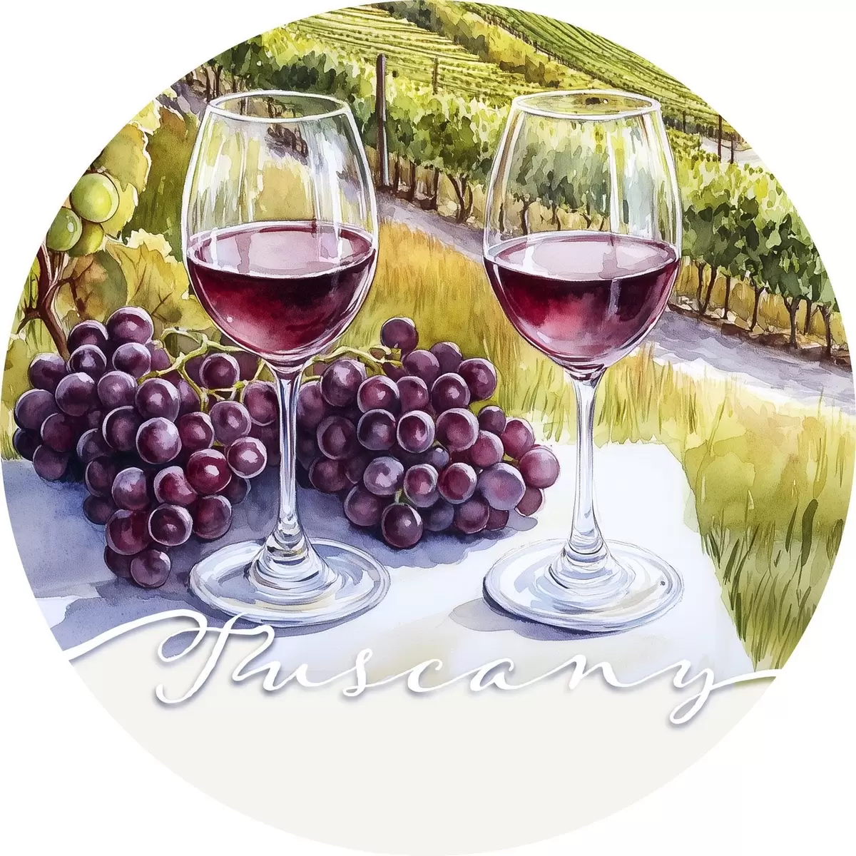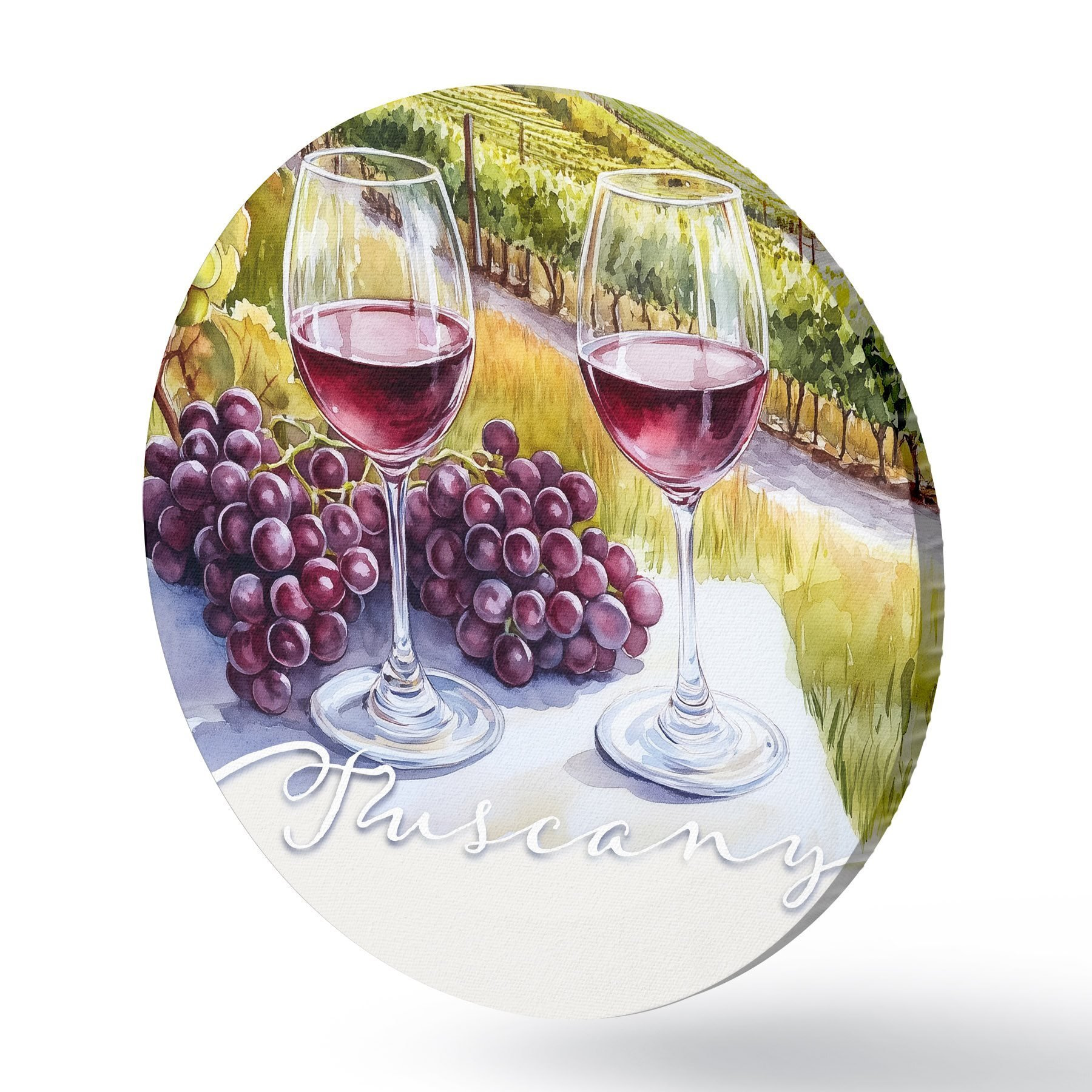 Apaļas gleznas Toskānas ainavas, akvareļu stilā, vīna glāzes, vīnogas, saulriets r42439