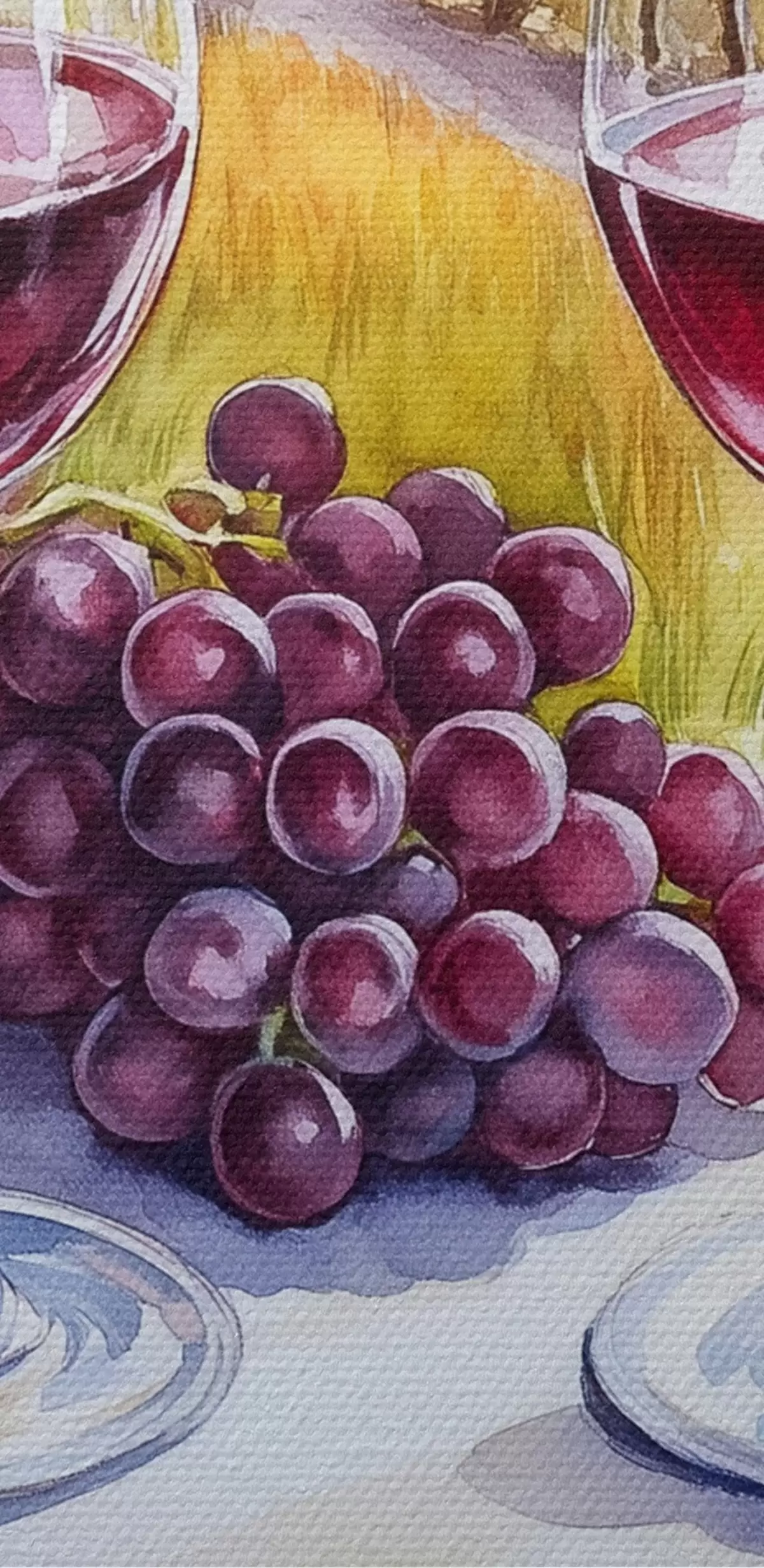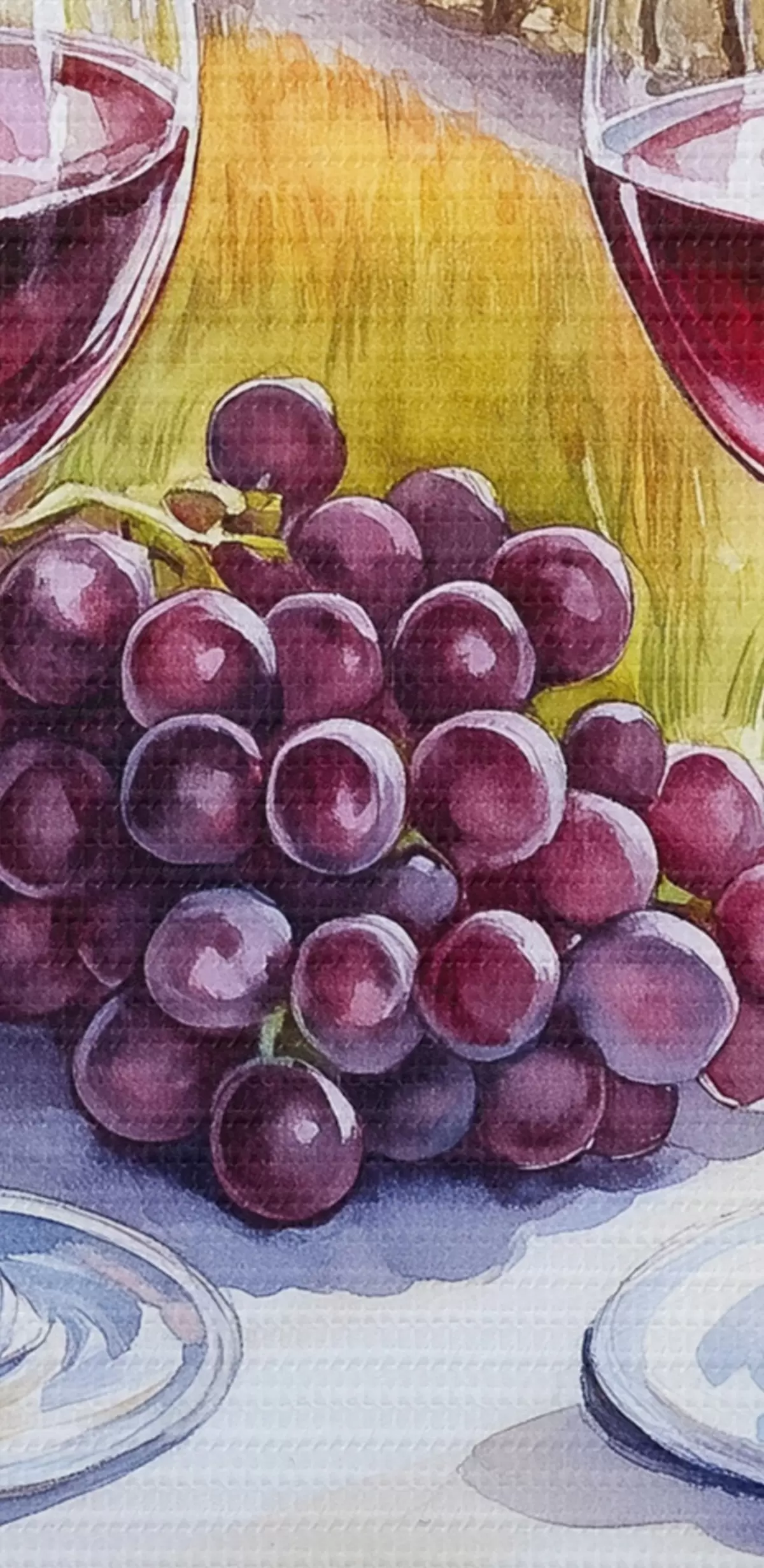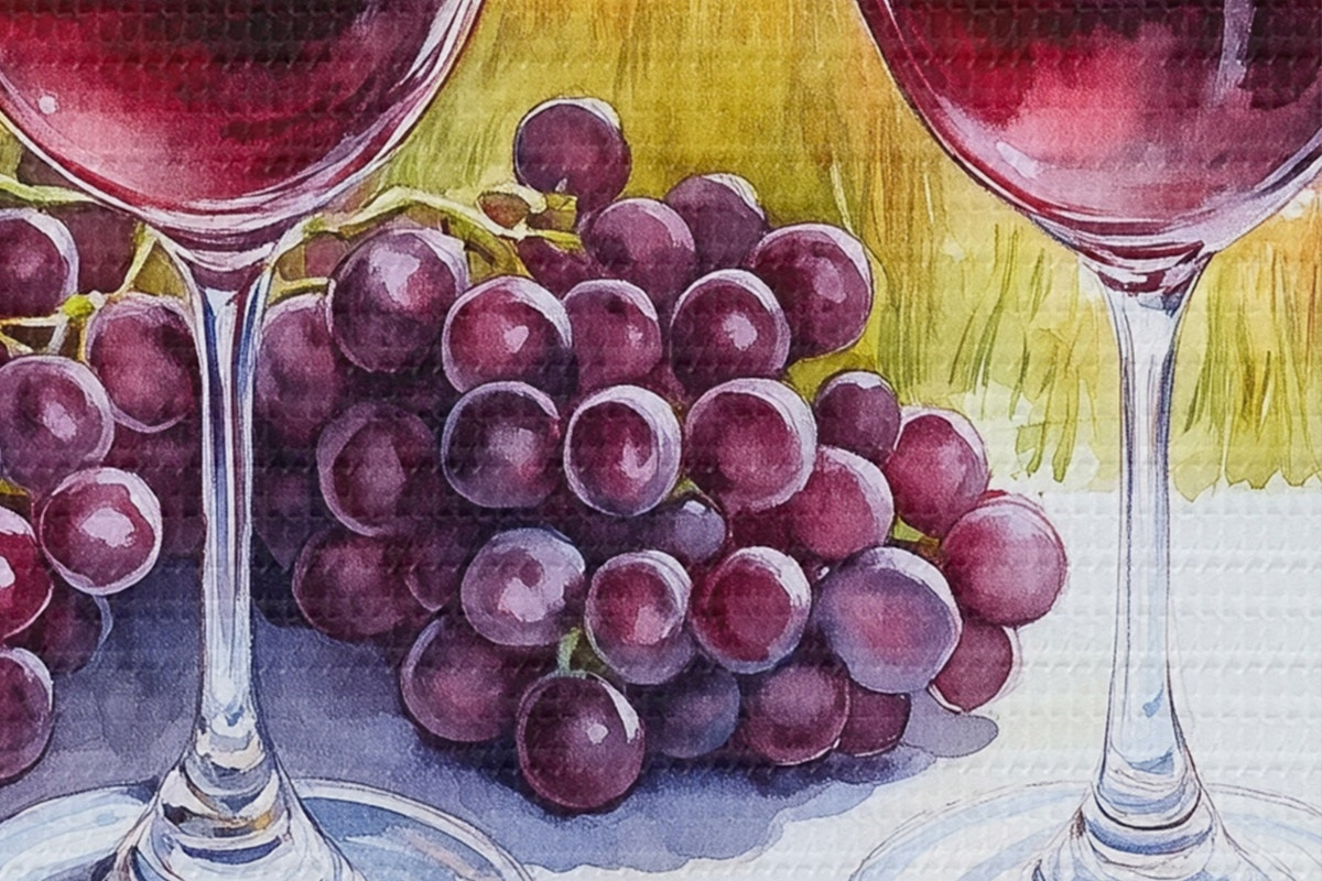 Attēls Toskānas ainavas, akvareļu stilā, vīna glāzes, vīnogas, saulriets Nr r42439