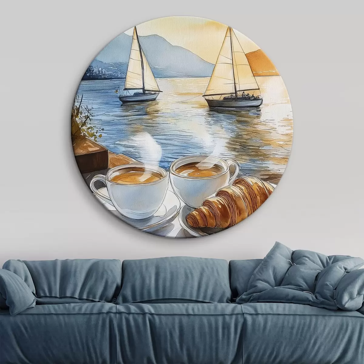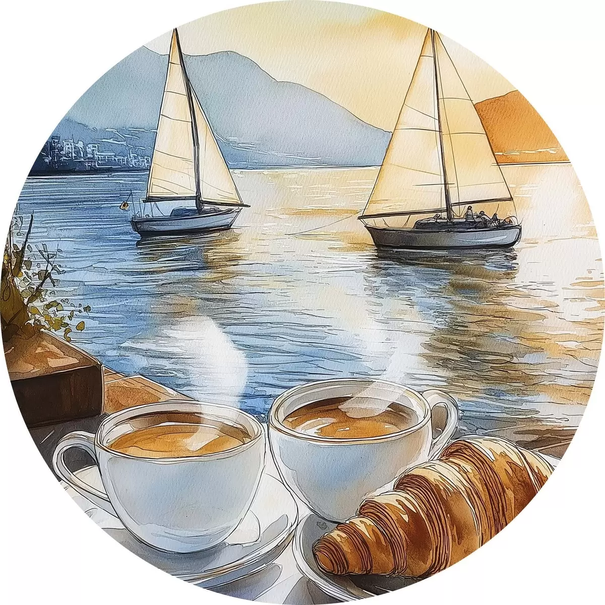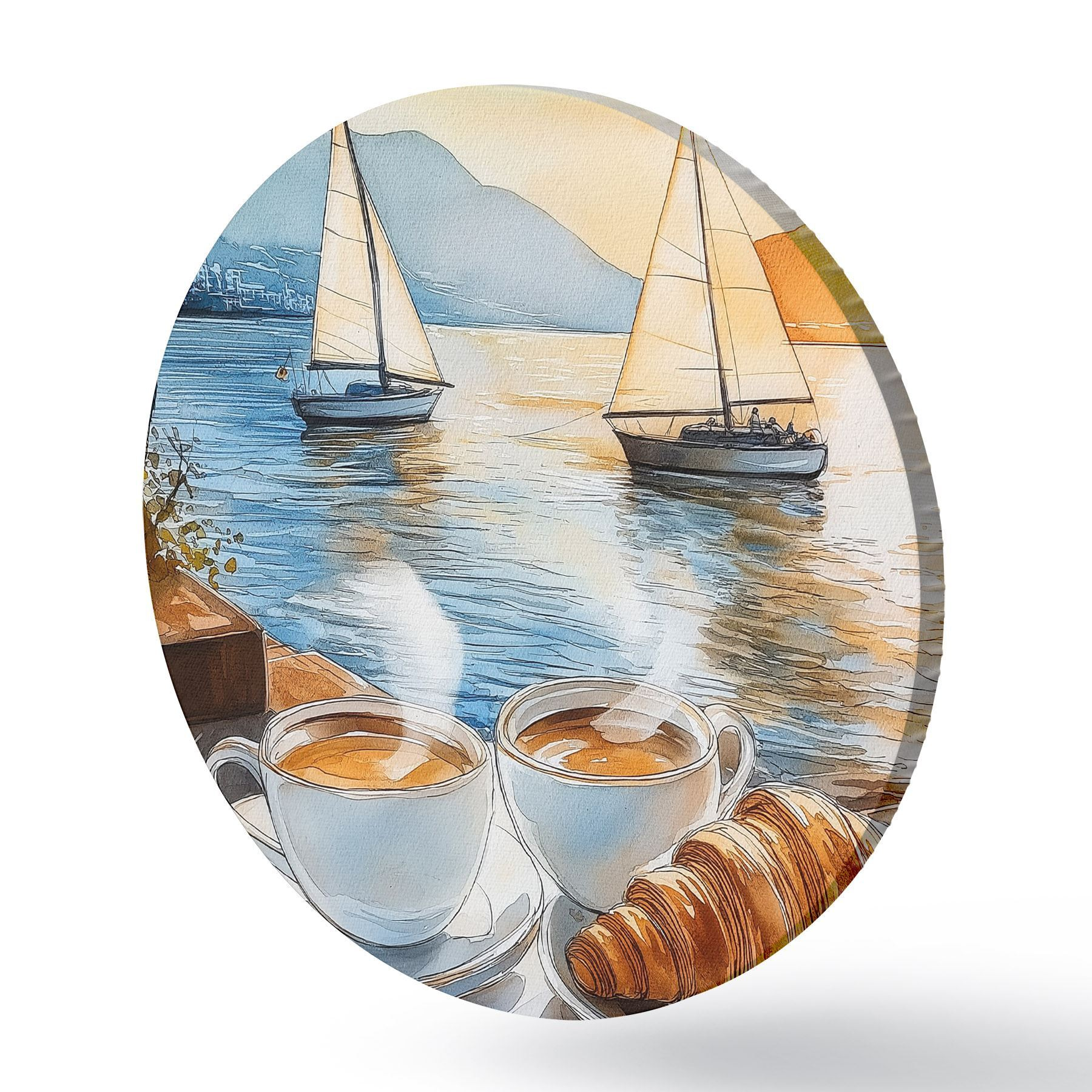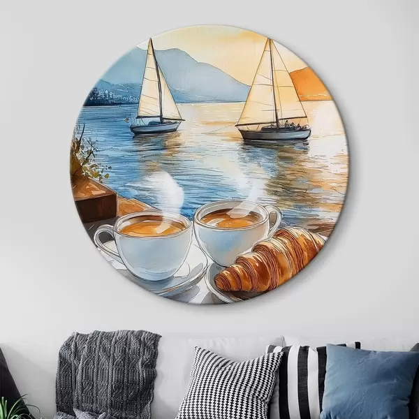 Apaļas gleznas Saulriets uz ezera, buru laivas, kafijas tases, akvareļu stilā r42442