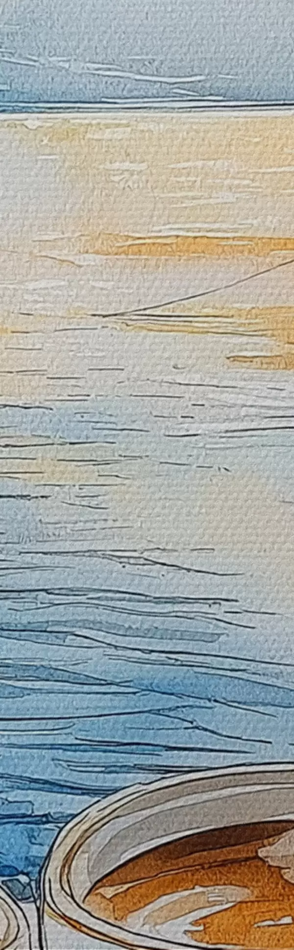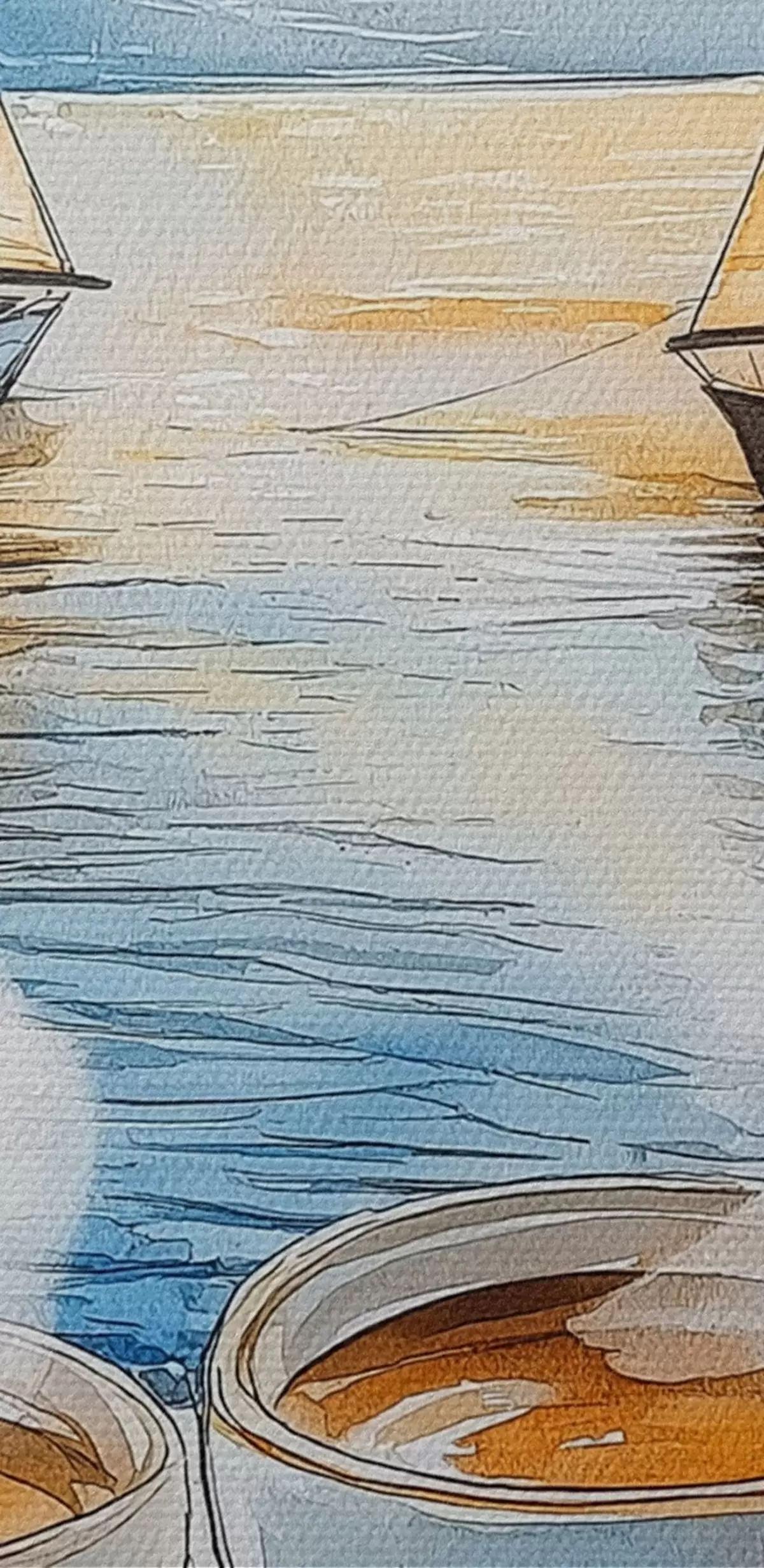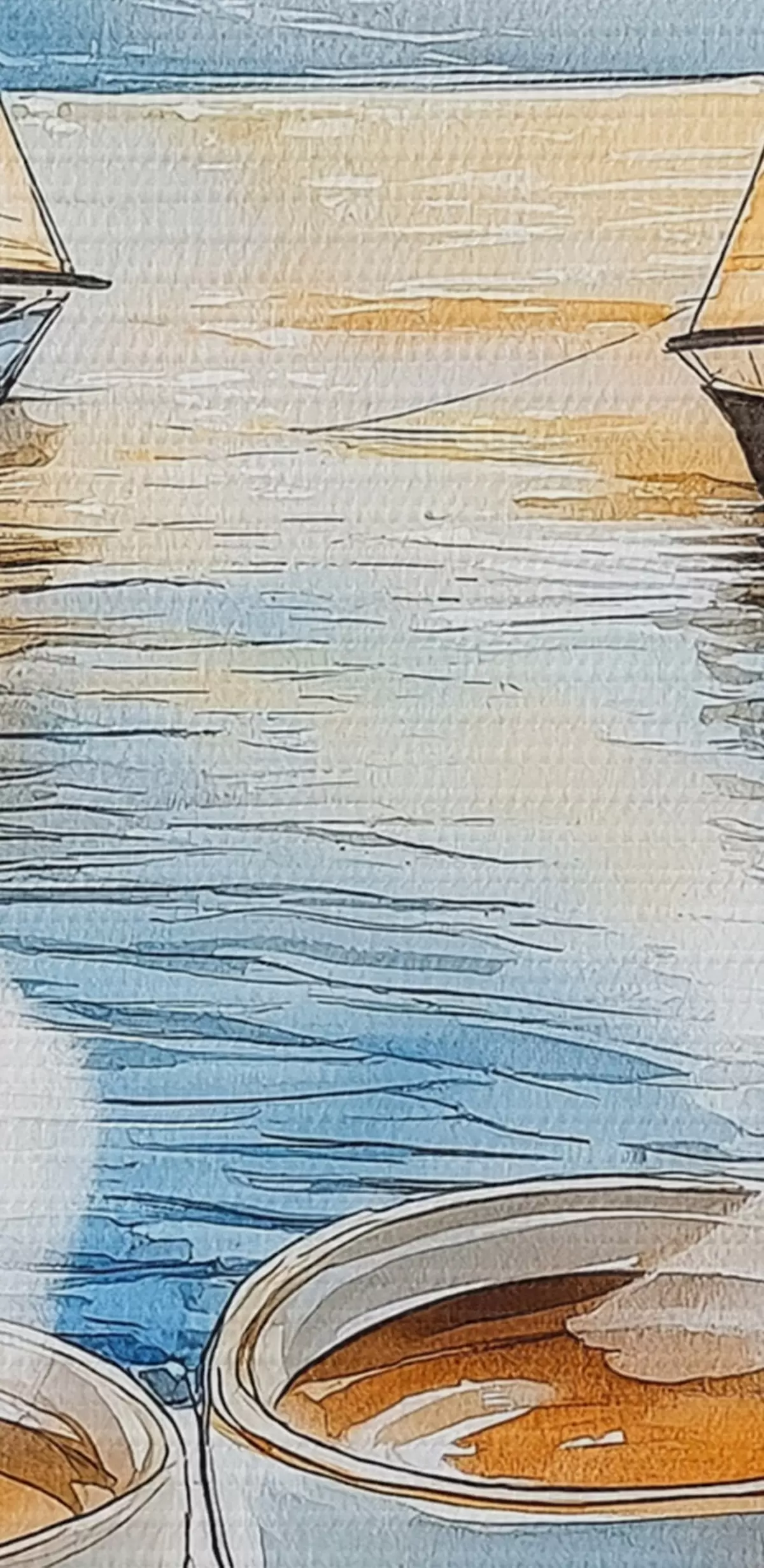 Attēls Saulriets uz ezera, buru laivas, kafijas tases, akvareļu stilā Nr r42442