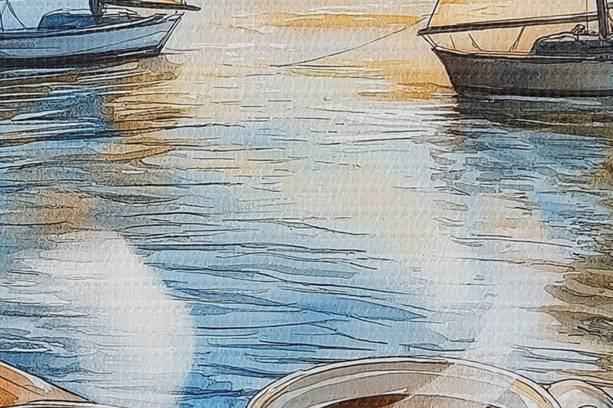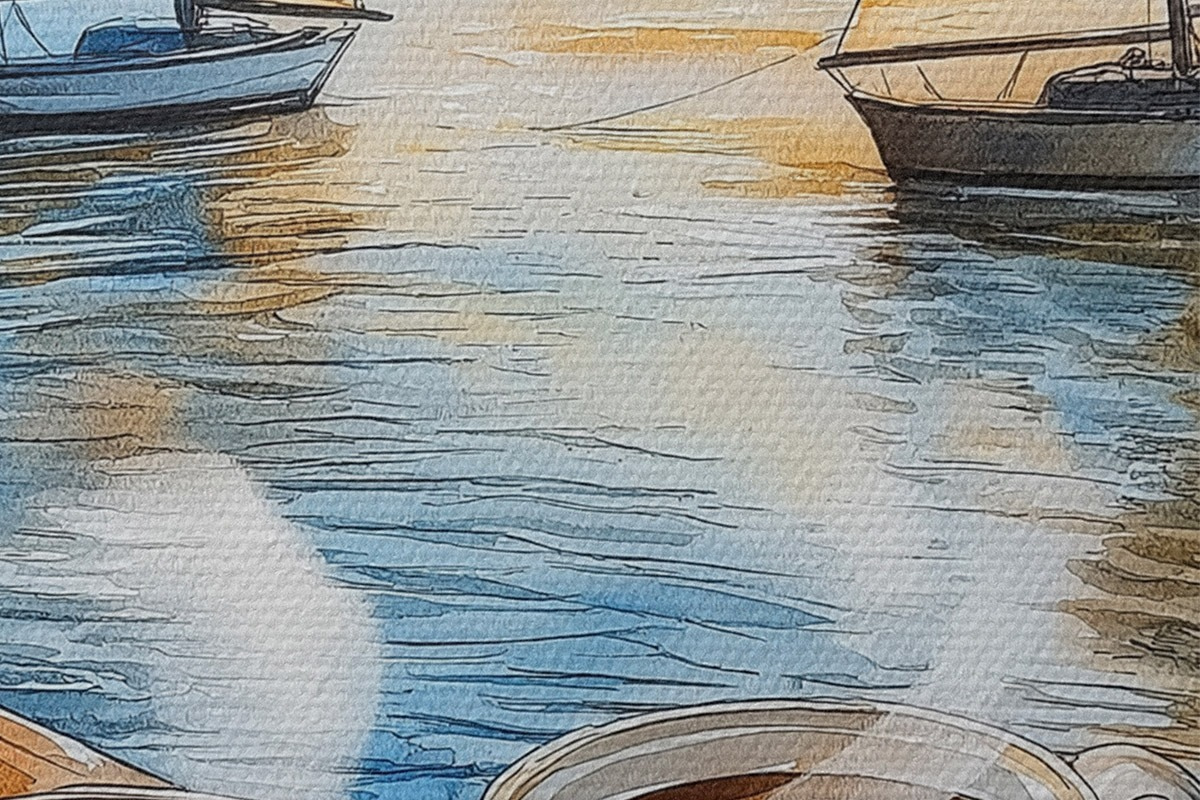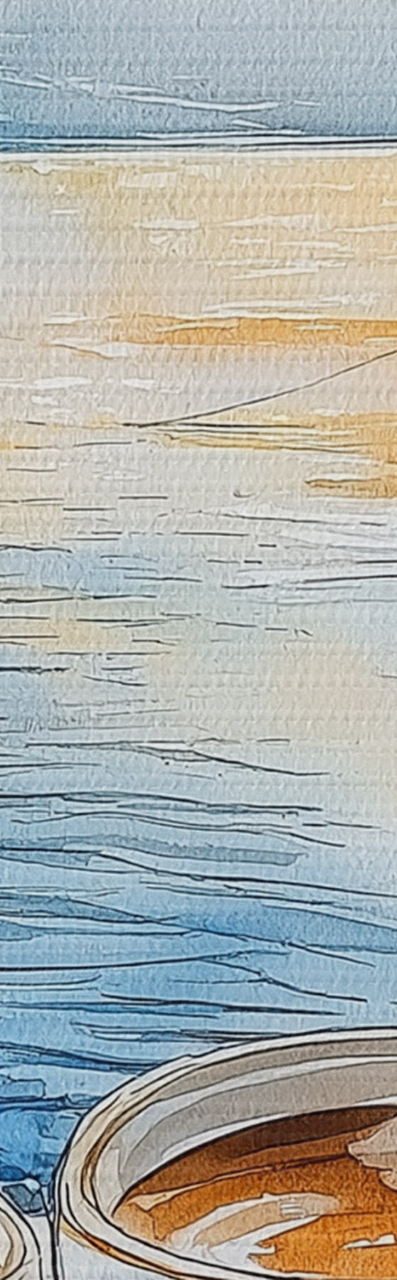 Attēls Saulriets uz ezera, buru laivas, kafijas tases, akvareļu stilā Nr r42442