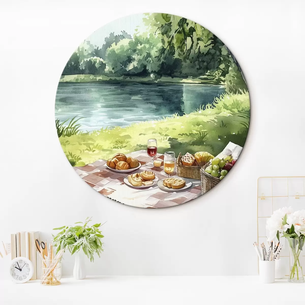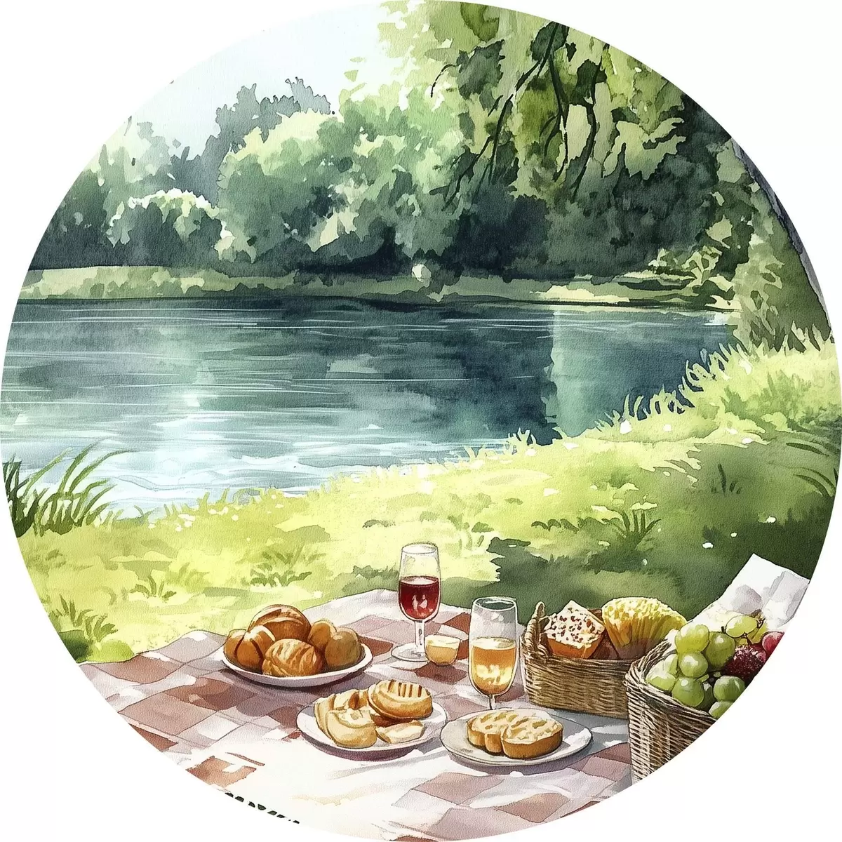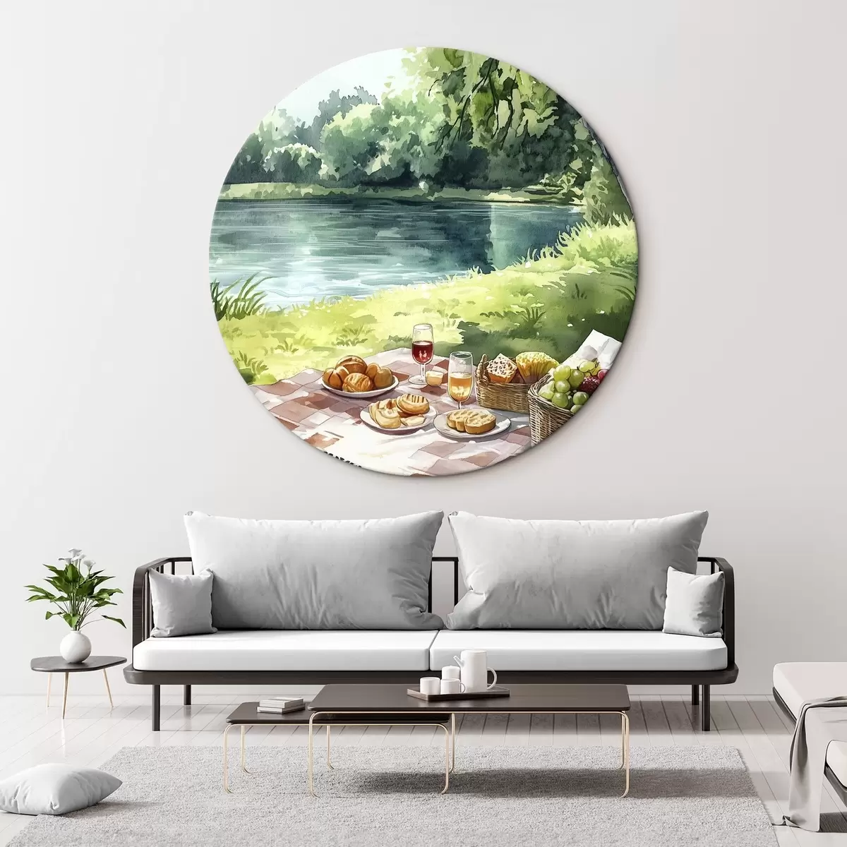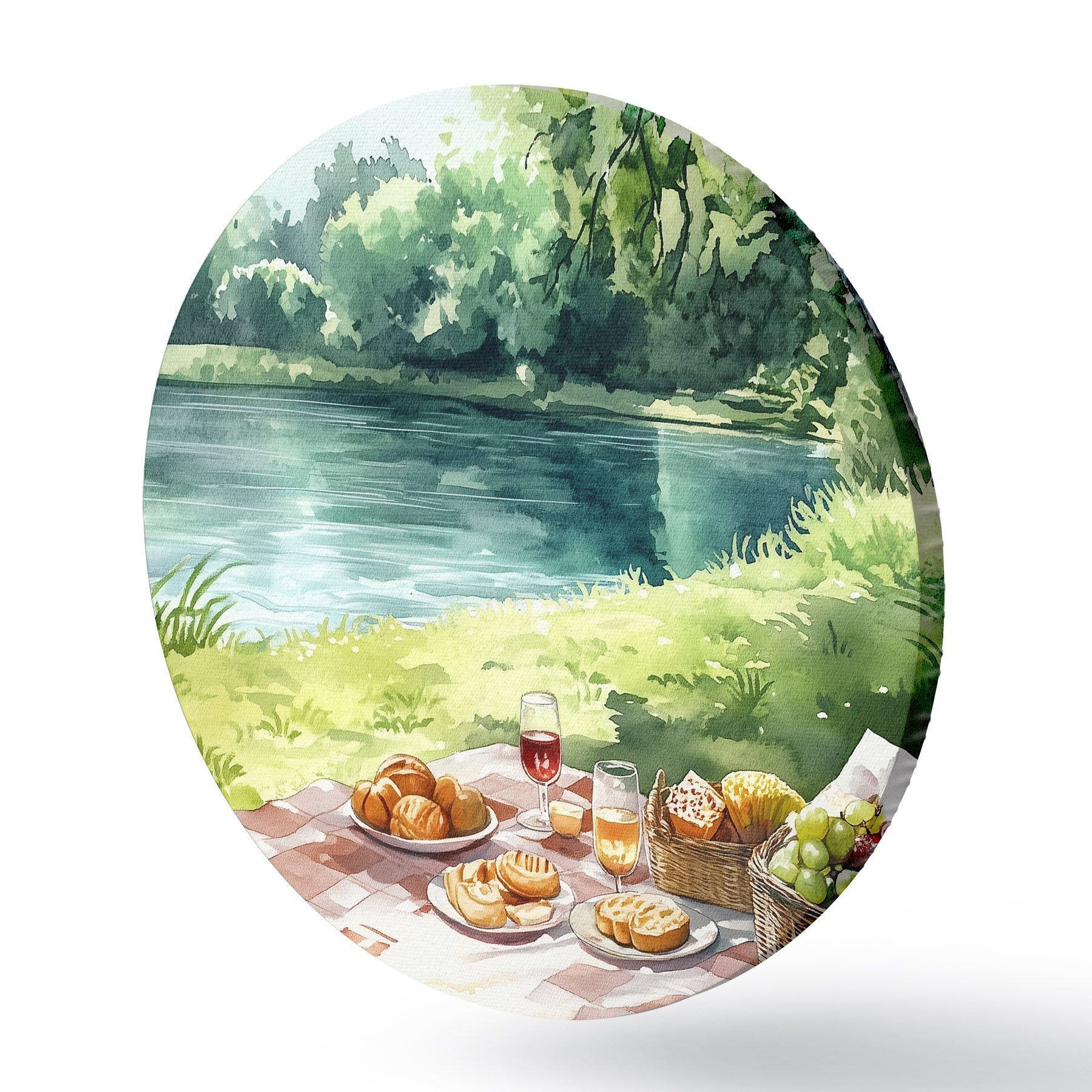 Apaļas gleznas Skaists romantisks pikniks pie vasaras ezera, augļi, zaļumi r42451