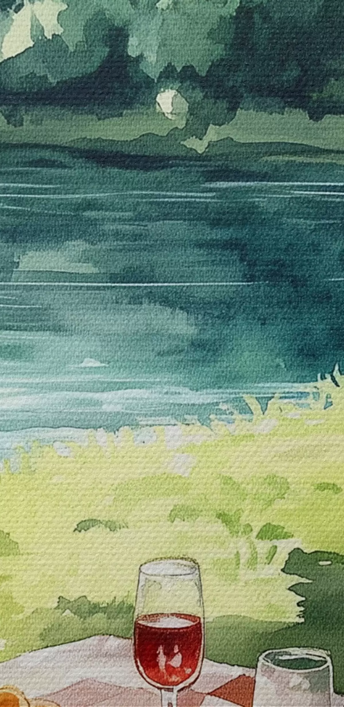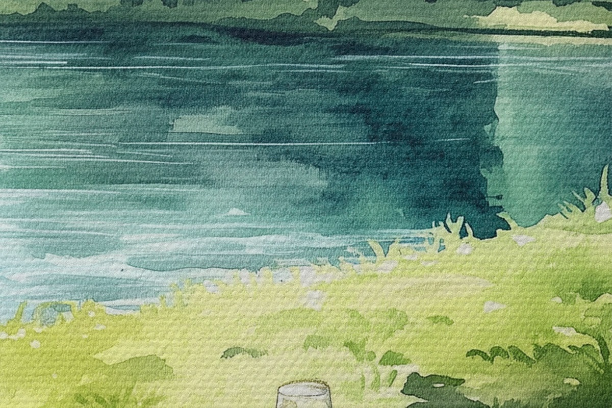 Attēls Skaists romantisks pikniks pie vasaras ezera, augļi, zaļumi Nr r42451