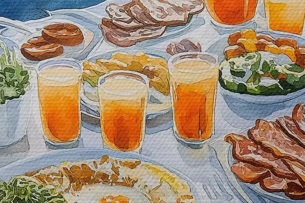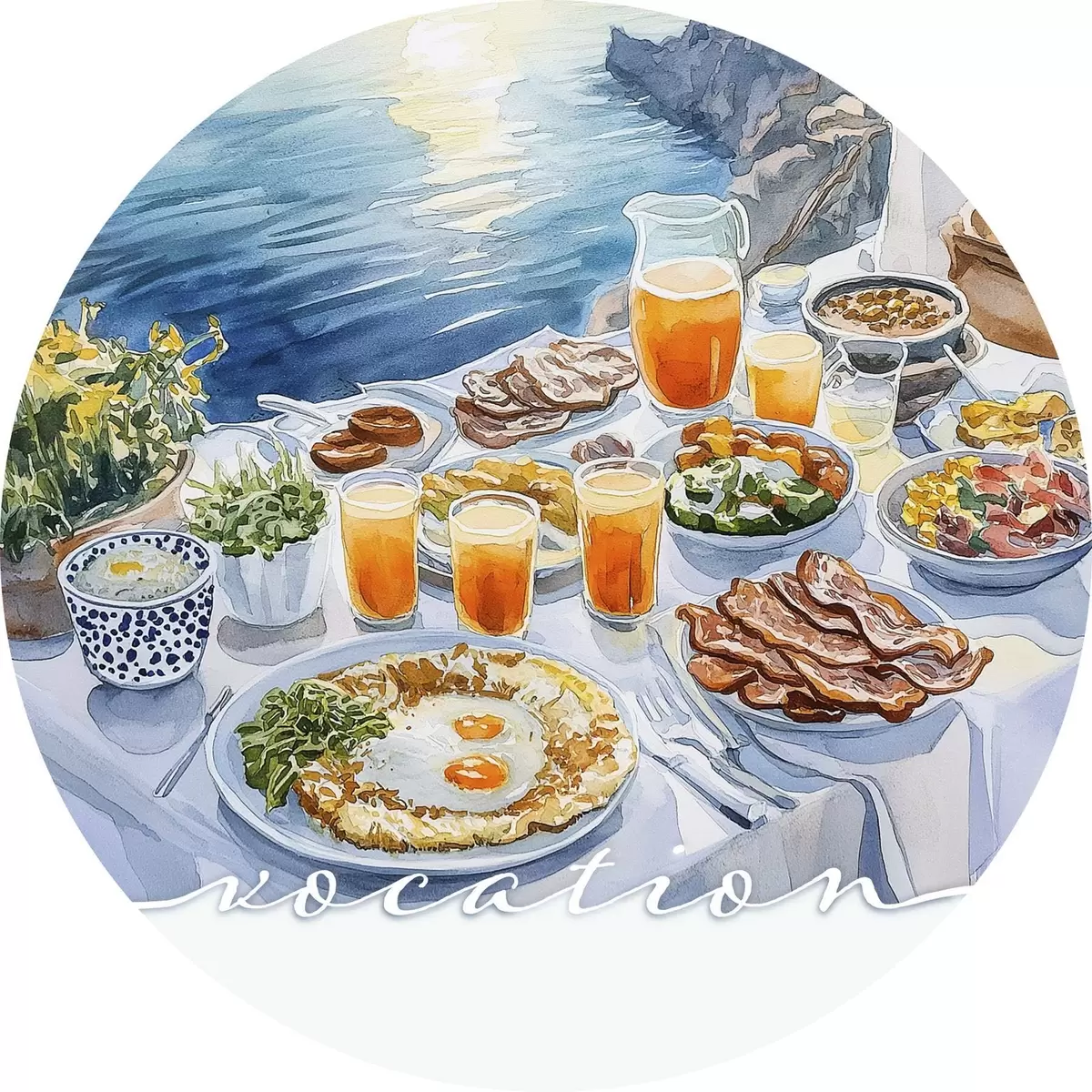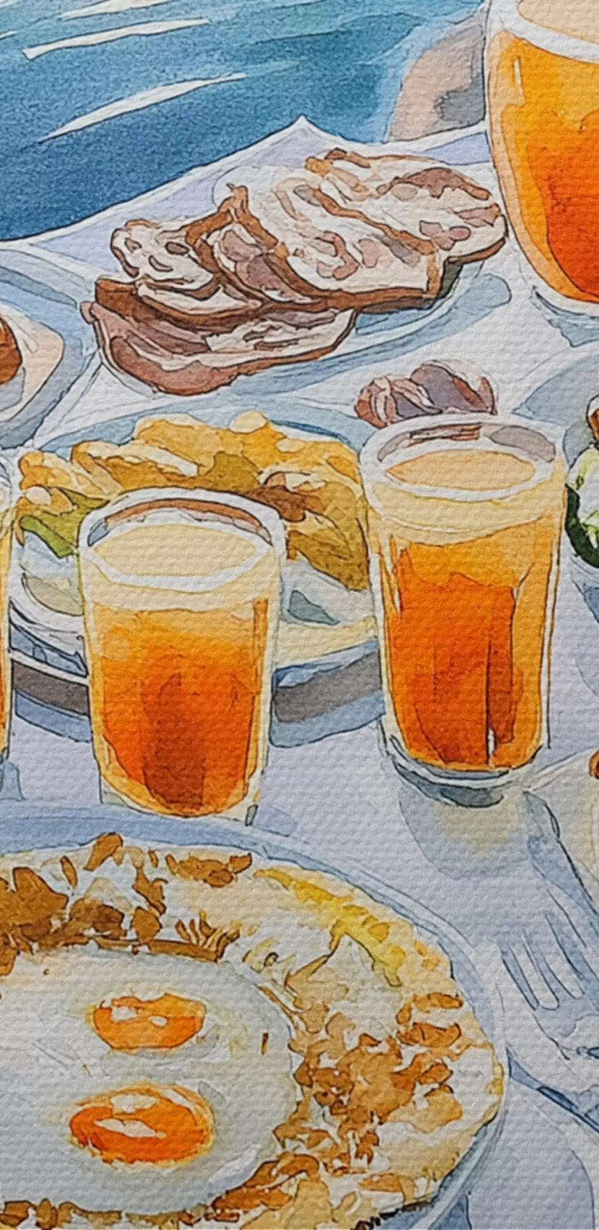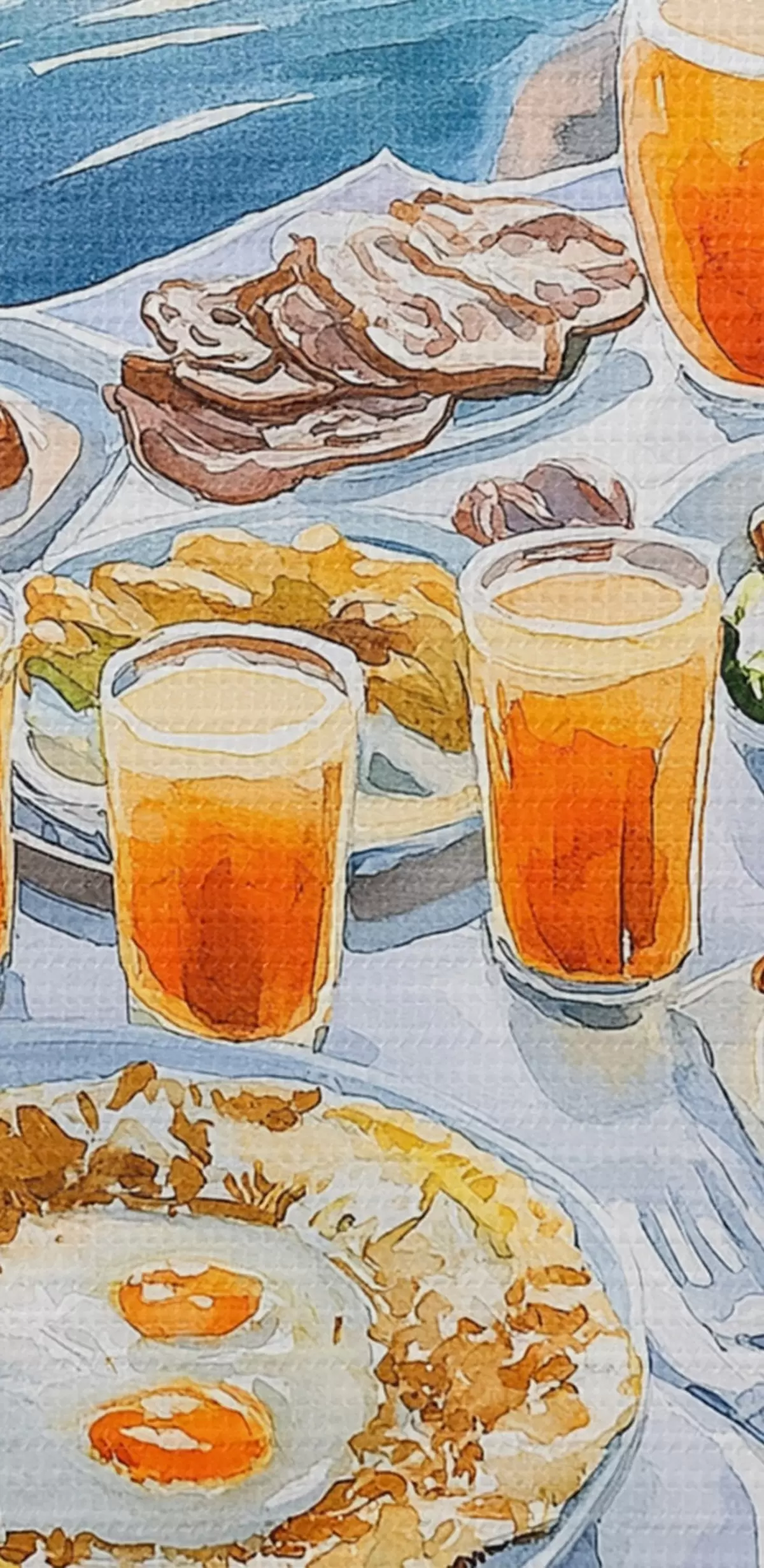 Attēls Romantiska atpūta Grieķijā, akvareļu stilā, brokastis, saullēkts Nr r42453