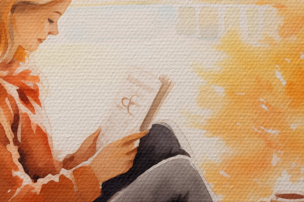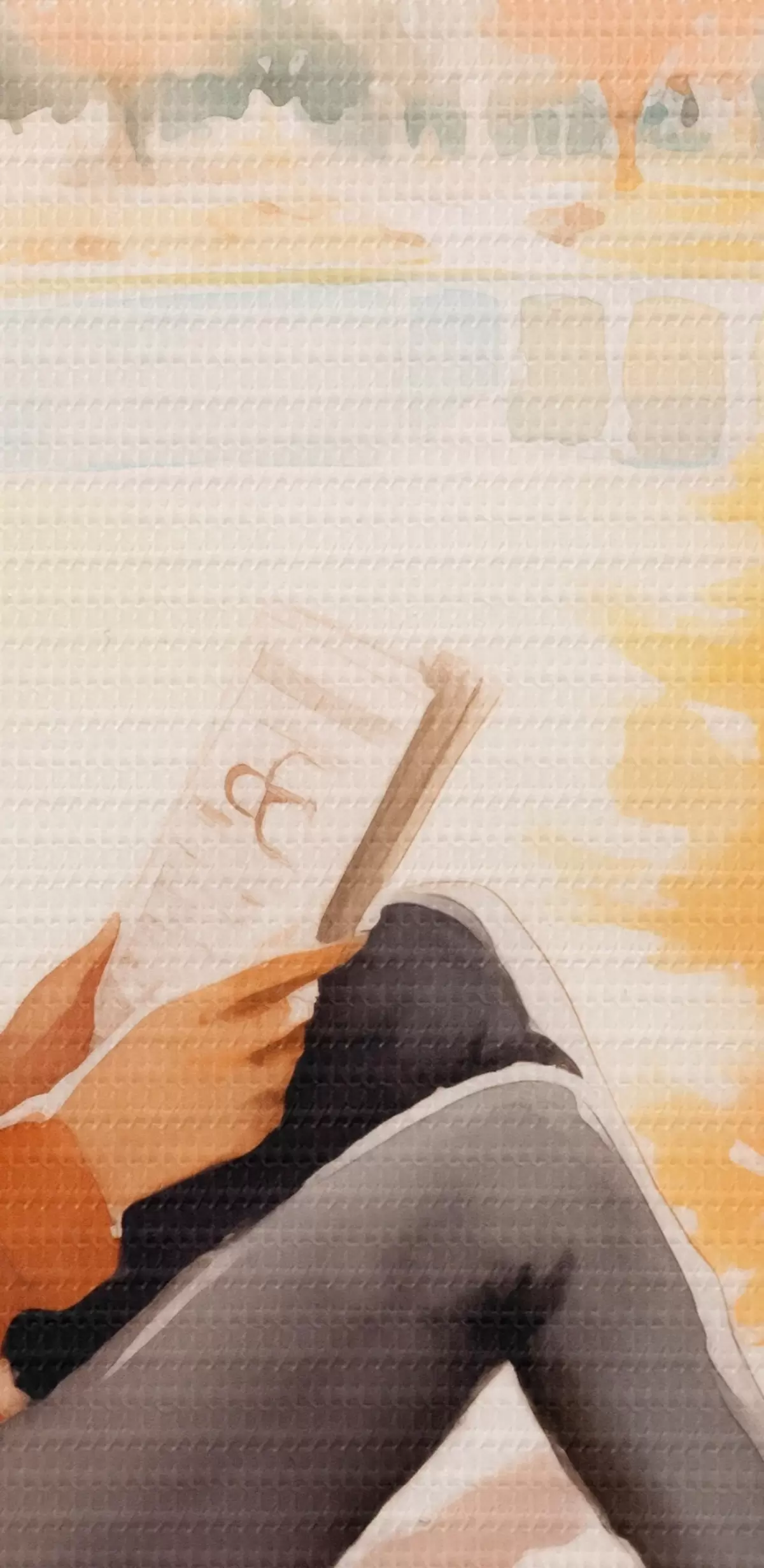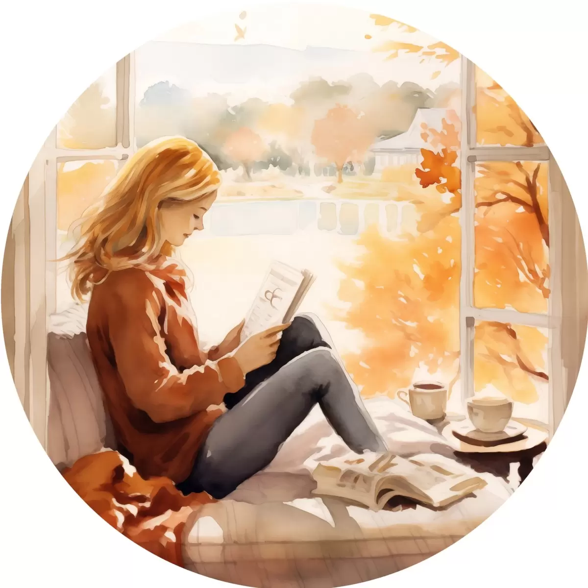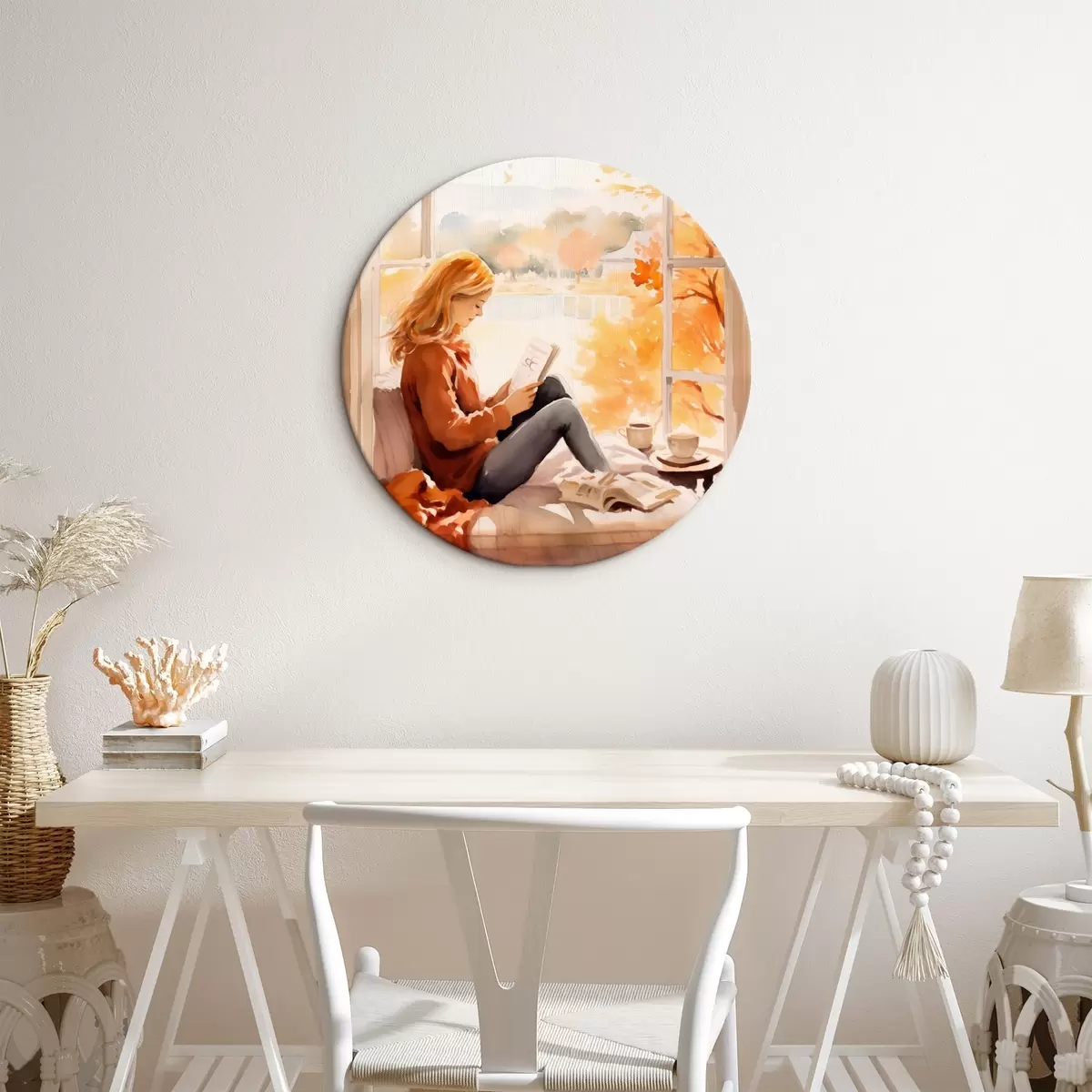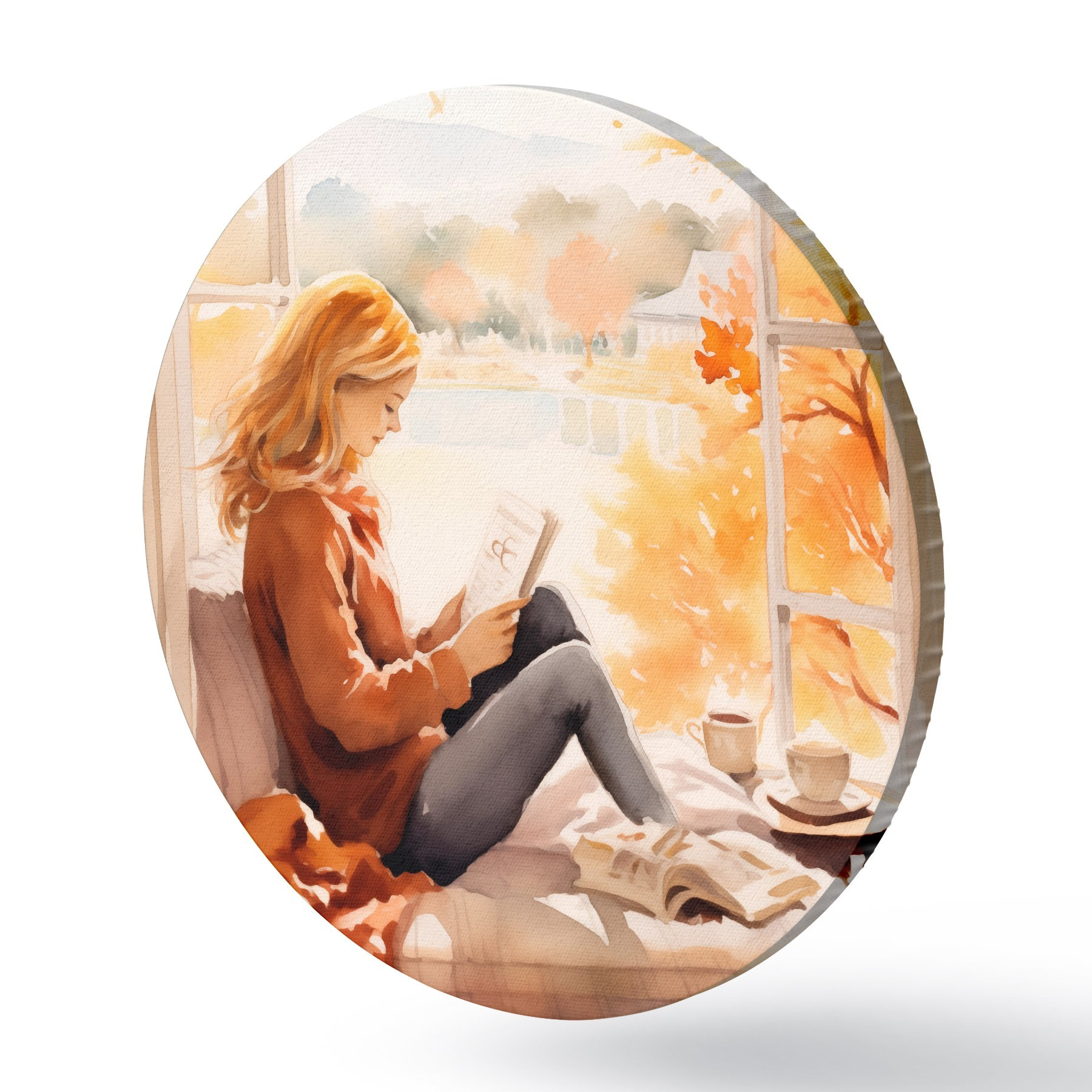 Apaļas gleznas Meitene lasa grāmatu pie atvērtā loga rudens ainavā, ar gaišiem kokiem fonā un tējas tasi blakus. r42572