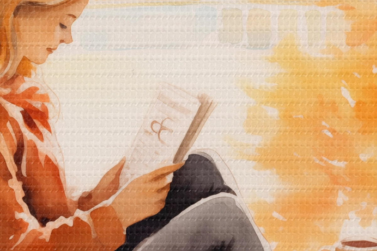 Attēls Meitene lasa grāmatu pie atvērtā loga rudens ainavā, ar gaišiem kokiem fonā un tējas tasi blakus. Nr r42572