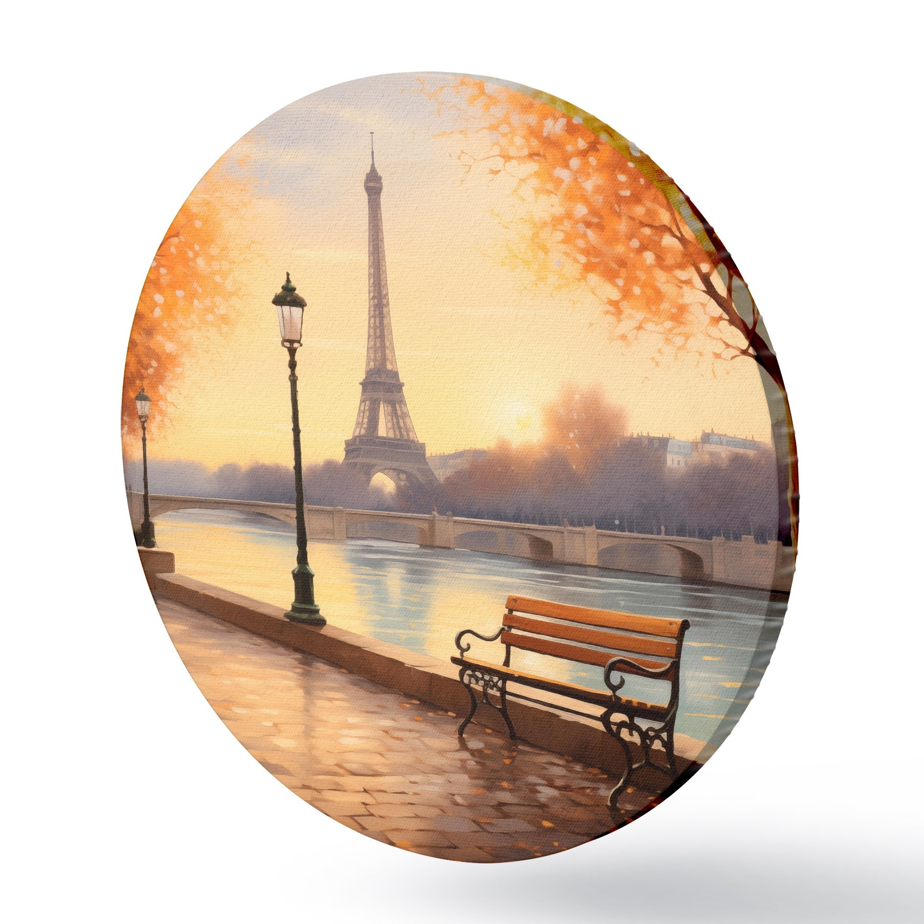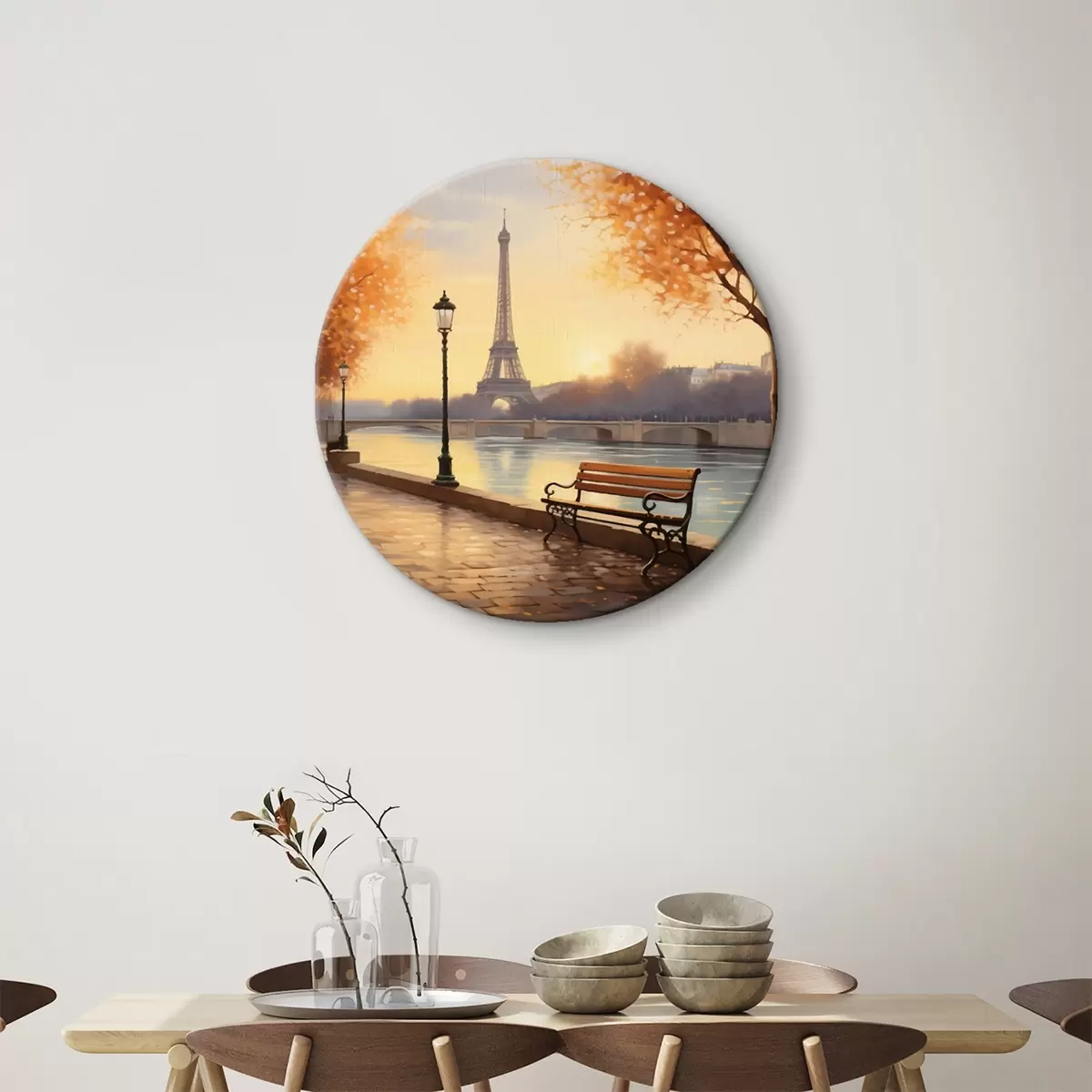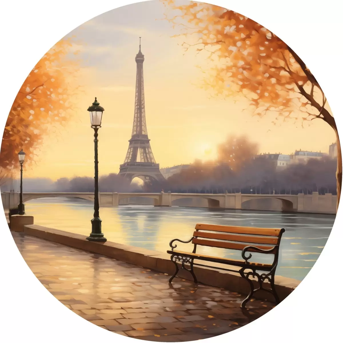 Apaļas gleznas Rudens Parīzē ar skatu uz Eifeļa torni, ar lapām klātu Sēvas krastmalu, soliņiem un ielu laternām, kas piešķir romantisku atmosfēru. r42577