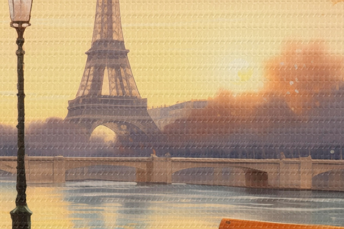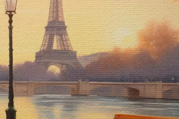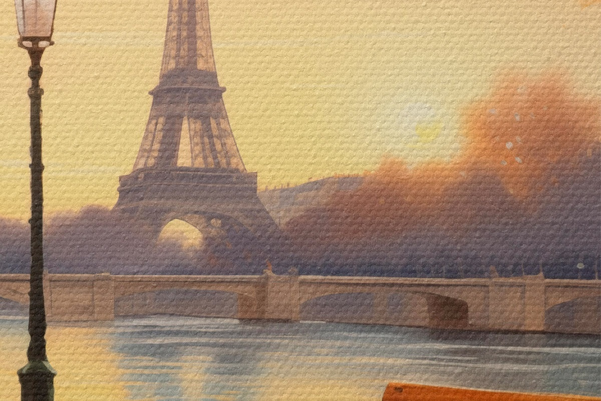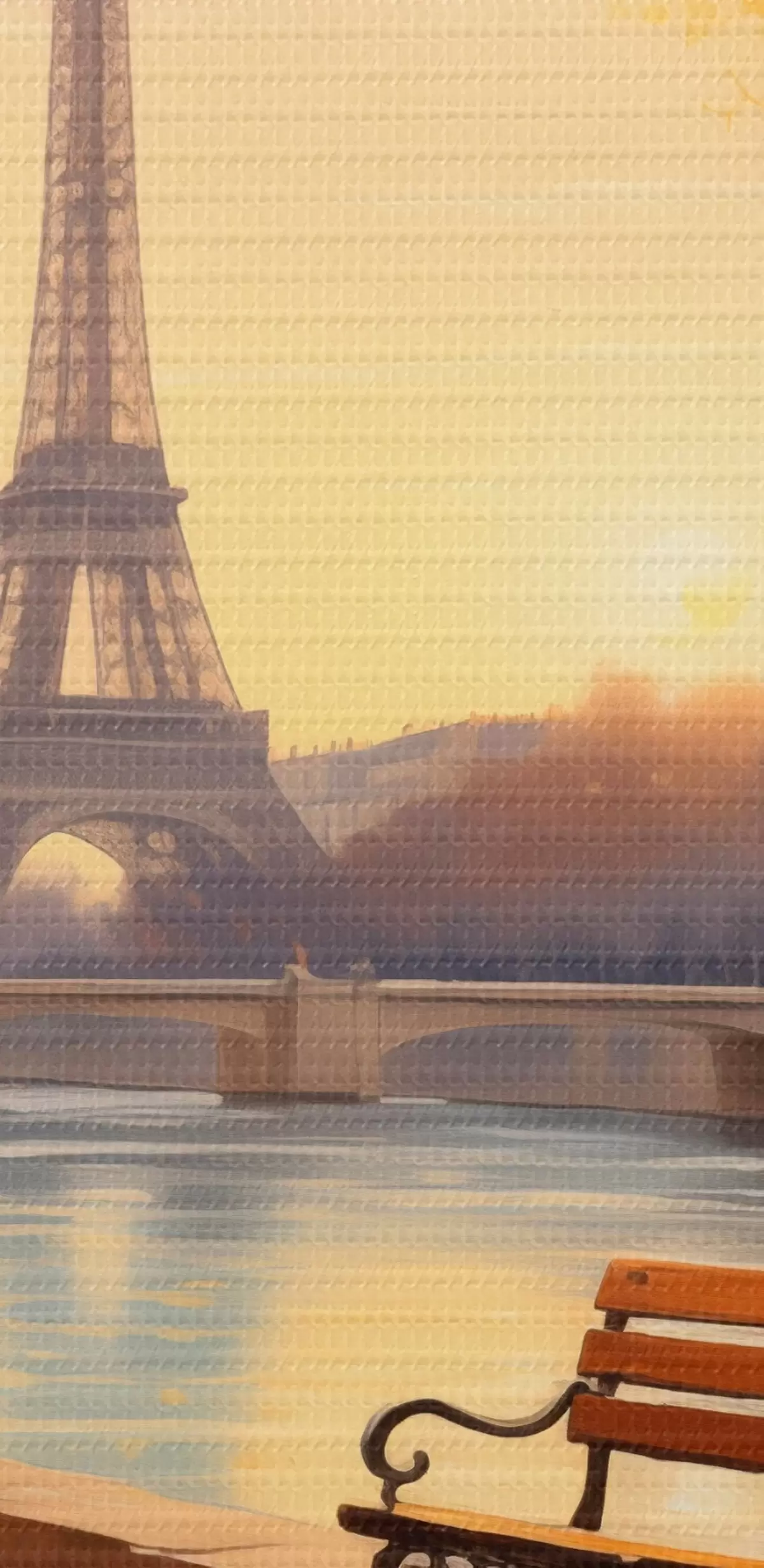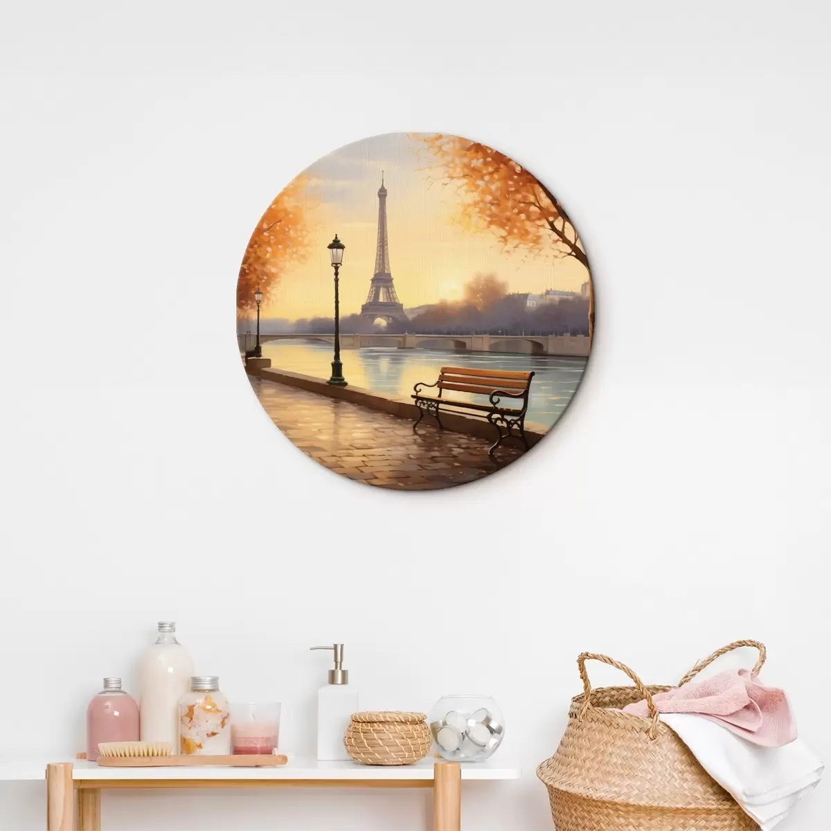 Apaļas gleznas Rudens Parīzē ar skatu uz Eifeļa torni, ar lapām klātu Sēvas krastmalu, soliņiem un ielu laternām, kas piešķir romantisku atmosfēru. r42577