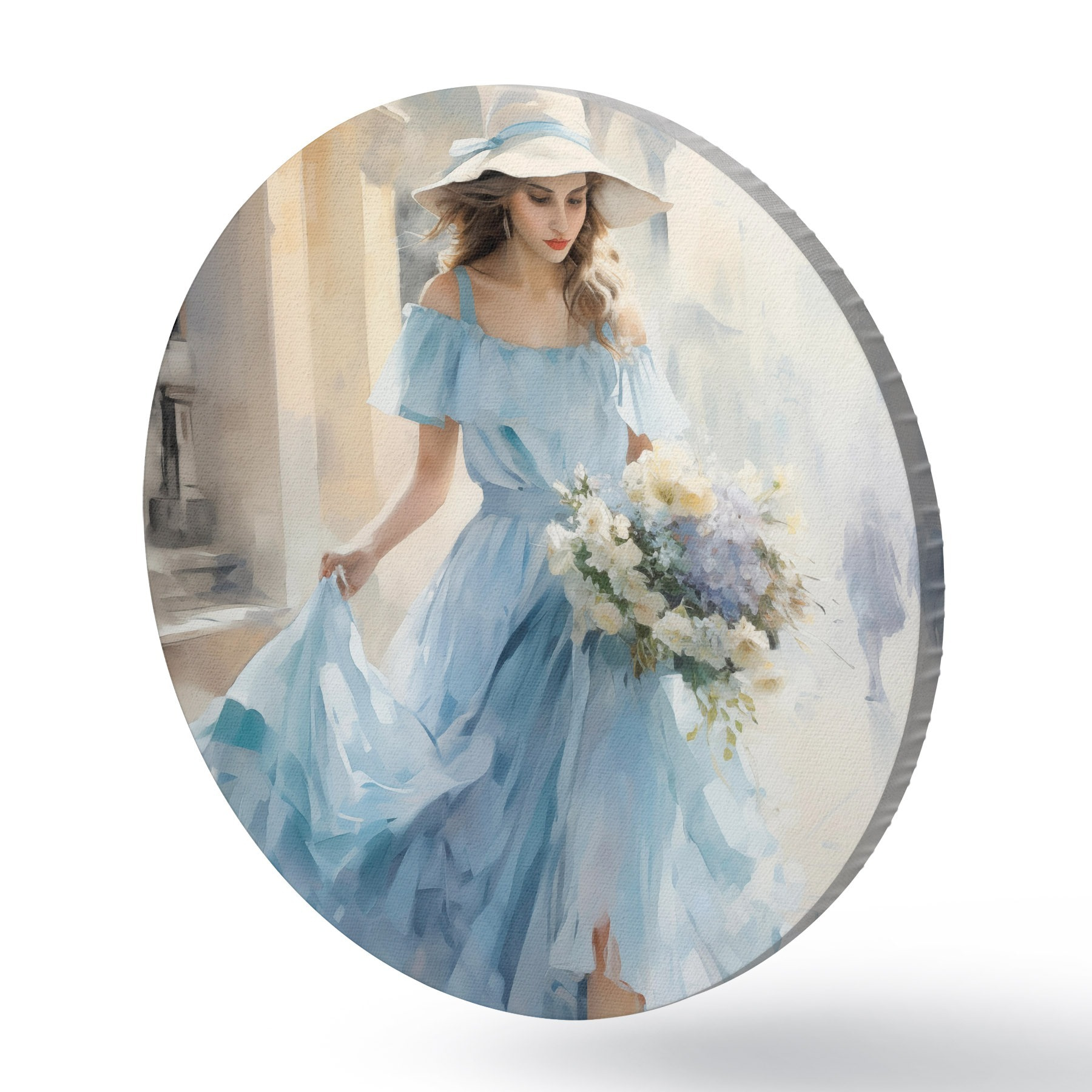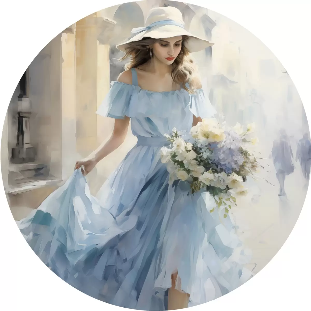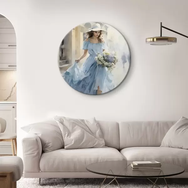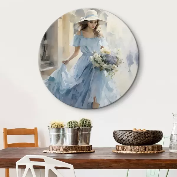 Apaļas gleznas Eleganta meitene gaiši zilā kleitā un cepurē pastaigājas pa pilsētu, rokās turot ziedu pušķi, vieglā un romantiskā noskaņojumā. r42580