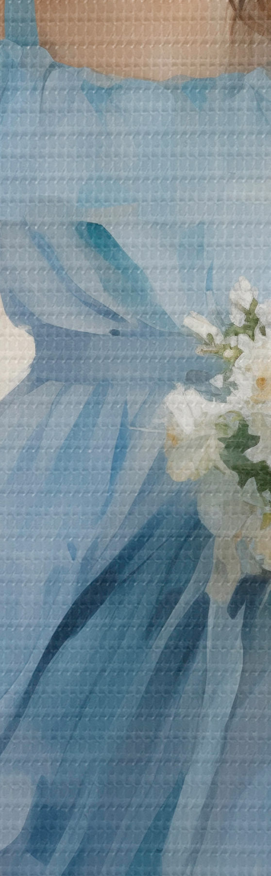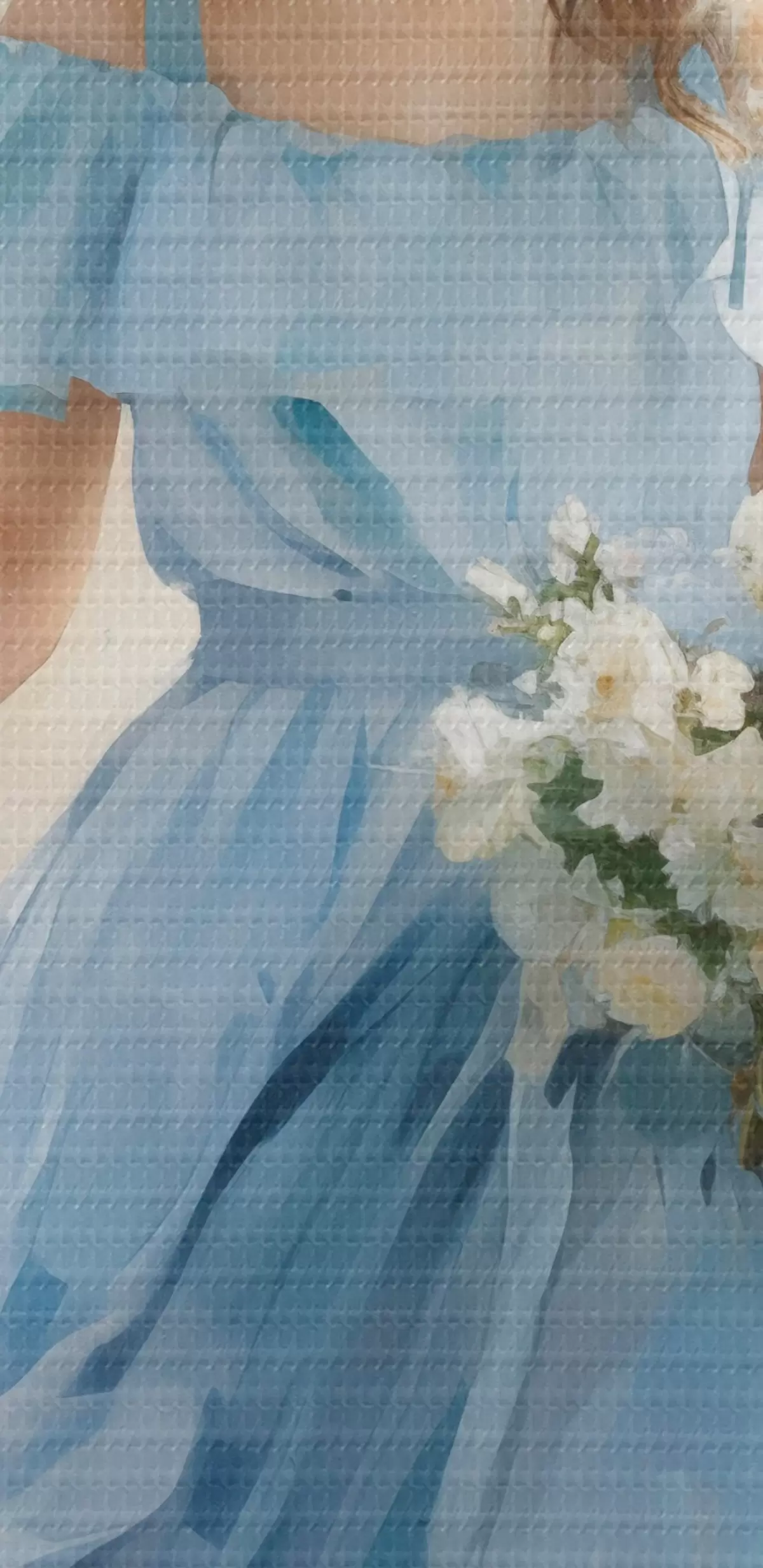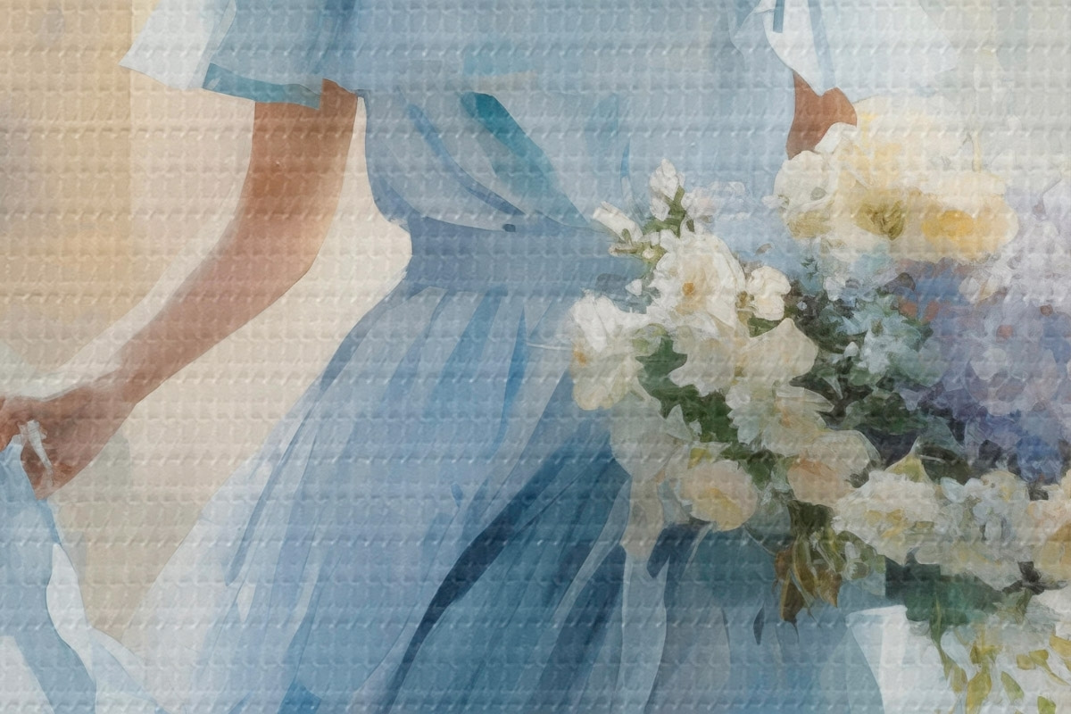 Apaļas gleznas Eleganta meitene gaiši zilā kleitā un cepurē pastaigājas pa pilsētu, rokās turot ziedu pušķi, vieglā un romantiskā noskaņojumā. r42580