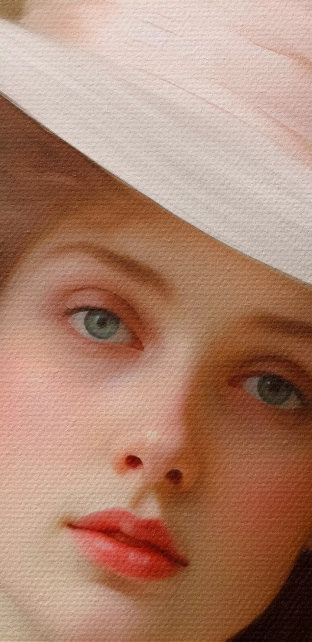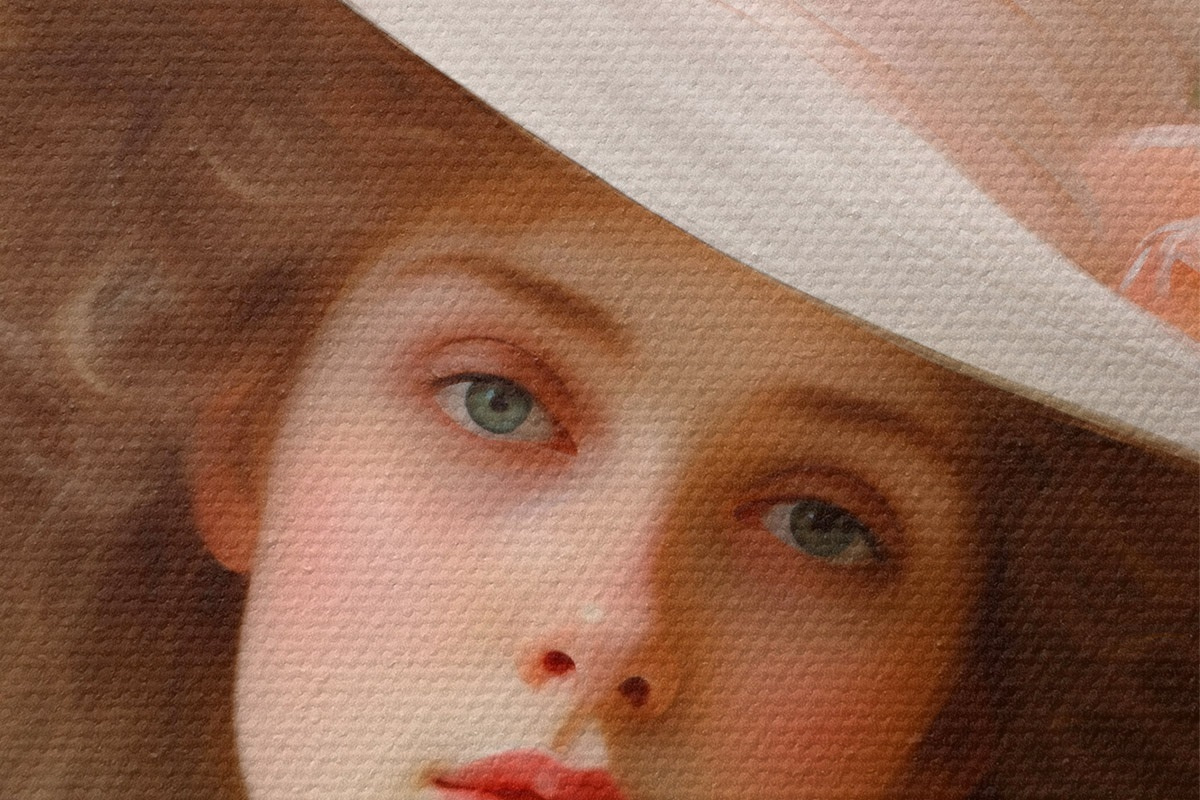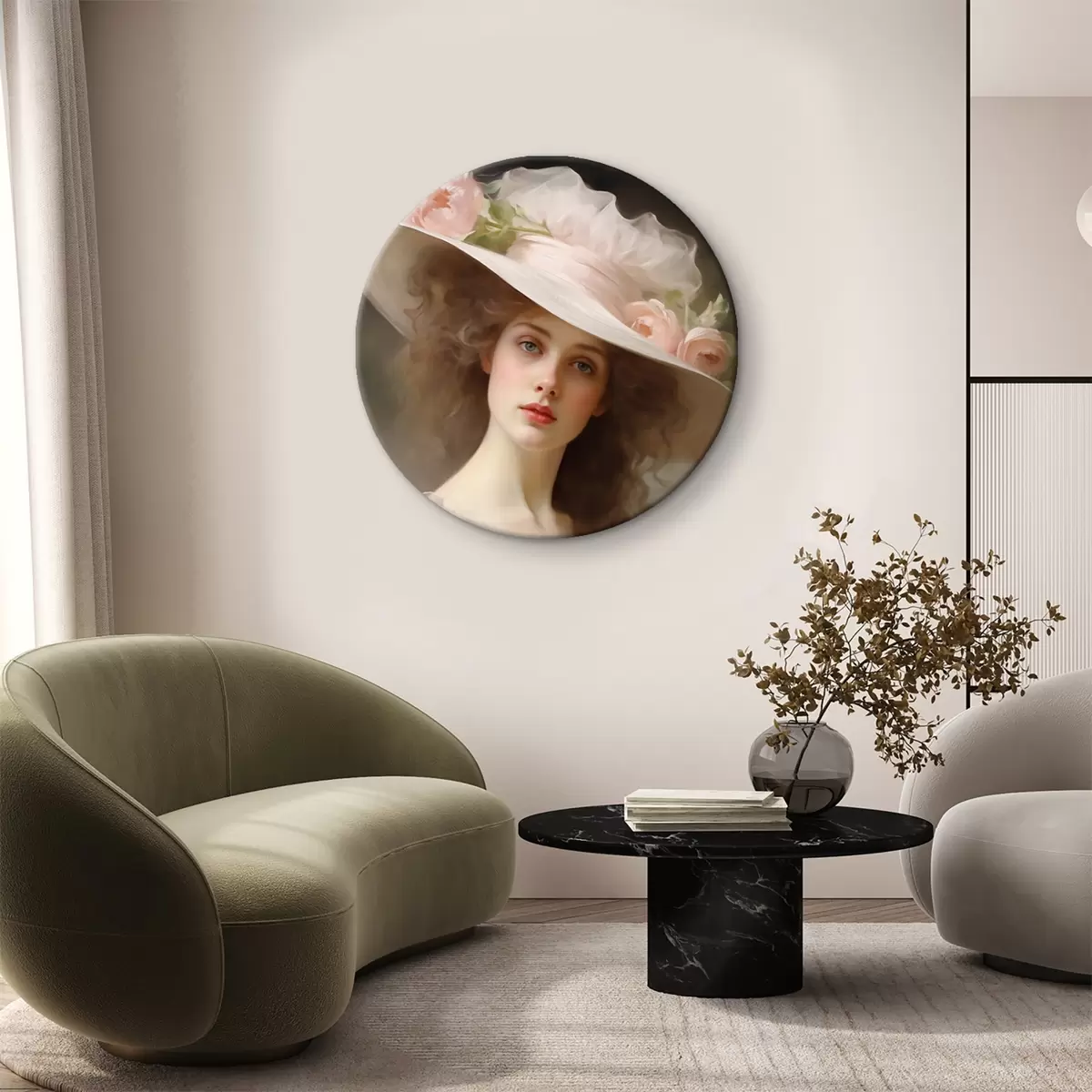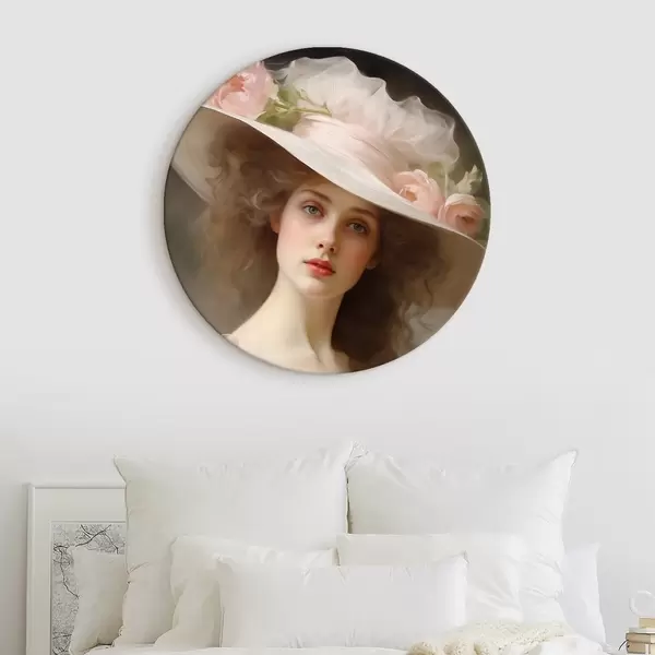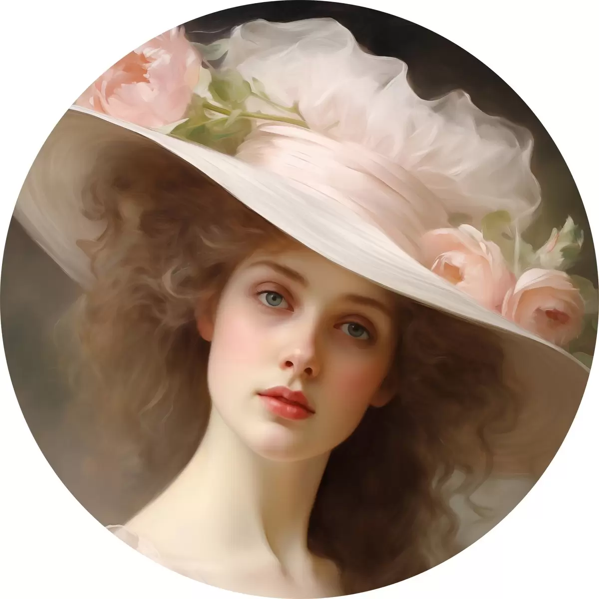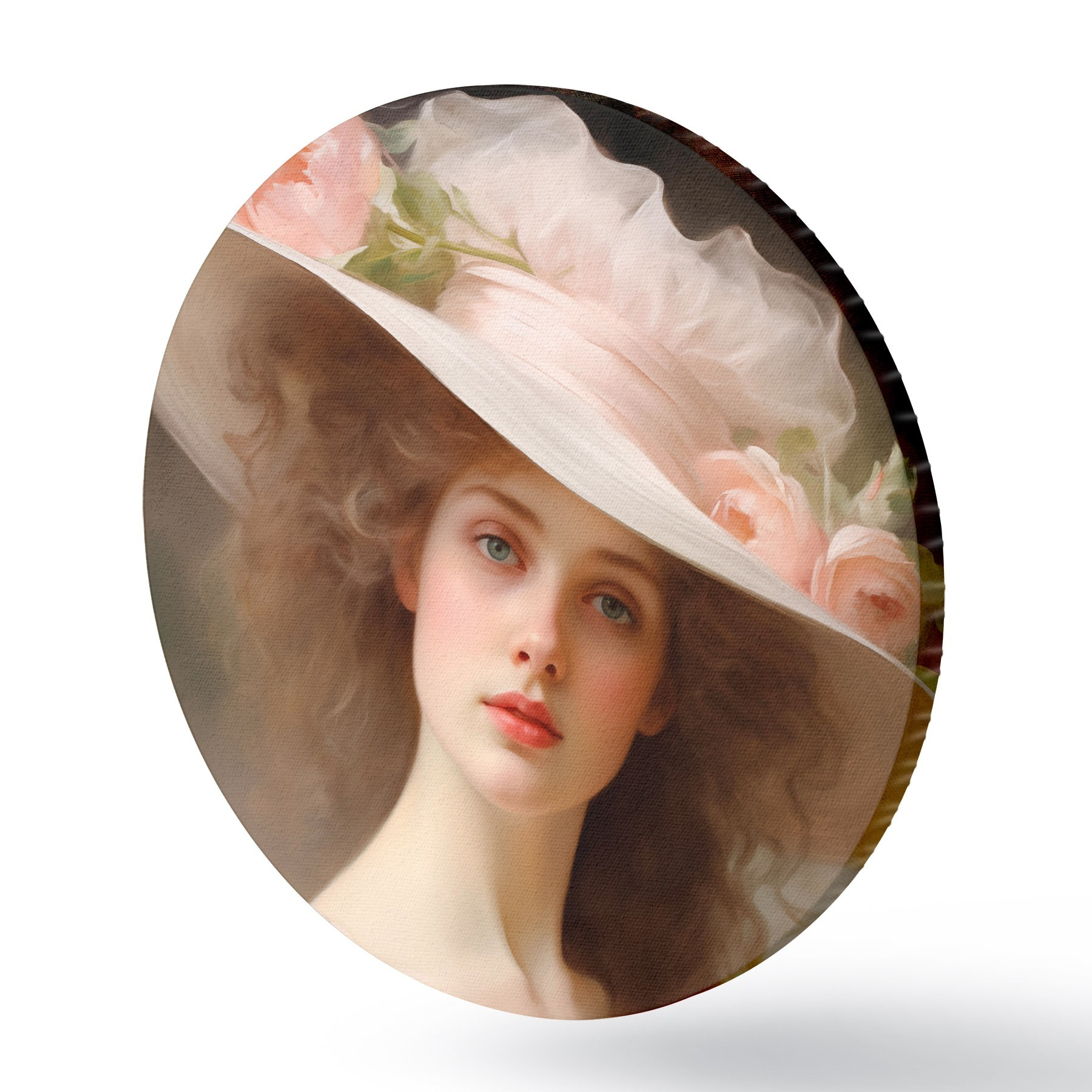 Apaļas gleznas Jaunas sievietes portrets ar romantisku un izsmalcinātu sejas izteiksmi maigi rozā kleitā un ziedu rotātā cepurē. r42581